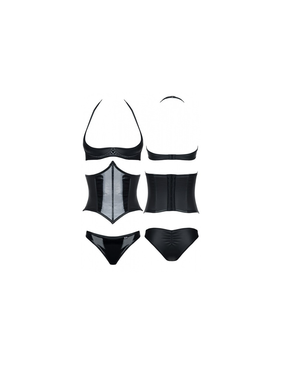 W komplecie:BiustonoszGorset z usztywnioną konstrukcjąPantyAtrakcyjny komplet, obejmujący biustonosz, gorset i panty wykonane z błyszczącego materiału oraz eko-skóry. Ciekawa i spójna wizualnie propozycja.Gorset posada fiszbiny, które go usztywniają i powodują, że wygląda efektownie, nie marszczy się podczas użytkowania oraz jest wygodny. Z tyłu pionowe zapięcie na haftki z możliwością regulacji. Materiał jest elastyczny i miły w dotyku.Biustonosz przykuwa uwagę nagimi piersiami, których kształt został spektakularnie „wyrysowany” czarną, błyszczącą lakierowaną tasiemką. Specjalna konstrukcja pod biustem pozwala efektownie wyeksponować piersi i nadaje im bardziej okrągłego kształtu.Komplet wykonany w całości z eko-skóry i materiału PVC, które są miłe w dotyku i elastyczne. Łatwy do dopasowania i pięknie podkreślający kształt ciała.Cechy charakterystyczne: 1. Wzmacniające przeszycia w newralgicznych miejscach 2. Metalowe elementy bez chromu i niklu 3. Materiał elastyczny i sprężysty 4. Materiał miły w dotyku 5. Gorset - fiszbiny wzmacniające konstrukcję 6. Gorset - kilkustopniowe zapięcie z tyłu 7. Biustonosz o usztywnionej konstrukcji 8. Biustonosz z kilkustopniowym zapięciemKolor bielizny: czarnyDostępne rozmiary bielizny: S,M,L,XL,XXLSkład bielizna: PVC: 100% polyester // ekoskóra: 95% polyester, 5% elastan