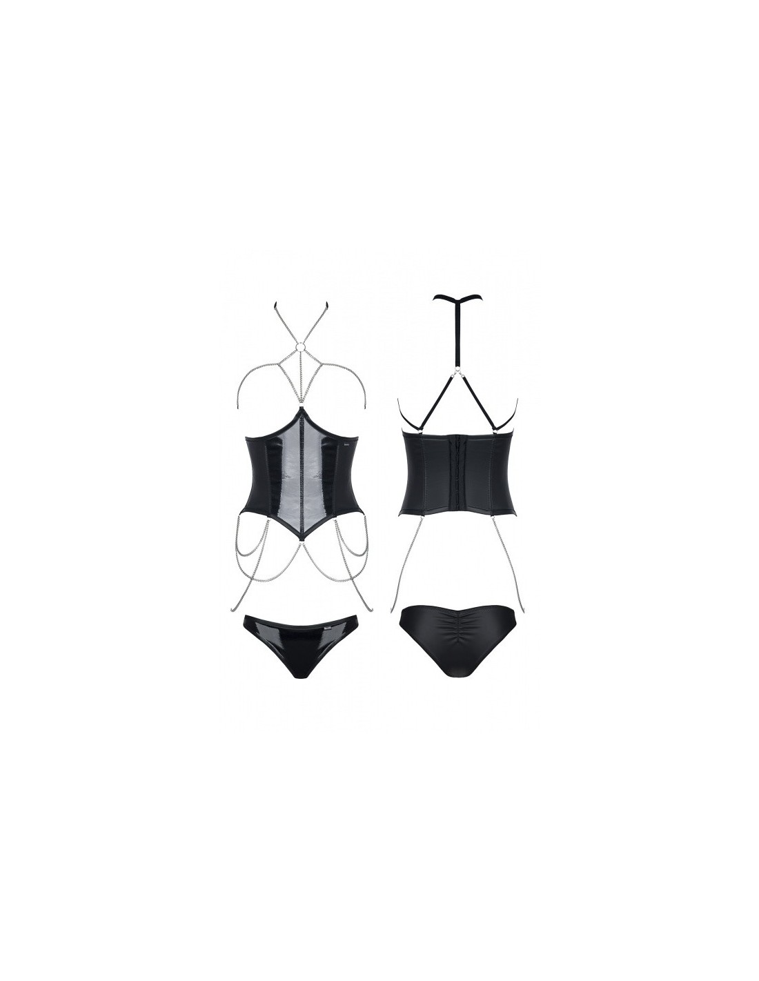 Nikoletta Black M to kompletny zestaw bielizny erotycznej, który zapewni Ci niezapomniane doznania i wyjątkowe przeżycia. Gorset wykonany z błyszczącego materiału i eko-skóry w połączeniu ze srebrnymi, metalowymi łańcuszkami tworzy kompozycję, która przyciąga uwagę i podkreśla wygląd Twoich nagich piersi. Finezyjne wzmacnienia w newralgicznych miejscach oraz elastyczny i sprężysty materiał zapewniają nie tylko doskonałe dopasowanie, ale także wygodę noszenia przez długi czas.
