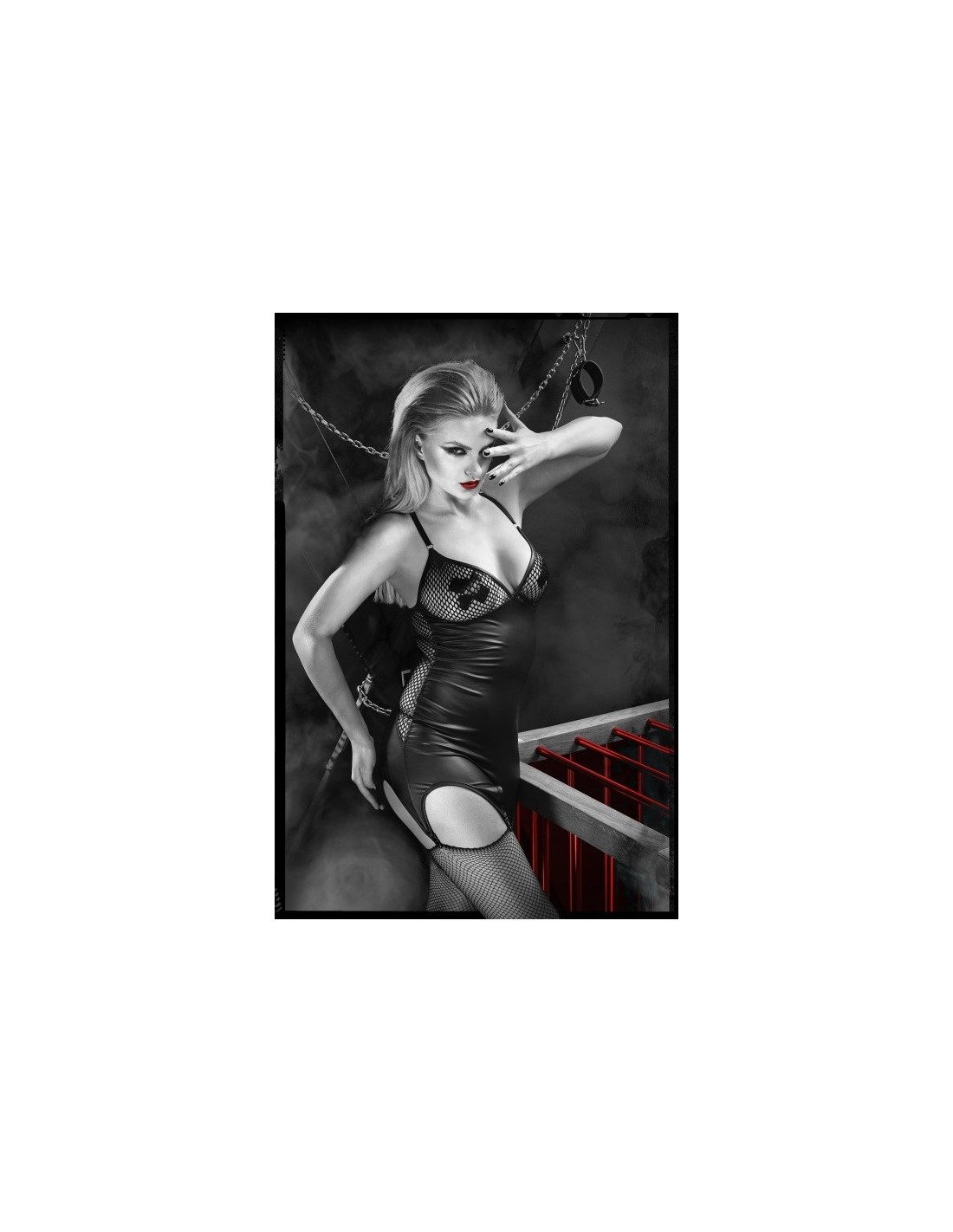 Sukienka finezyjnie podkreślająca sylwetkę. Siateczka ukazuje nagie partie ciała, a czarna, elastyczna ekoskóra seksownie uwydatnia krągłości bioder i pośladków. Z przodu widoczny pod siateczką kształt nagich piersi, z tyłu uwagę przyciąga wycięcie na plecach w kształcie łezki, ukazujące nagie plecy. U dołu 6 zapinek do przypinania pończoch. Dodatkowo dół sukienki skrócony, aby seksownie ukazywał cześć nagich pośladków.Cechy szczególne:Regulowane długości ramiączek – srebrne, metalowe wytrzymałe regulatorySrebrne kółka przy ramiączkach – trwałe, atrakcyjneSześć wygodnych w użyciu zapinek do przypinania pończochWzmacniające przeszycia w miejscach wrażliwych na rozerwanieKolor bielizny: czarnyDostępne rozmiary bielizny: S,M,L,XL,XXLSkład bielizna: Siateczka: 100% polyester // ekoskóra: 95% polyester, 5% elastan