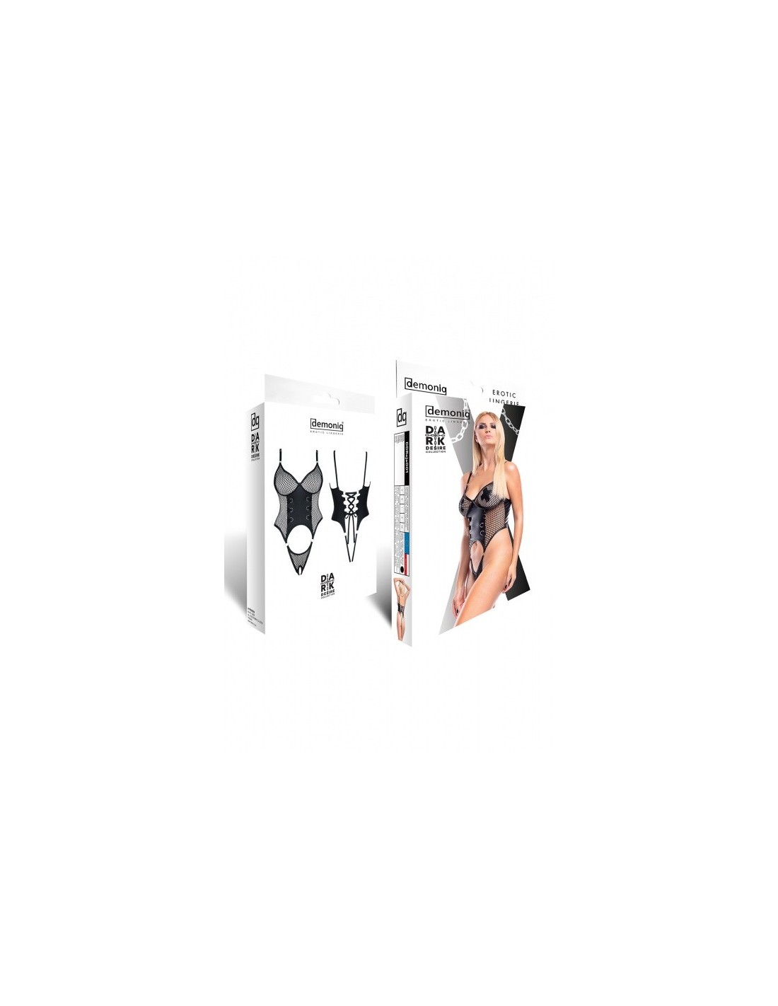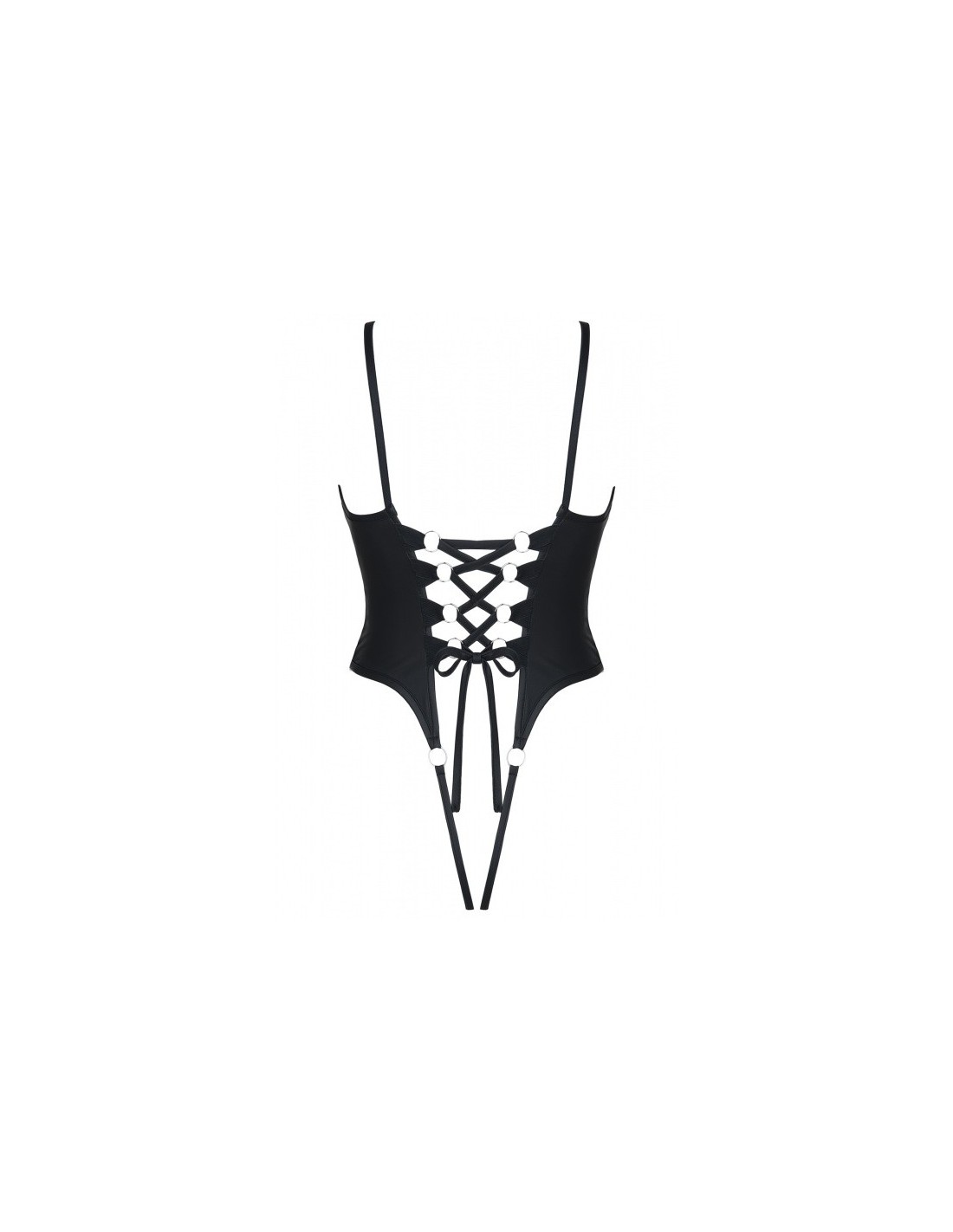 Efektowne i spektakularnie seksowne body. Z przodu uwagę przyciągają metalowe, srebrne kółeczka, oraz zmysłowy dekolt z miseczkami z czarnej siateczki. Miseczki z dołu są specjalnie usztywnione, dzięki czemu nadają piersiom piękny, pełny kształt. Z tyłu rewelacyjnie prezentują się plecy ozdobione efektownym sznurowaniem oraz apetycznie podkreślone czarnym materiałem biodra i pośladki. Otwarty dół zachęca do prowokacyjnych, niczym nie ograniczonych zabaw. Regulowane ramiączka oraz sznurowania z tyłu, umożliwiają dopasowanie i gwarantują wygodę. Cechy szczególne:Efektowne sznurownie z tyłuOtwarty dółElastyczne gumki przy metalowych kółeczkachRegulowane ramiączkaWzmacniające przeszycia w miejscach wrażliwych na rozerwanieKolor bielizny: czarnyDostępne rozmiary bielizny: S,M,L,XL,XXLSkład bielizna: siateczka: 100% polyester // ekoskóra: 95% polyester, 5% elastan