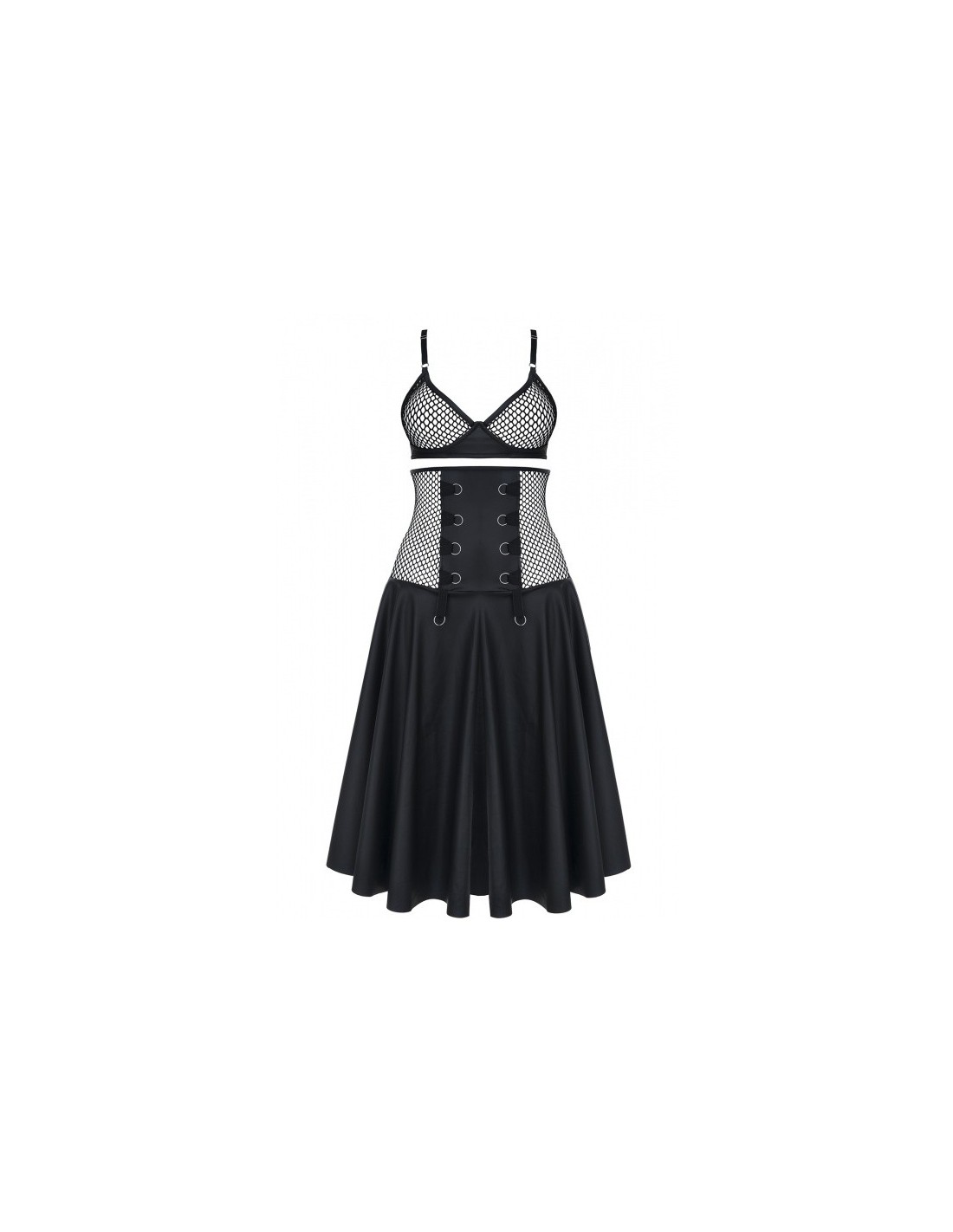 W komplecie:Biustonosz z usztywnianą miseczką2-u funkcyjna spódnica z ekspresem z tyłuKomplet obejmujący biustonosz i spódnicę. Biustonosz posiada usztywnianą konstrukcję, dzięki czemu efektownie prezentuje widoczne pod czarną siateczką piersi. Regulowane ramiączka i 2-u stopniowe zapięcie z tyłu ułatwiają dopasowanie.Spódnica z przodu wyróżnia się dużymi, metalowymi kółkami pięknie prezentującymi się na tle matowej czarni ekoskóry. Z tyły srebrny ekspres z ozdobnym suwakiem oraz pionowe wycięcie spódnicy – zachęcają do widowiskowych, wspólnych zabaw. Z przodu pod materiałem spódnicy są ukryte 2 czarne tasiemki, które można spiąć z kółeczkami, podnosząc przód spódnicy i ukazując nogi.Zdjęcia prezentują funkcję długiej i krótkiej wersji spódnicy. Cechy szczególne:Biustonosz z usztywnioną konstrukcją, regulowanymi ramiączkami i 2-u stopniowym zapięciem z tyłuSpódnica 2-u funkcyjna – długa lub po zapięciu pasków krótka z przoduWytrzymały zamek odporny na zrywanie i uszkodzeniaOzdobny suwak przy zamkuWzmacniające przeszycia w miejscach wrażliwych na rozerwanieKolor bielizny: czarnyDostępne rozmiary bielizny: S,M,L,XL,XXLSkład bielizna: siateczka: 100% polyester // ekoskóra: 95% polyester, 5% elastan