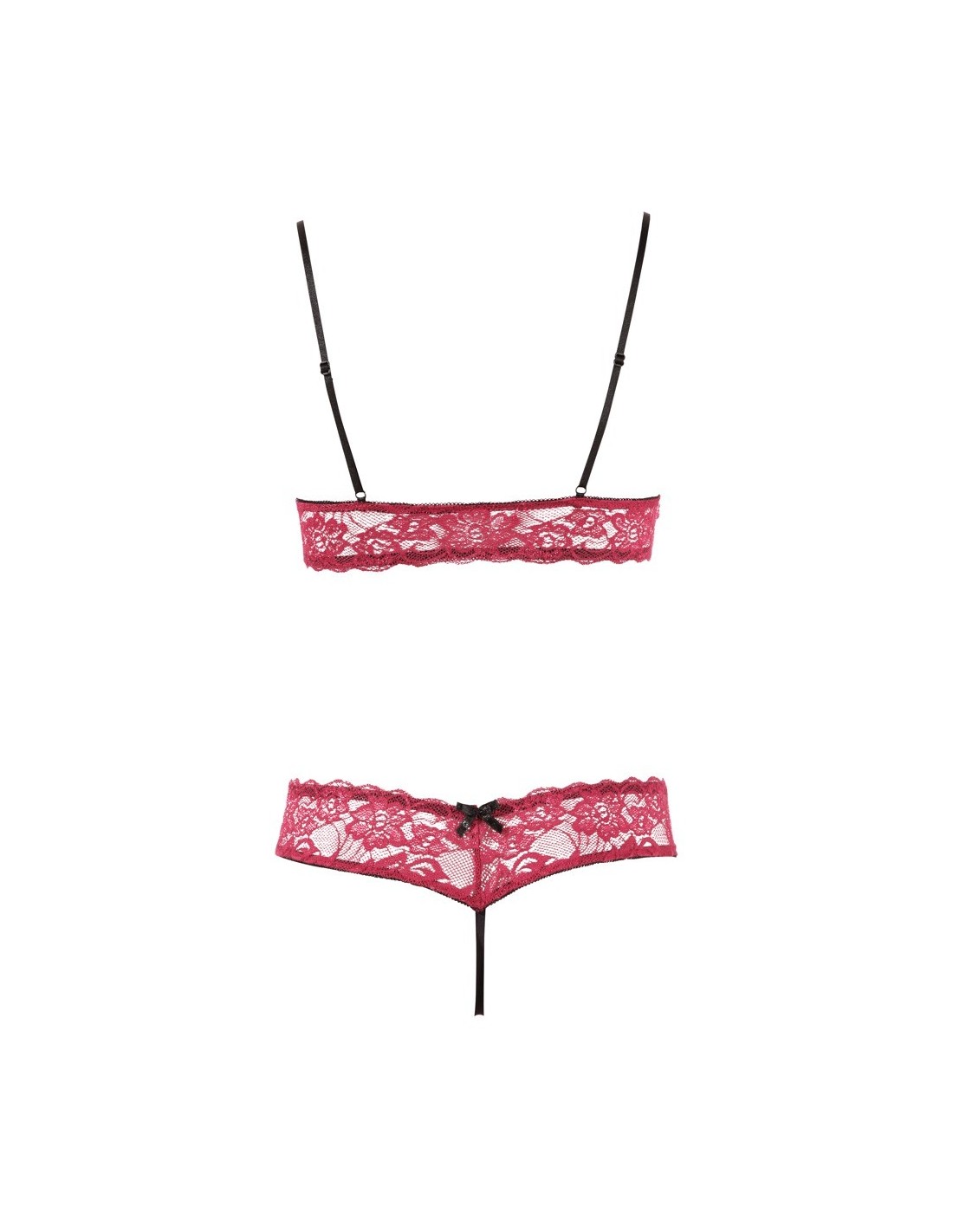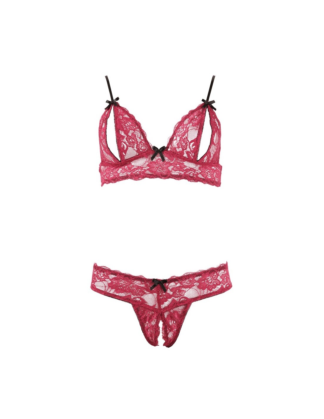 Nasz bezprzewodowy biustonosz z otwartymi miseczkami i czarnymi, regulowanymi ramiączkami podkreśli piękno Twojego dekoltu. Dodatkowo, komplet zawiera pasujący stringi z otwartym krokiem, które dodadzą Ci odrobinę pikantności. Całość ozdobiona jest czarnymi kokardkami, które nadają mu niezwykłego uroku.
