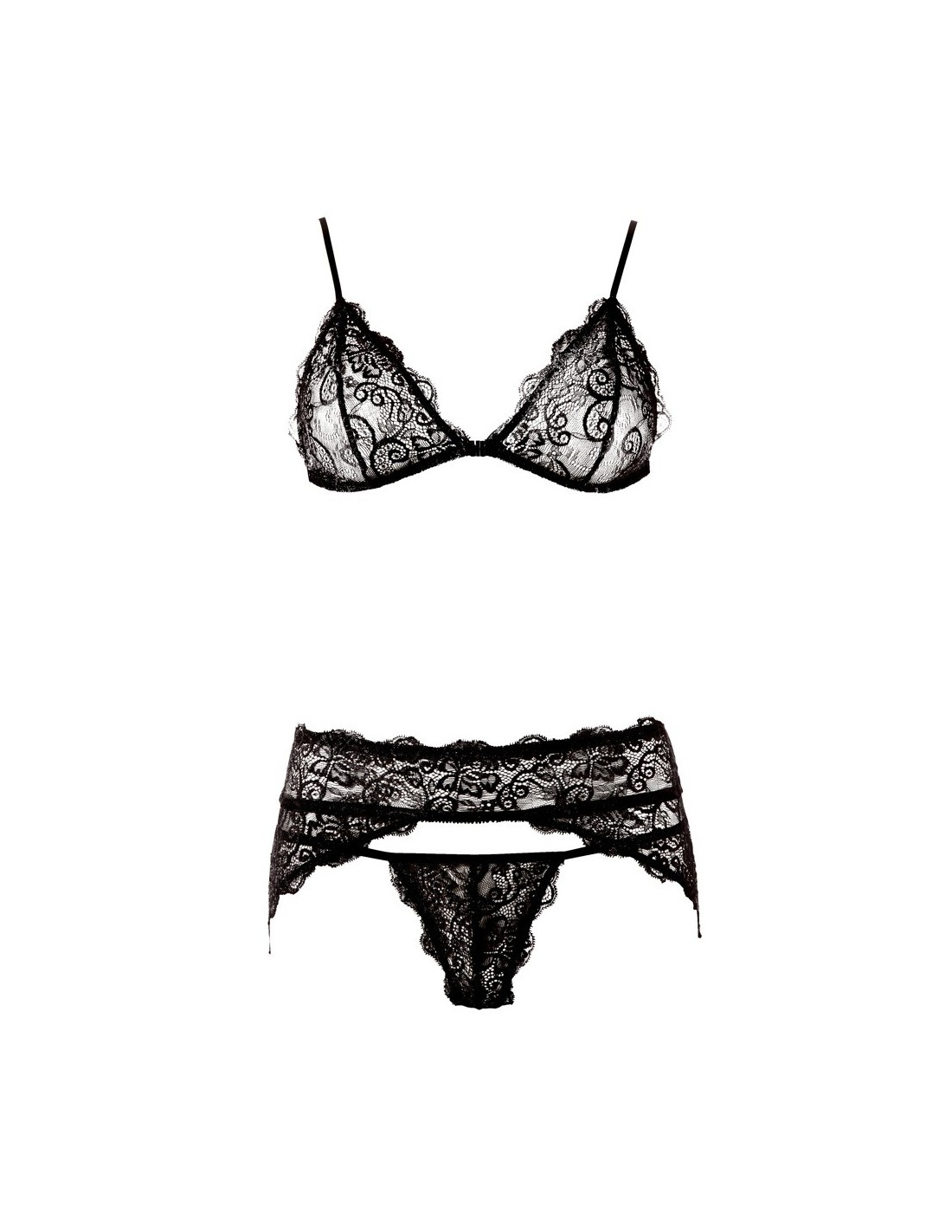 Ten komplet bielizny to połączenie luksusowego czarnego koronkowego materiału i perfekcyjnego kroju. Bezprzewodowy biustonosz z regulowanymi ramiączkami i zapięciem na przodzie zapewni Ci nie tylko wygodę, ale także podkreśli kształt Twojego biustu. Pas do pończoch z czterema regulowanymi paskami pozwoli Ci dodać jeszcze więcej seksapilu. W komplecie znajdziesz również pasujące stringi wykonane z koronki. Materiał składający się z 90% poliamidu i 10% elastanu zapewni Ci idealne dopasowanie i komfort noszenia.
