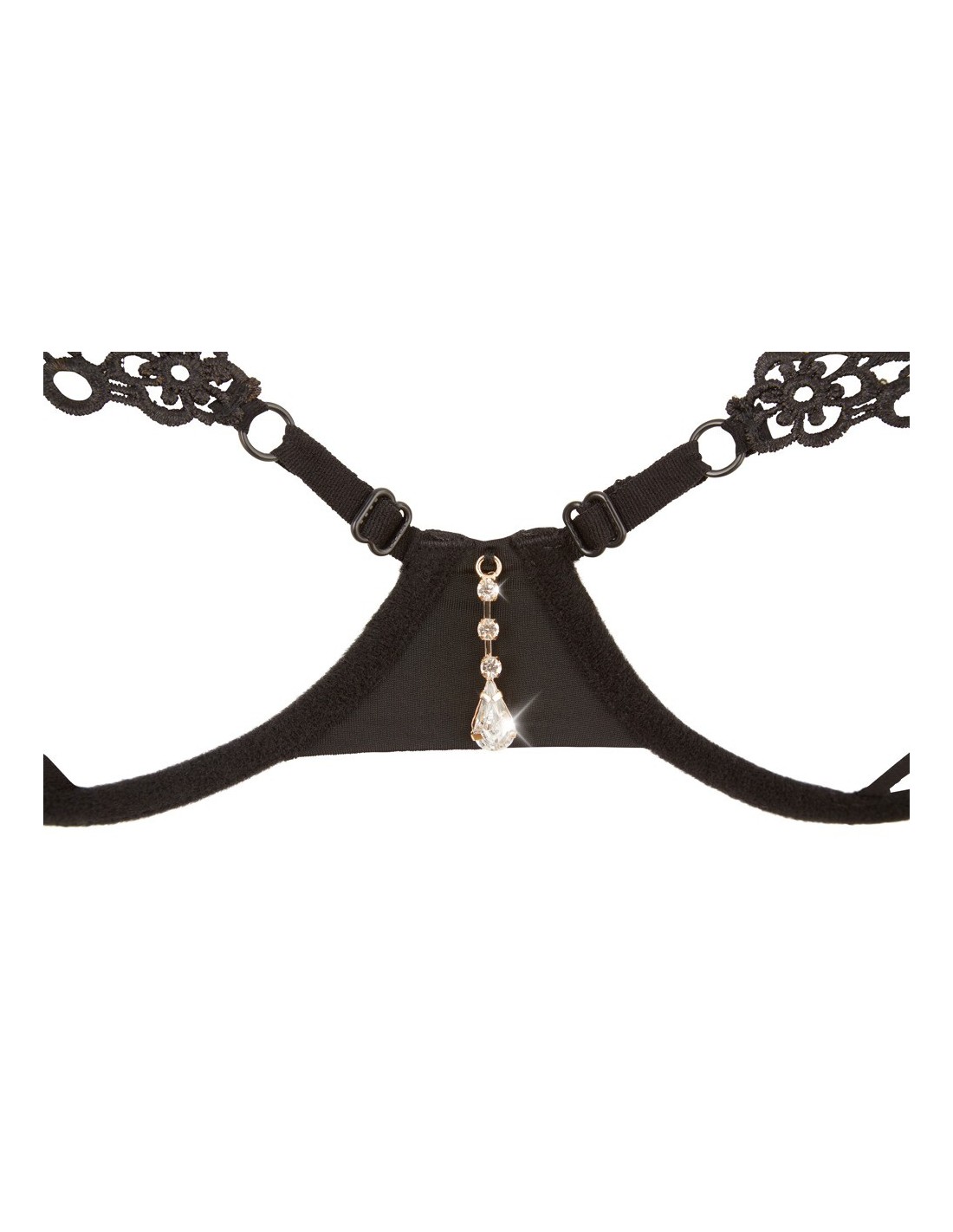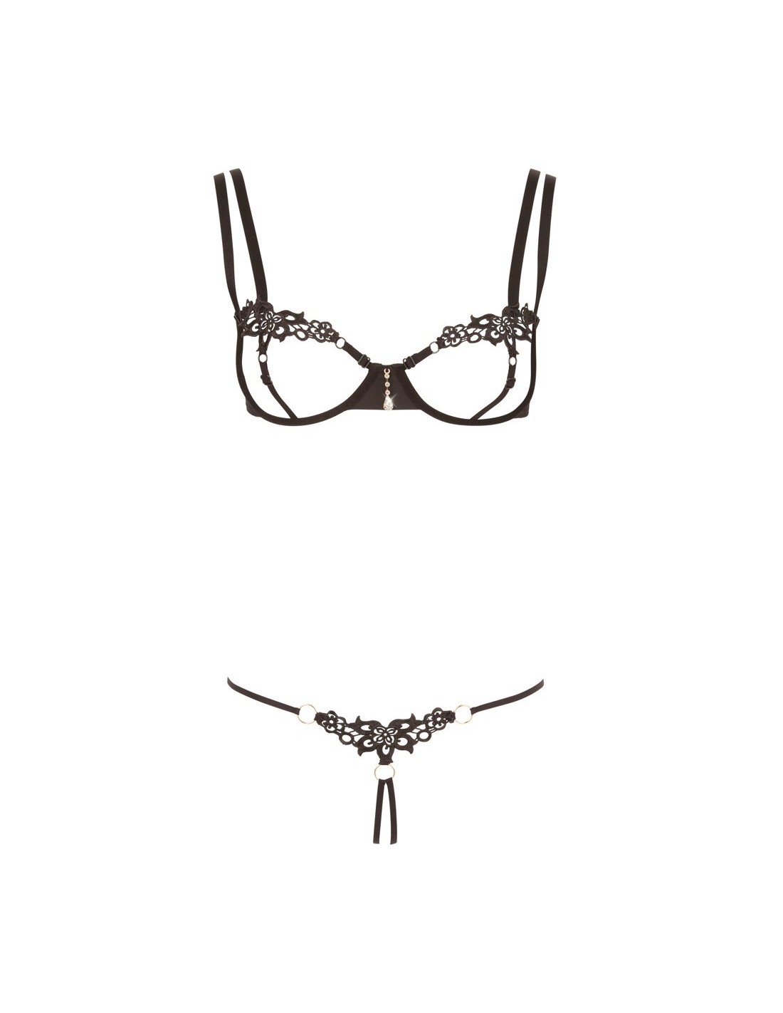 Nasza bielizna erotyczna to nie tylko wyjątkowy design, ale także zmysłowość w każdym detalu. Pasujący do biustonosza stringi są zaproszeniem do intymnej zabawy, dzięki otwartemu kroczu. Dodatkowo, na przodzie znajduje się piękna koronka, która jest połączona z paskami za pomocą trzech małych srebrnych pierścieni. Materiał główny wykonany jest z 95% poliestru i 5% elastanu, koronka z 100% poliestru, a stringi z 100% poliestru. Nasz produkt gwarantuje komfort noszenia i niezwykłą trwałość.