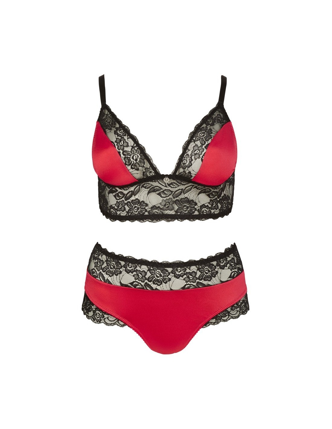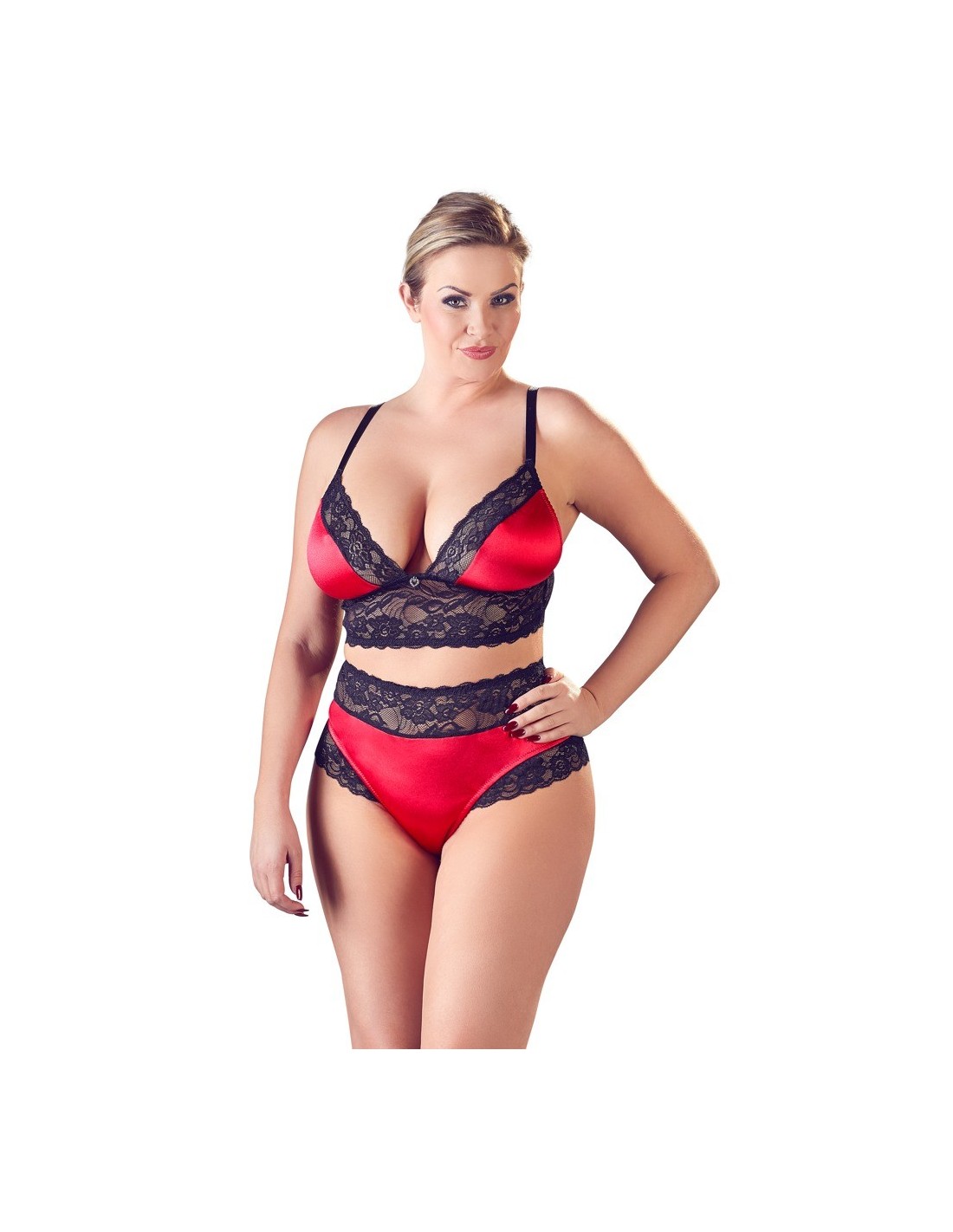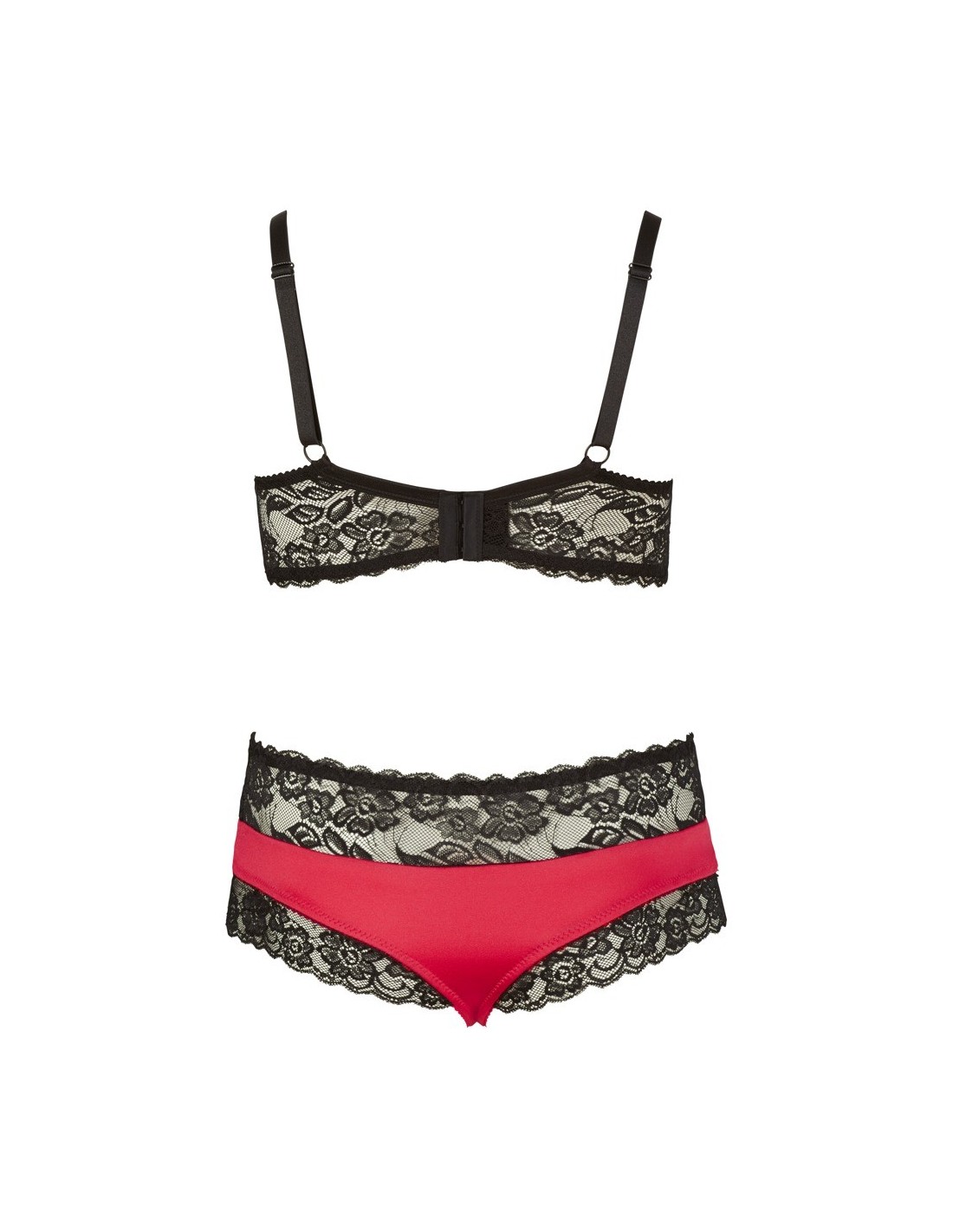 Ta delikatna biustonoszka posiada szerokie regulowane ramiączka, elastyczne czerwone miseczki z satyny oraz czarną koronkową ozdobę. Mały serduszko ze straszkami w okolicy dekoltu dodaje mu perfekcyjnego detalu. Pasujące do niej stringi o wysokim staniku wyróżniają się tym samym połączeniem materiałów i podkreślają kobiece krągłości swoim przylegającym krojem. Wykonane są z 90% poliamidu i 10% elastanu, co zapewnia komfort noszenia.