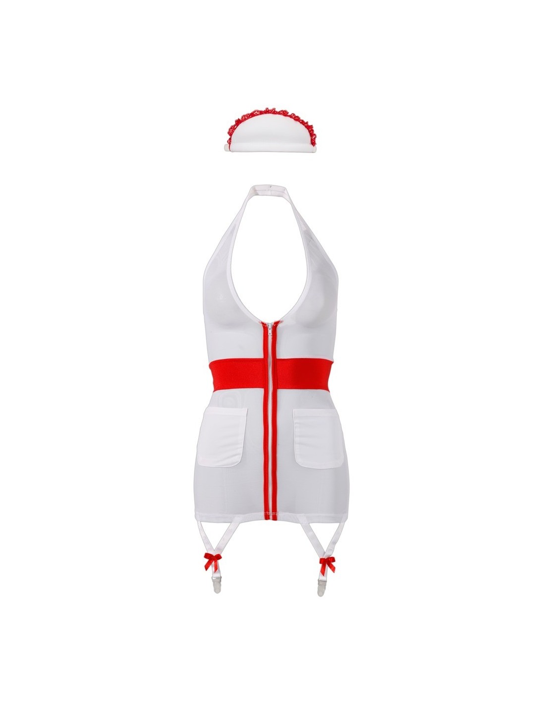 Ten kostium wykonany jest z białej siateczki powernet, która subtelnie eksponuje Twoje kształty. Czerwone wstawki w kształcie krzyża dodają mu jeszcze większej atrakcyjności. Długi zamek błyskawiczny na przodzie ułatwia zakładanie i zdejmowanie kostiumu, a drugi wstawka podkreśla talię, dodając Ci jeszcze więcej kobiecości. Praktyczne kieszonki z przodu pozwalają na przechowywanie różnych drobiazgów, a dwie regulowane szelki do pończochek i wiązany na szyi dekolt sprawiają, że widok z tyłu jest nieodparty. Dodatkowo, mała biała czapeczka pielęgniarki (w formie opaski) z czerwoną falbanką nadaje temu strojowi wyjątkowego charakteru.