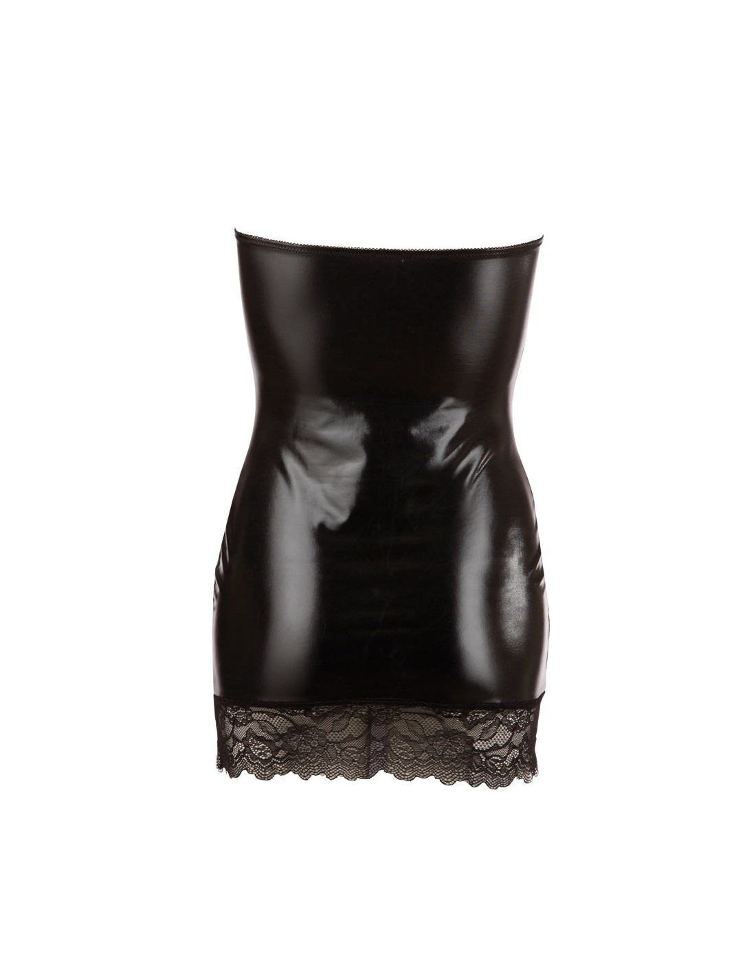 Wet look materiał i obcisły krój podkreślają Twoje piękno, jednocześnie dodając Ci pewności siebie. Koronka w okolicach dekoltu i na dole sukienki podkreśla Twoją kobiecość, dodając całości subtelności i romantyzmu.