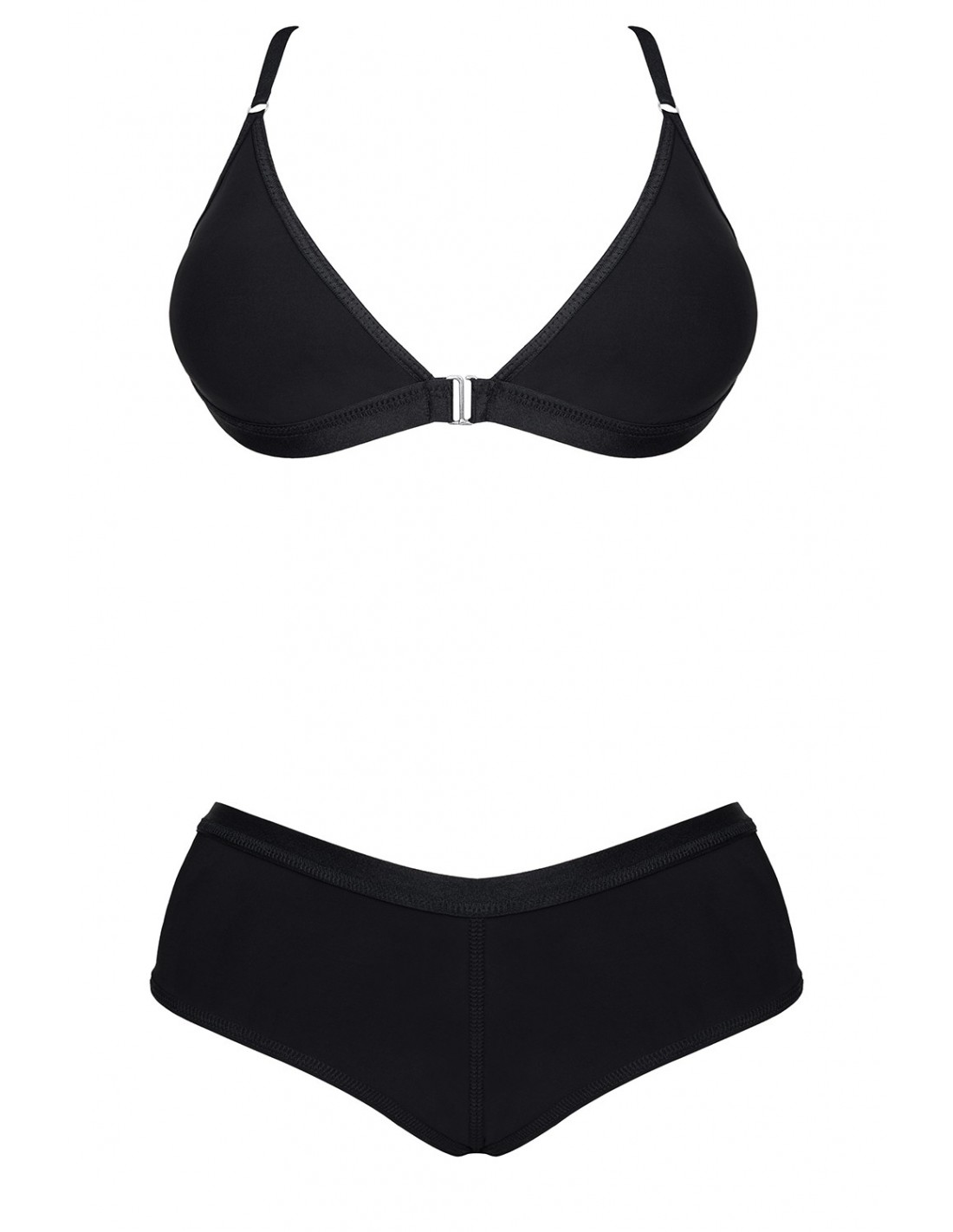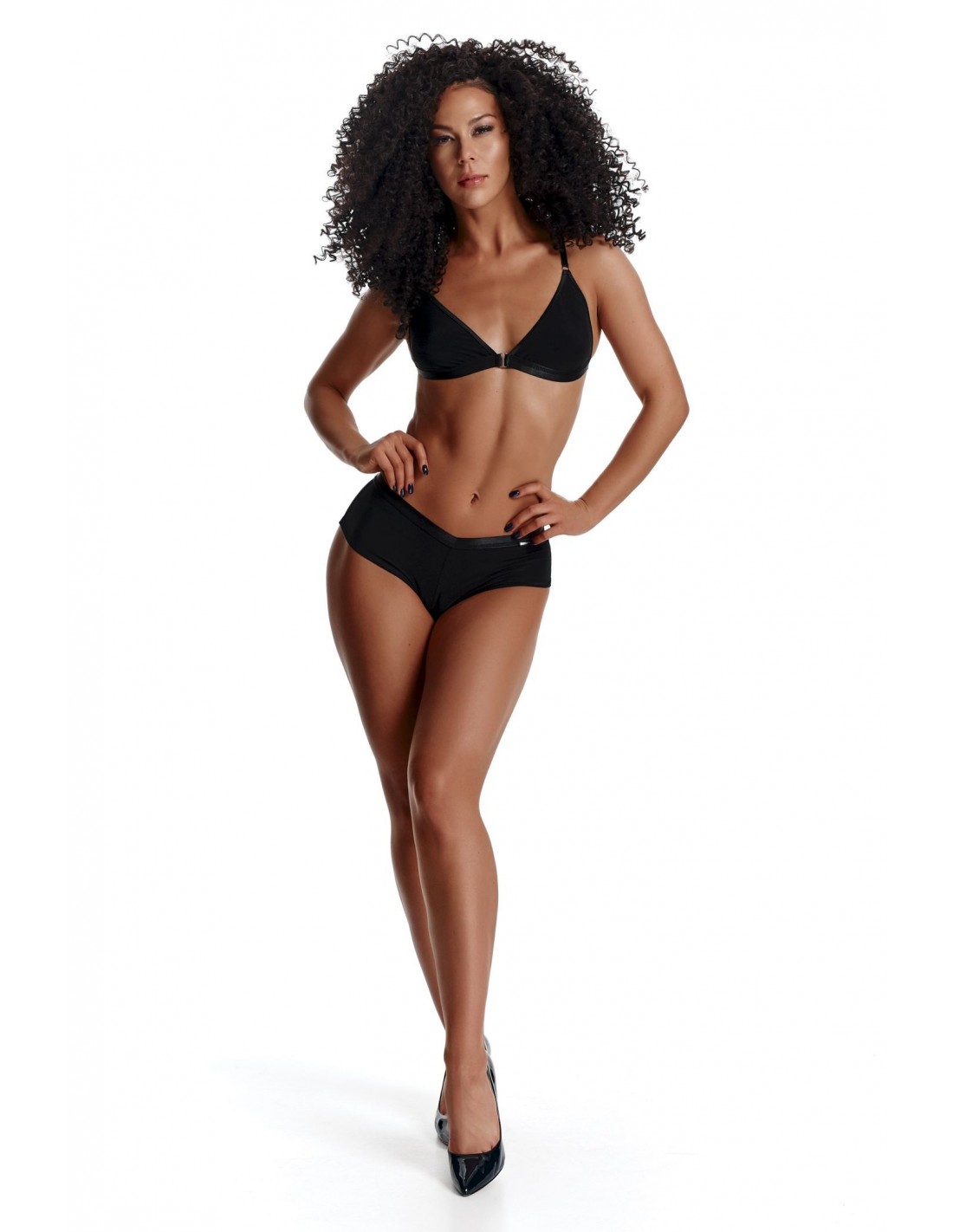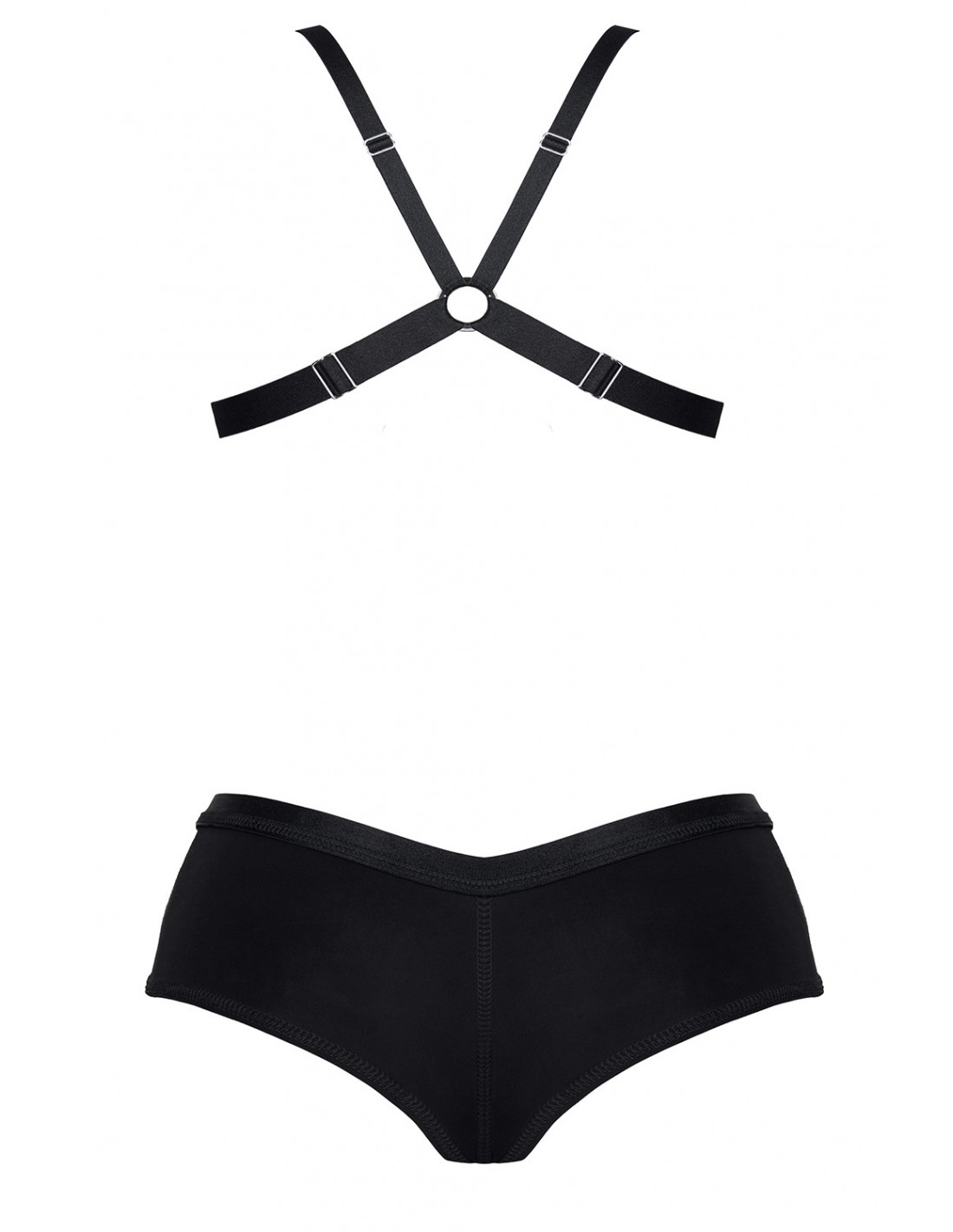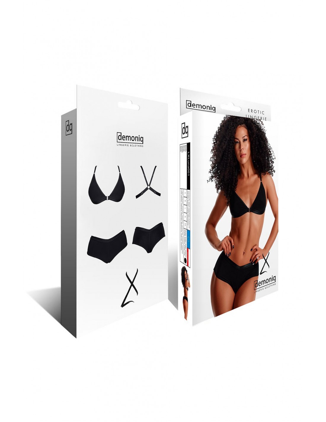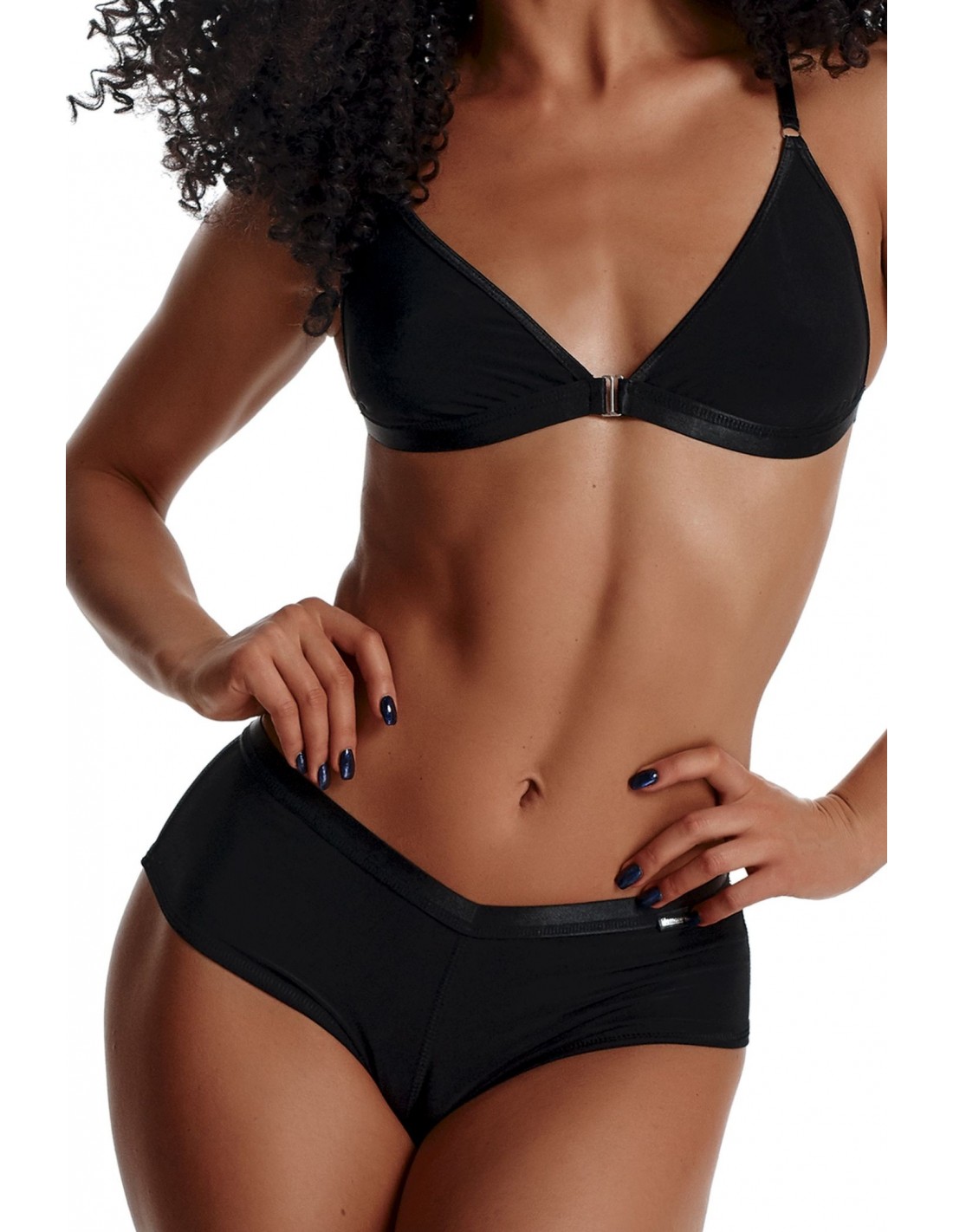 Biustonosz z przodu wyposażony jest w srebrne, metalowe, ozdobne zapięcie, które dodaje mu elegancji i wyjątkowego charakteru. Miseczki wykonane z czarnego, elastycznego materiału idealnie dopasowują się do Twojego ciała, podkreślając atuty Twojego biustu. Z tyłu kompozycja z gumek dodaje całości niebanalnego uroku i sprawia, że ten komplet jest niepowtarzalny.
