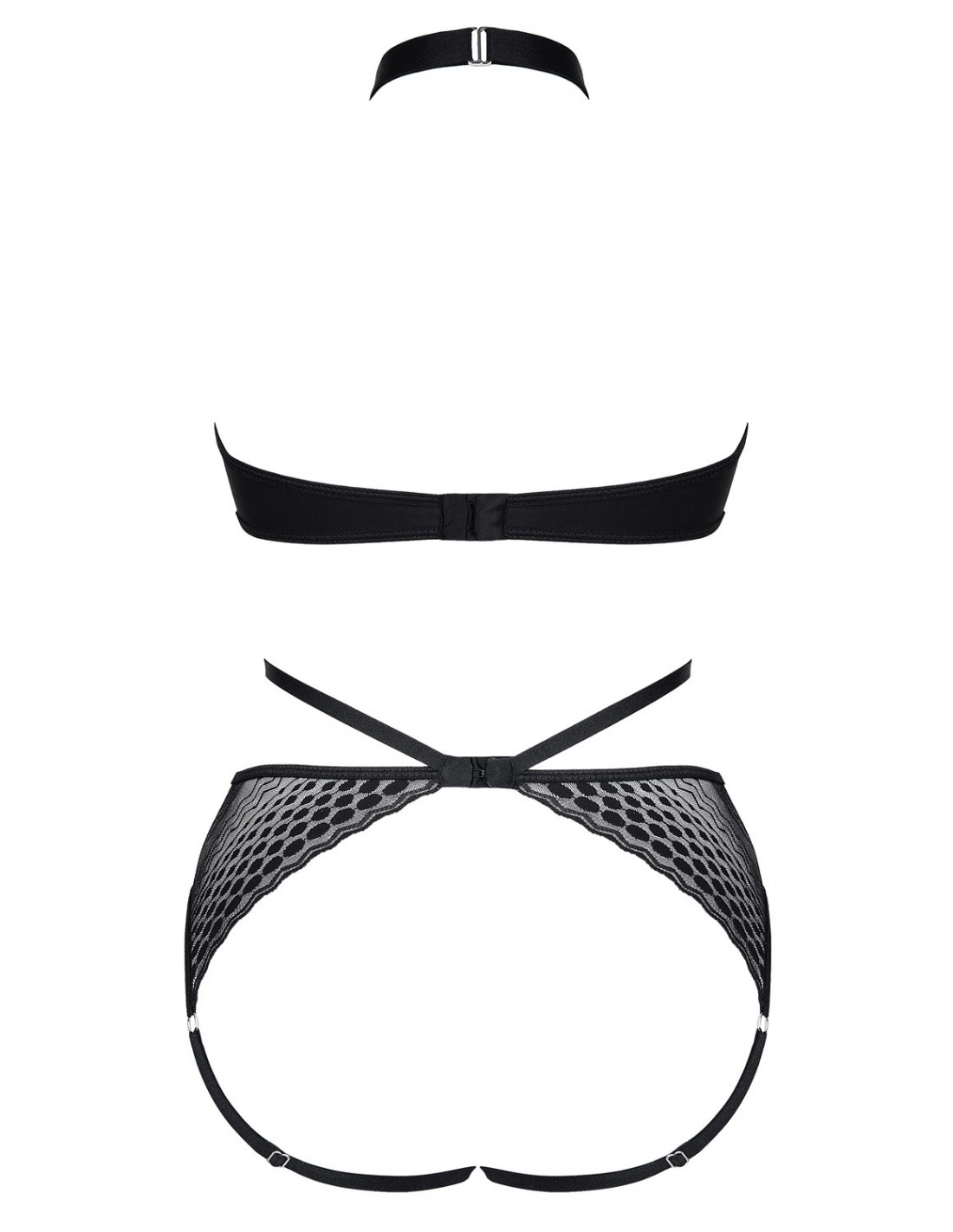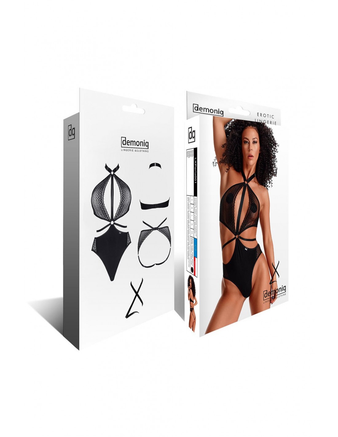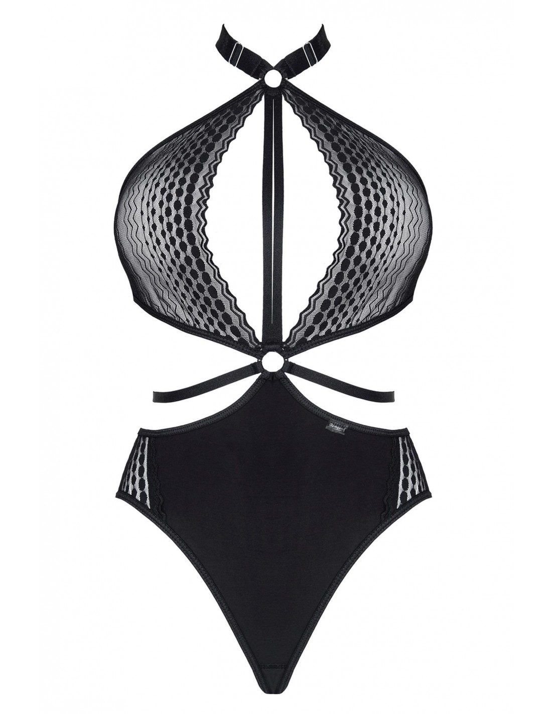 To body to prawdziwa poezja dla Twojego ciała. Z przodu znajdziesz przykuwającą uwagę kompozycję z czarnych gumek, połączonych ze srebrnymi, metalowymi kółkami i regulatorami, które dodają mu niepowtarzalnego charakteru. Dodatkowo, elastyczna koronka w geometryczne wzory podkreśla Twoją zmysłowość i dodaje Ci odrobinę tajemniczości.