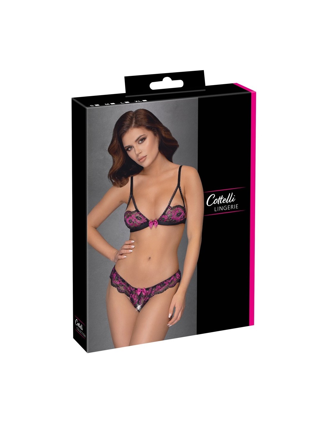 Zapomnij o nudnej bieliźnie i odkryj swoją wewnętrzną seksualność dzięki naszemu zestawowi Bra Set Open M. To połączenie delikatnej koronki w dwóch różnych kolorach i prowokującego designu. Bezprzewodowy biustonosz i figi z otwartym krokiem wykonane z miękkiej i elastycznej koronki zapewnią Ci niezapomnianą wygodę i zmysłowy wygląd.