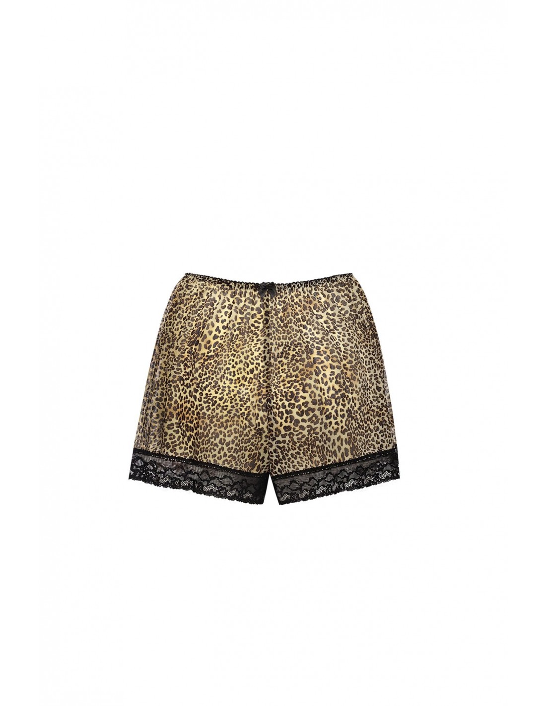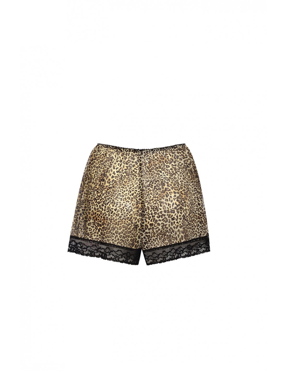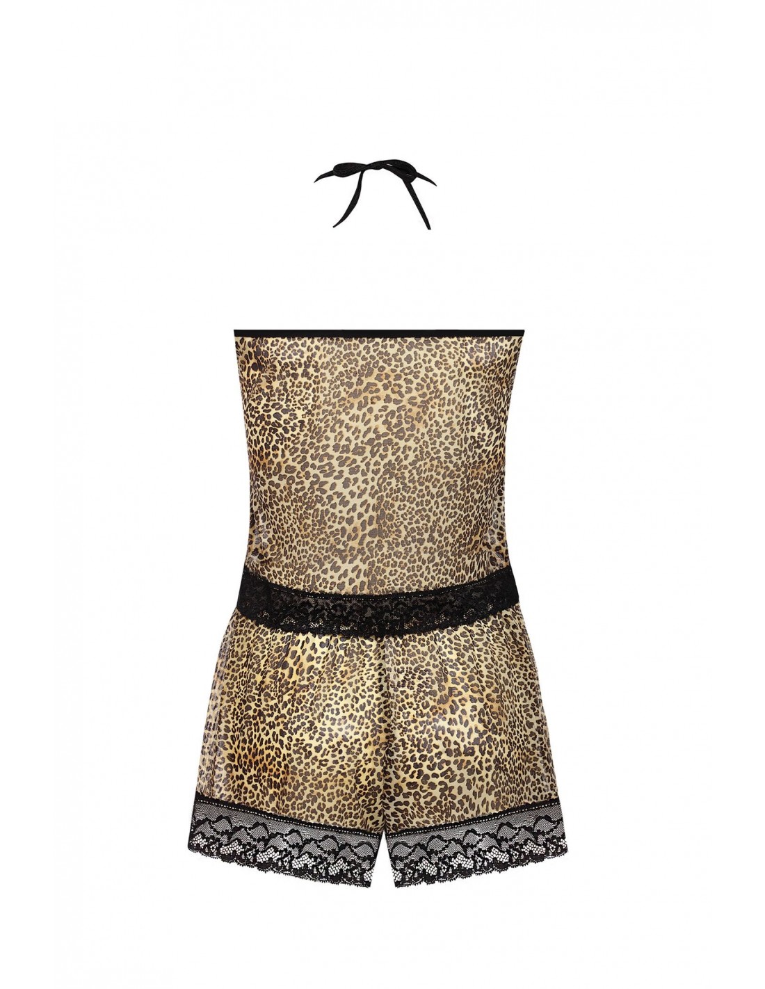 Niezwykły design dla niezapomnianych chwil. Ten komplet dwuczęściowy (koszulka i majteczki) to połączenie delikatnego tiulu w panterkowy wzór z elegancką, czarną koronką. Fantazyjne wiązanie na szyi dodaje uroku, podkreślając Twoją kobiecość.