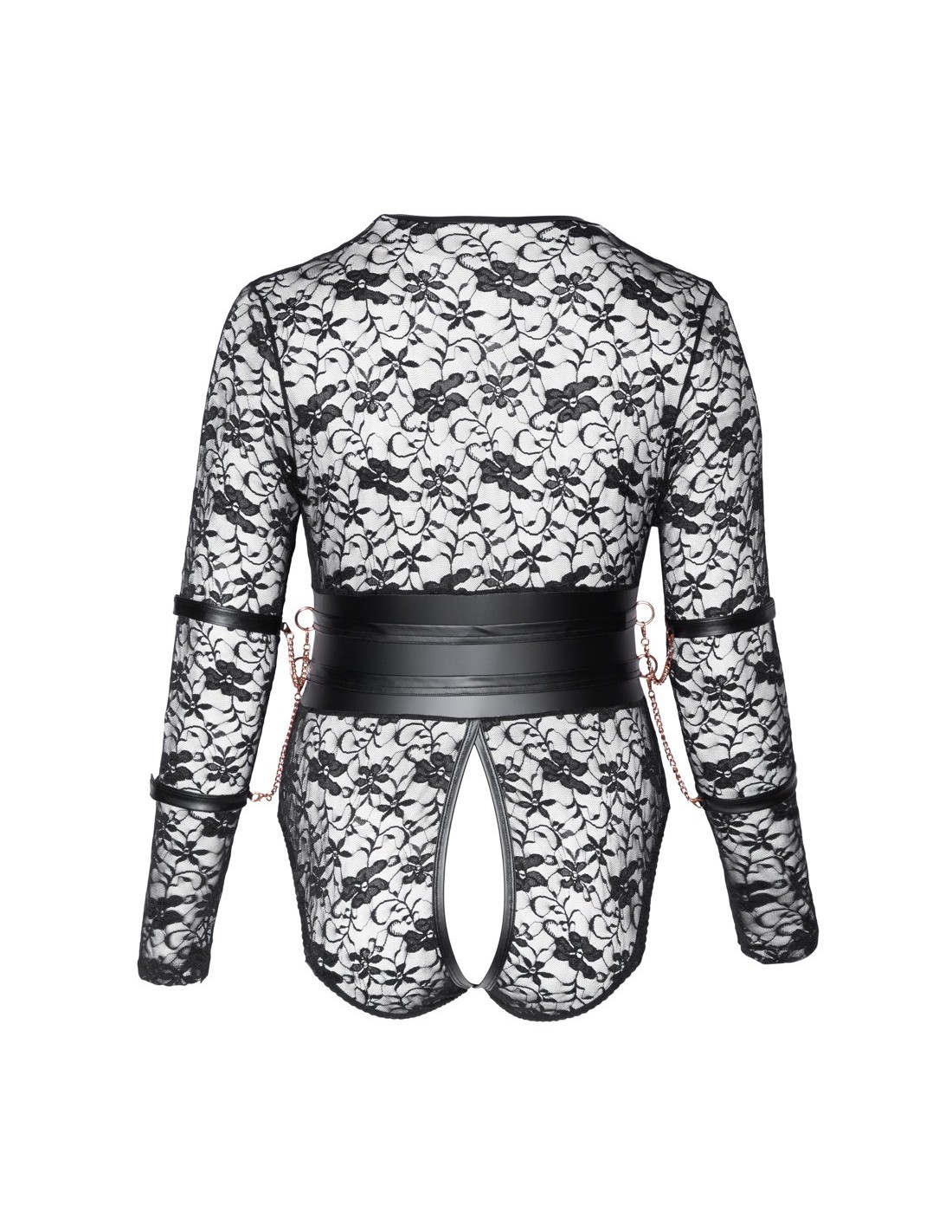 Przód body jest otwarty, a trzymają go tylko dwa pierścienie. To zapewnia niezapomniane wrażenia zarówno dla Ciebie, jak i dla Twojego partnera. Wykorzystaj cztery pętle na ręce, które można zamocować do pierścieni na bokach wstawki w talii. Body jest całkowicie otwarte w kroku, aż do samej góry pośladków. Ta niesamowita konstrukcja gwarantuje niezapomniane doznania i nieograniczoną swobodę ruchów.