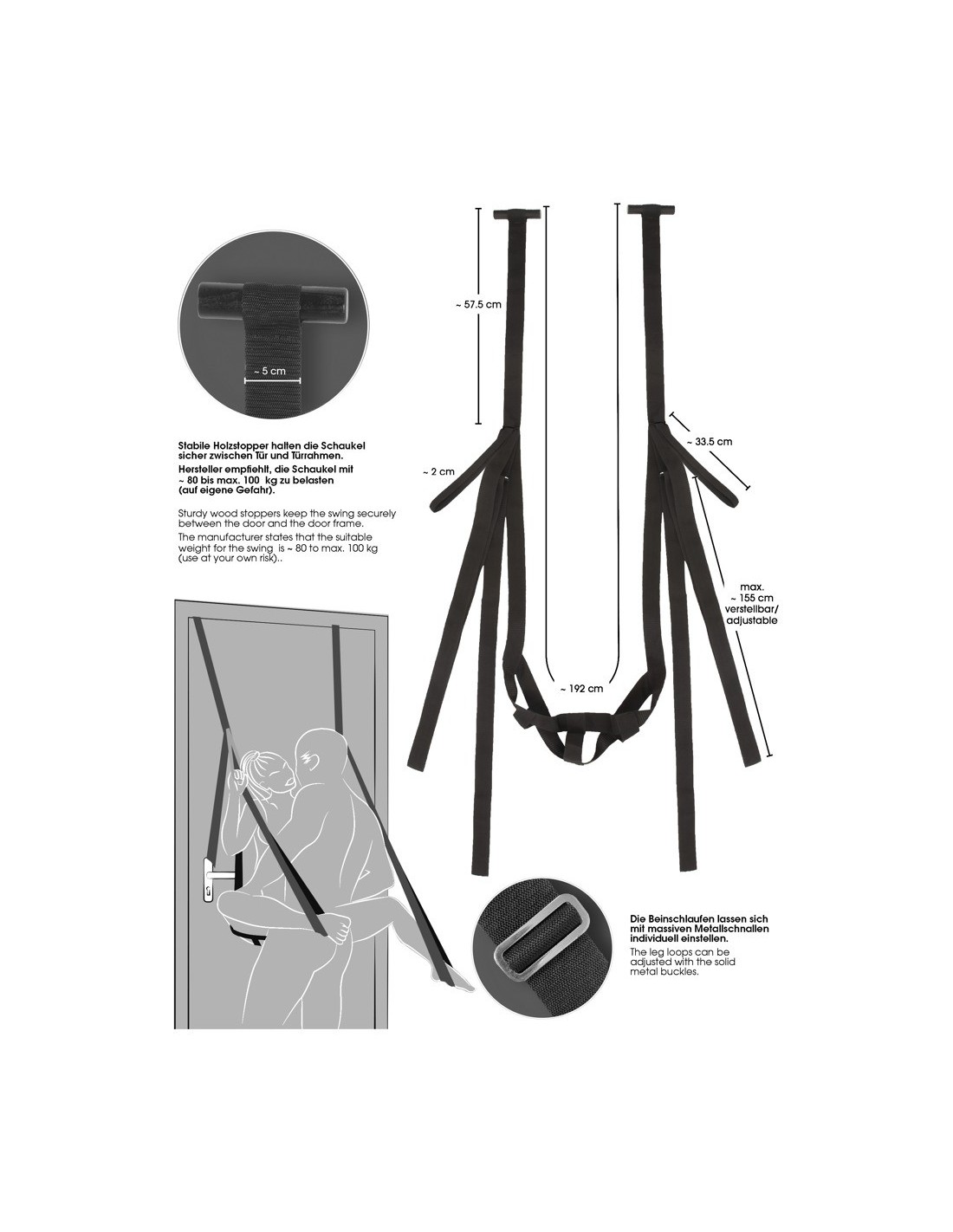 Dzięki regulowanym pętlom na ręce i nogi oraz pasowi na siedzenie, Bad Kitty Door Swing oferuje nielimitowane możliwości eksploracji. Możesz dostosować huśtawkę do swoich preferencji i odkrywać nowe pozycje i techniki. Pozwól swojej wyobraźni i fantazji się rozwinąć – ta huśtawka jest stworzona, aby spełnić Twoje najskrytsze pragnienia.