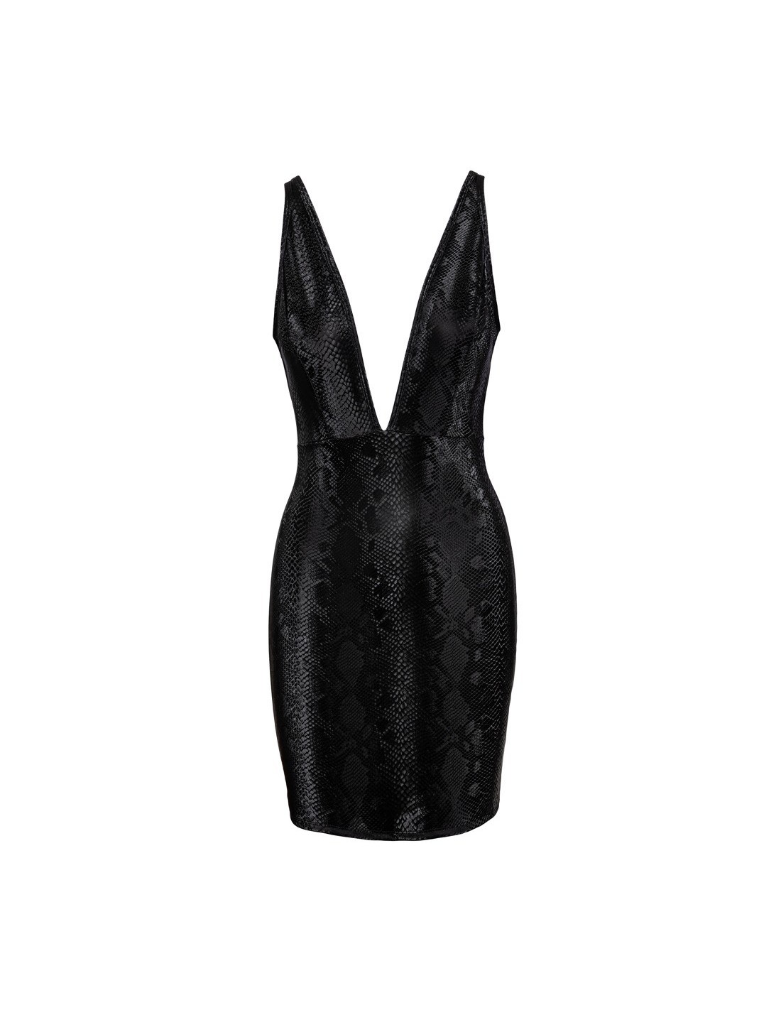 Wykonana z błyszczącego, matowego materiału o efekcie wężowej skóry, sukienka ta przyciąga wzrok i dodaje Ci odrobinę tajemniczości. Jej dopasowany krój i głębokie wycięcia z przodu i z tyłu podkreślają Twoje kobiece kształty, sprawiając, że będziesz wyglądać zjawiskowo i seksownie.