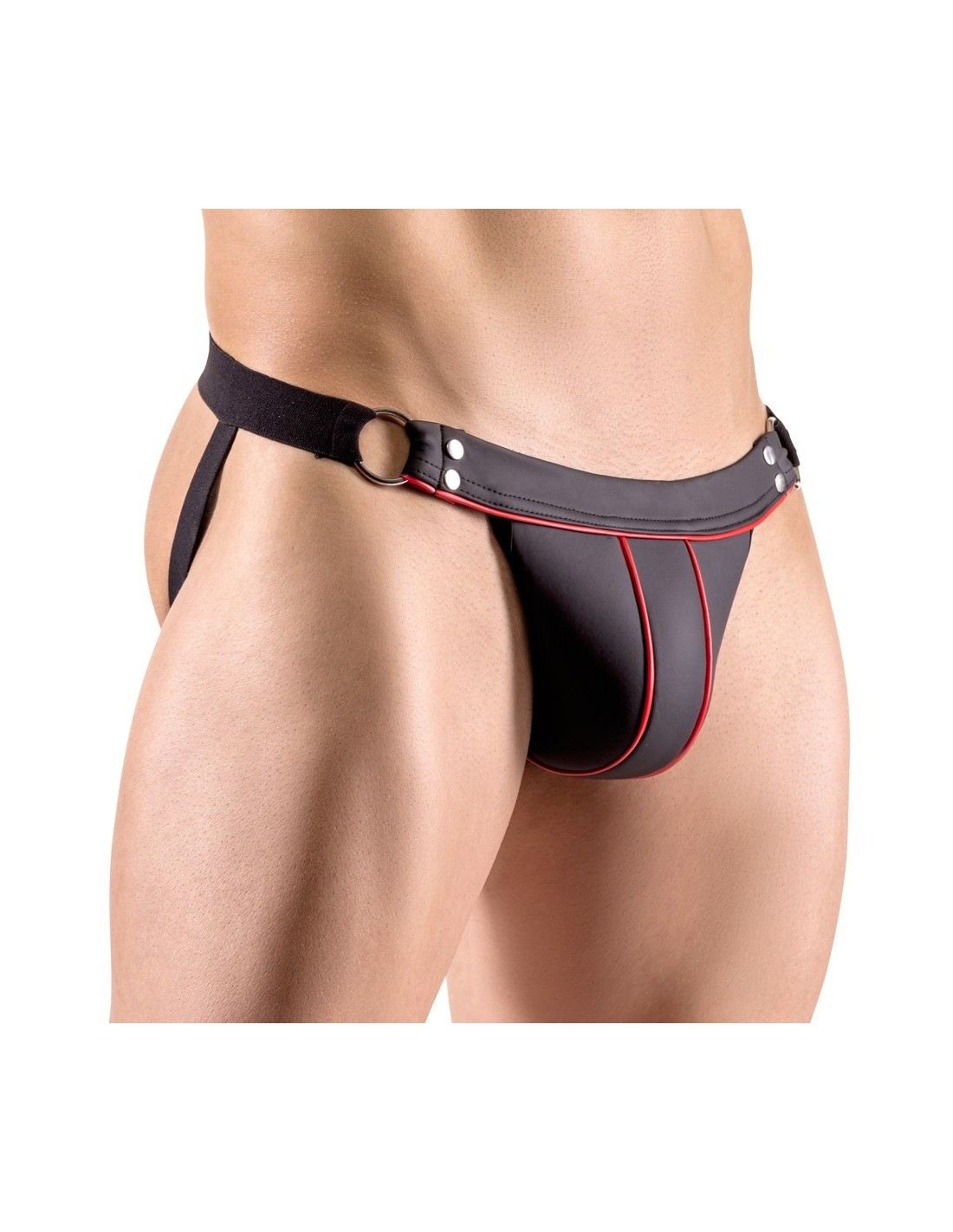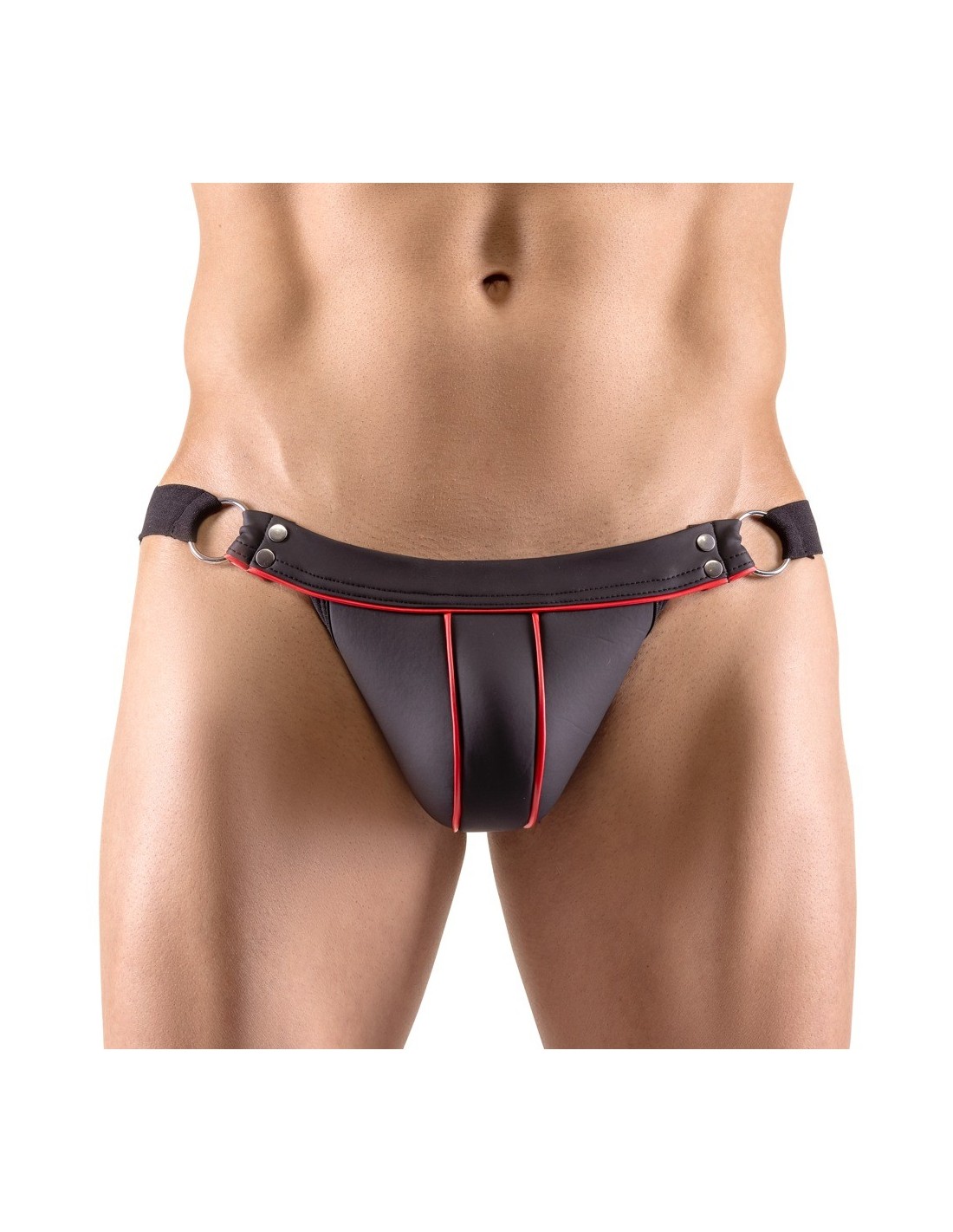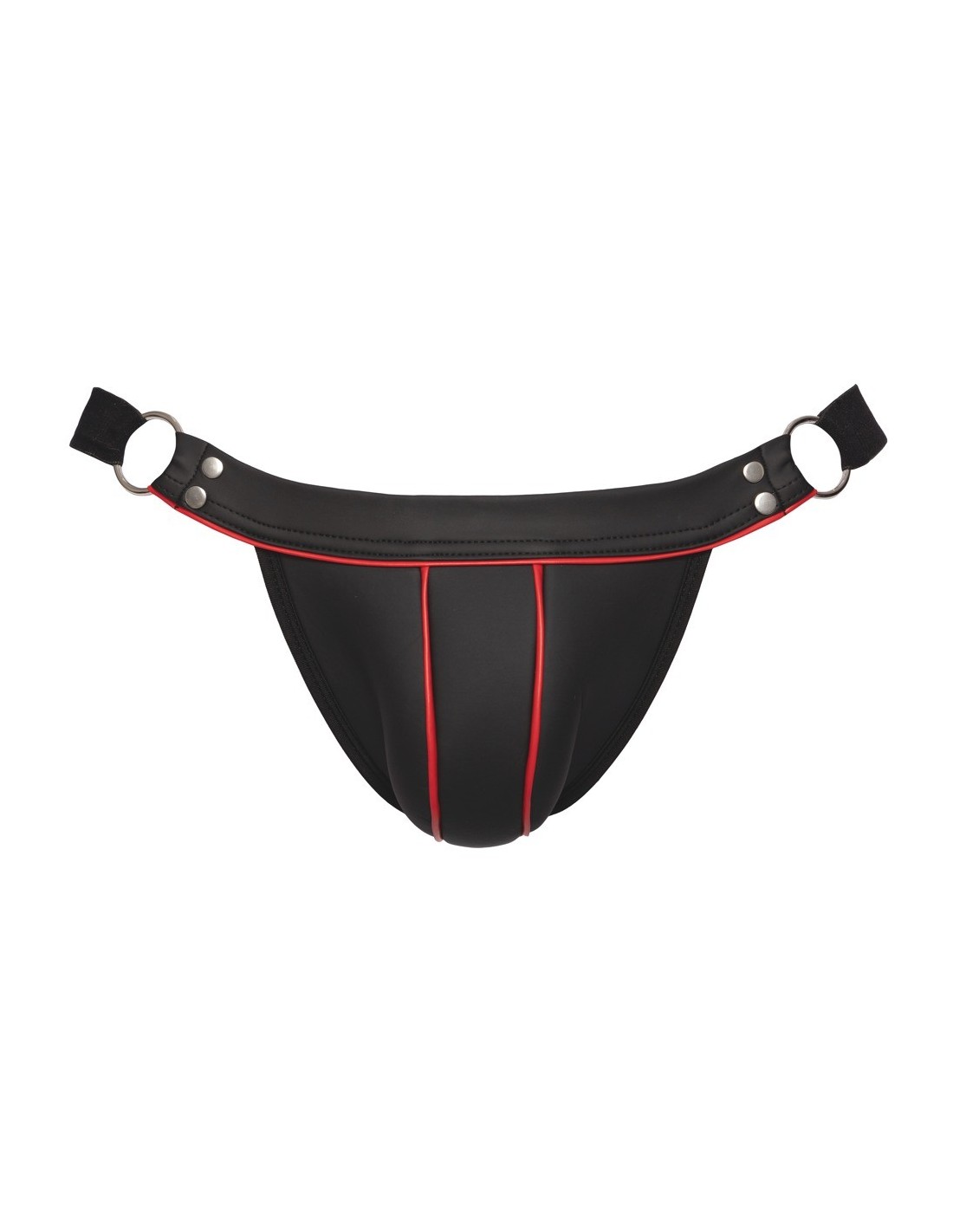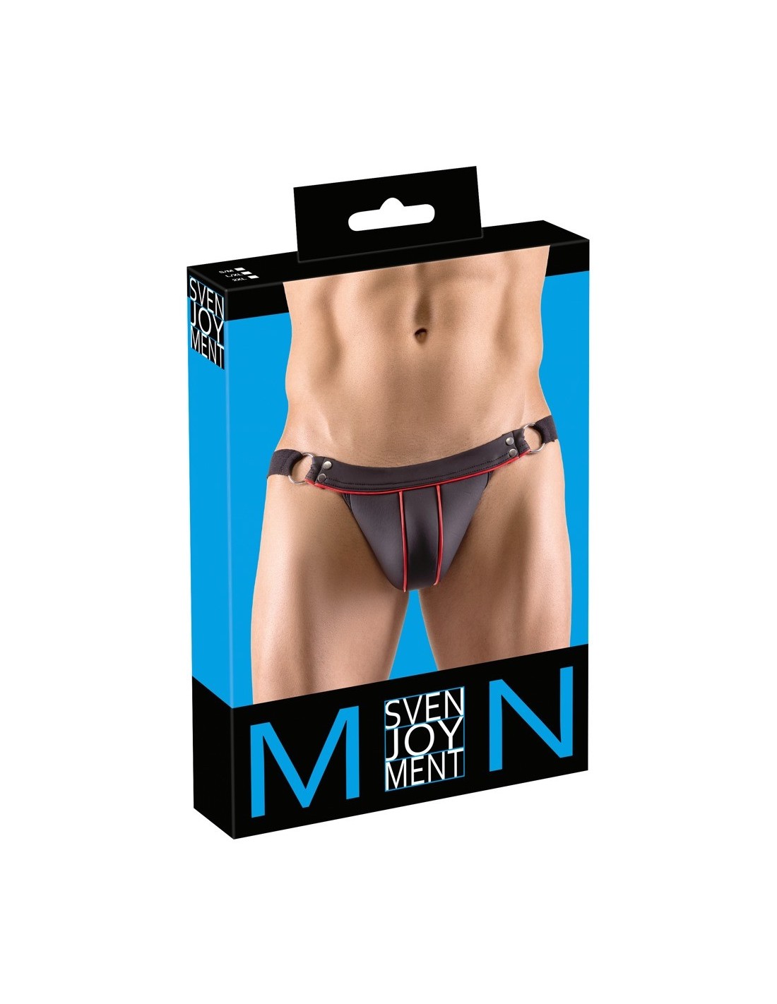 Zmysłowy i męski look neoprenowy! Ekscytujący jock string od Svenjoyment wykonany jest z modnego matowego materiału, który przypomina neopren. Tył jest otwarty, dodając temu produktowi wyjątkowego charakteru. Przód zdobi kontrastujący czerwony kolor, który przyciąga uwagę. Jock string jest miękki, elastyczny i posiada szeroką, pokrytą tkaniną gumkę w pasie, zapewniającą idealne dopasowanie. Wykonany z 90% poliestru, 10% elastanu z powłoką poliuretanową.