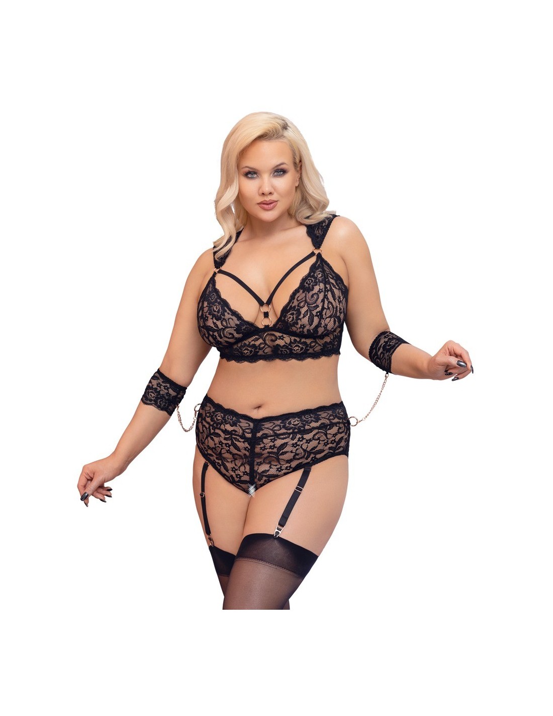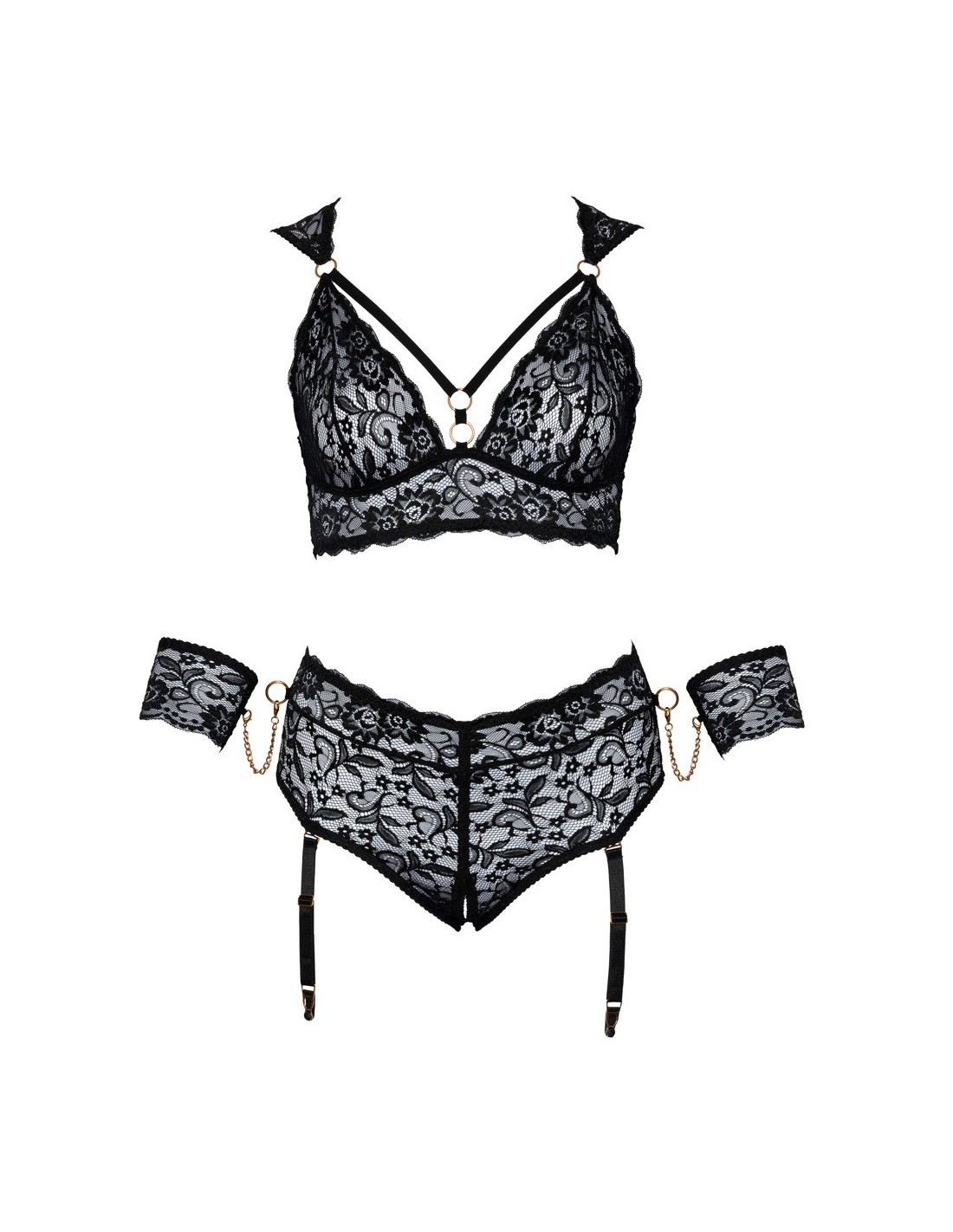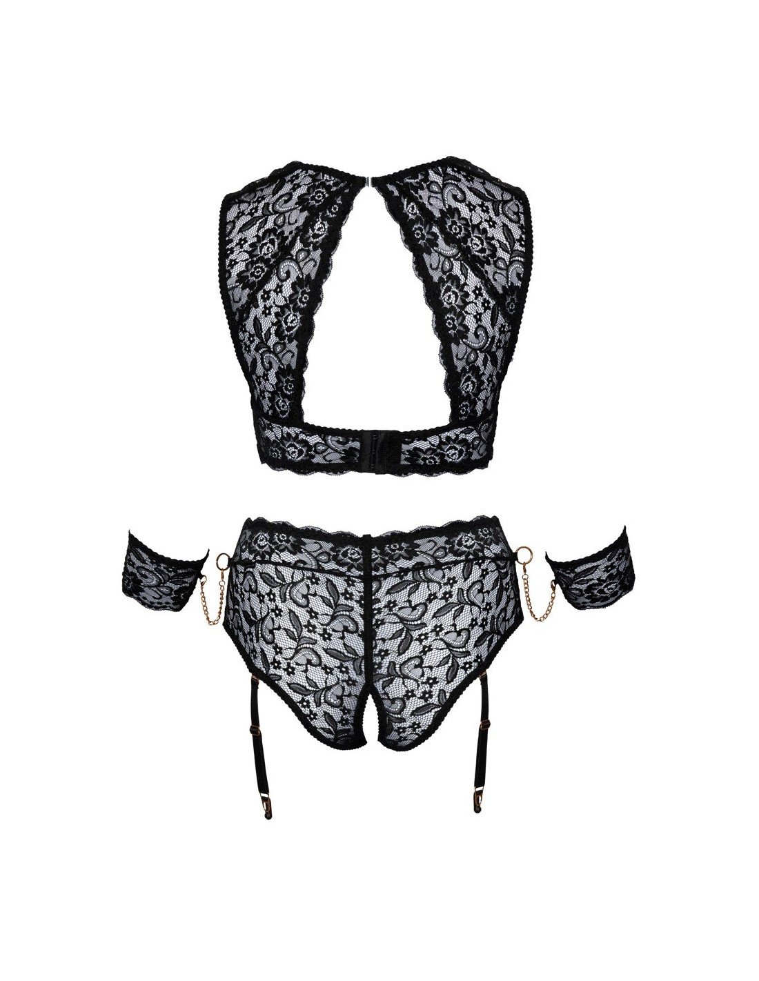 Ten kompletny zestaw składa się z bralette, fig i mankietów. Wszystkie elementy wykonane są z delikatnej i elastycznej koronki, która podkreśla Twoje kobiece kształty. Dodatkowo, złote detale nadają im wyjątkowego uroku i elegancji.