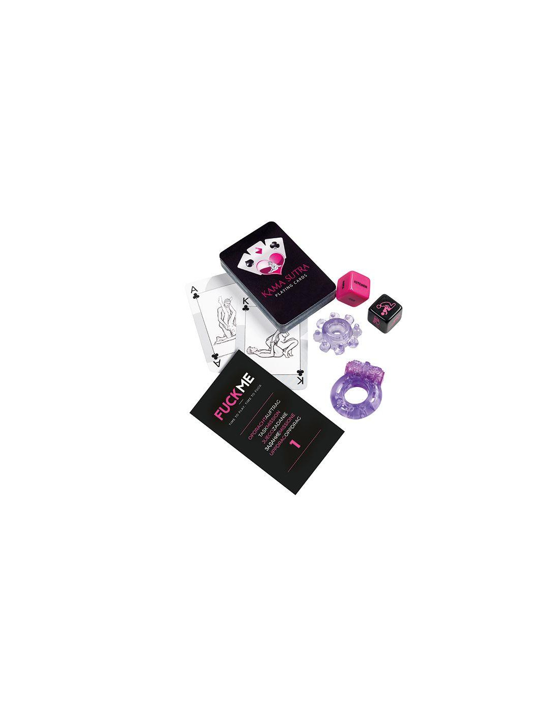 Pudełko zawiera następujące atrybuty: miłosny pierścionek, wibrujący miłosny pierścionek i zestaw erotycznych kości. Dodatkowo gra zawiera sześć książeczek zadań w dziesięciu językach: angielskim, hiszpańskim, francuskim, niemieckim, holenderskim, polskim, rosyjskim, włoskim, szwedzkim i norweskim. Wreszcie, ta gra zawiera pełną talię kart z 52 niezapomnianymi pozycjami Kama Sutry.
