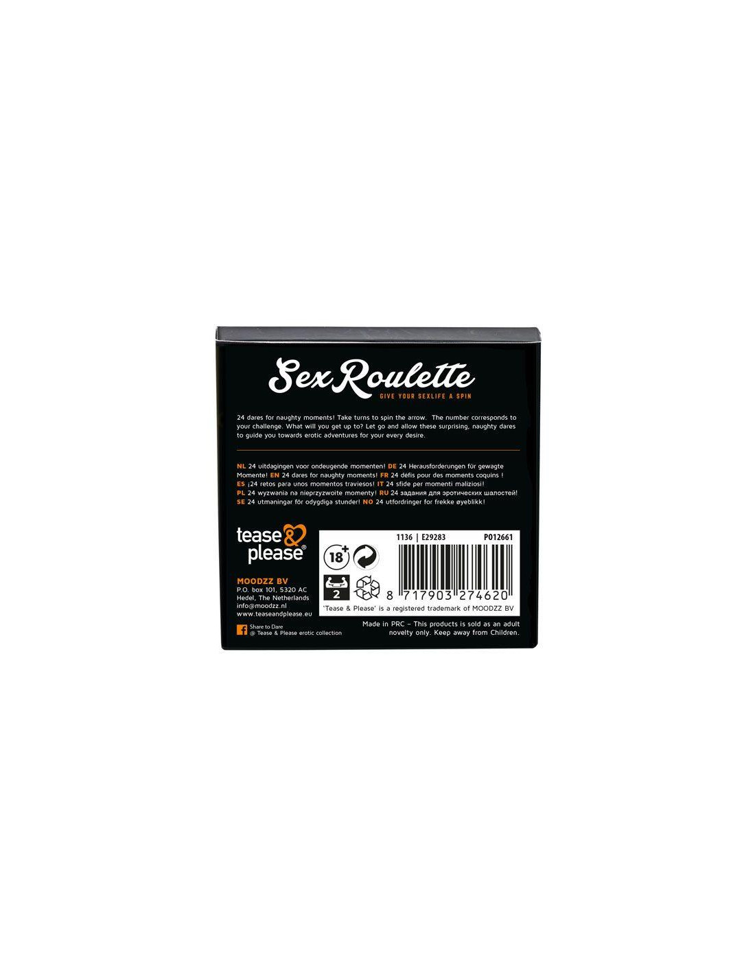 Sex Roulette to najnowsza gra autorstwa Tease and Please. Rozpal niegrzeczne emocje w swoim życiu miłosnym jednym ruchem strzałki planszy. Strzałka wskazuje liczbę, która decyduje o tym, jakie wyzwanie erotyczne czeka na Ciebie. Nie ma wątpliwości, że 24 wyzwania w edycji Naughty Play dodadzą niegrzecznego charakteru Twojemu życiu seksualnemu, zapewniając (jeszcze) bardziej zabawne, seksowne doznania. Czy jesteś wystarczająco niegrzeczny, aby się zanurzyć? Wskoczcie razem i cieszcie się zabawą, zmysłową przygodą i sobą nawzajem.