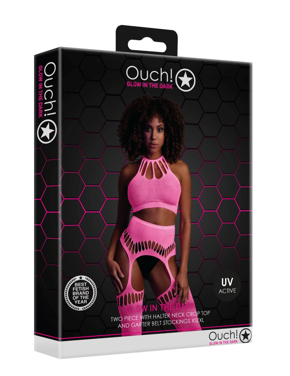 Uwolnij swoją wewnętrzną boginię dzięki tej oszałamiającej bieliźnie aktywowanej promieniowaniem UV. Ten model składa się z krótkiego topu z dekoltem wiązanym na szyi i pończoch z paskiem do pończoch. Niesamowita odzież imprezowa, która wywoła efekt wow i sprawi, że się wyróżnisz. Aktywowane promieniowaniem UV materiały dodają odrobiny tajemniczości i uroku. Łatwy w dopasowaniu dzięki rozciągliwym materiałom sprawi, że rozświetlisz noc.