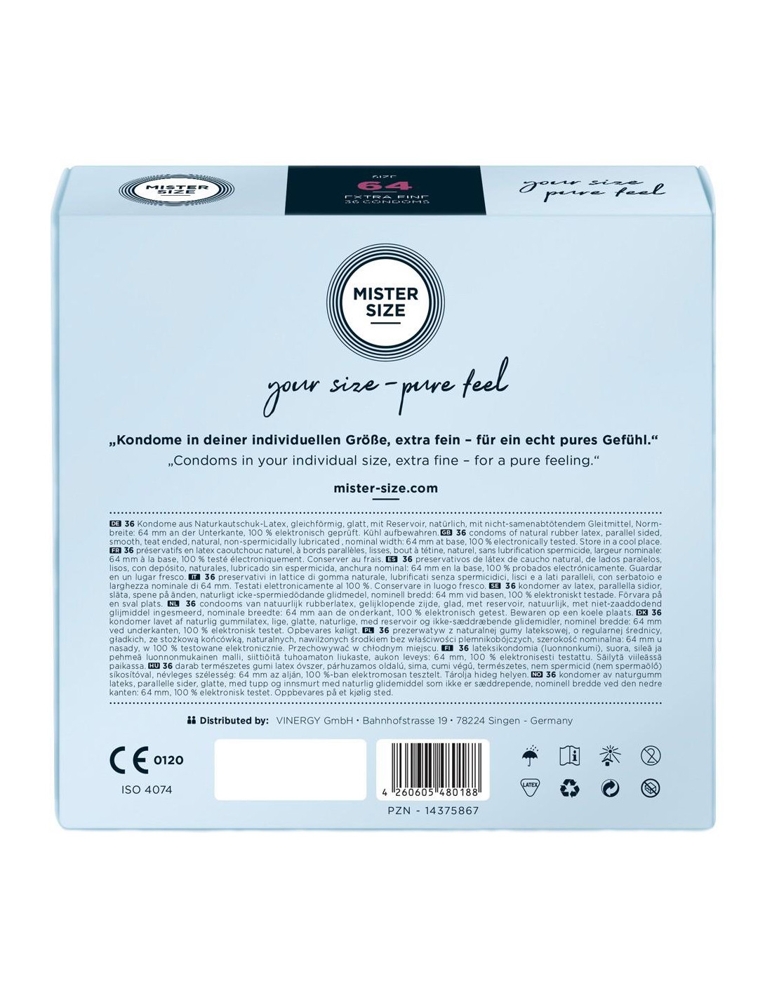 Przezroczyste, cienkie prezerwatywy Mister Size (64 mm) wykonane z lateksu kauczuku naturalnego z warstwą lubrykantu i zbiorniczkiem. Wegańskie.