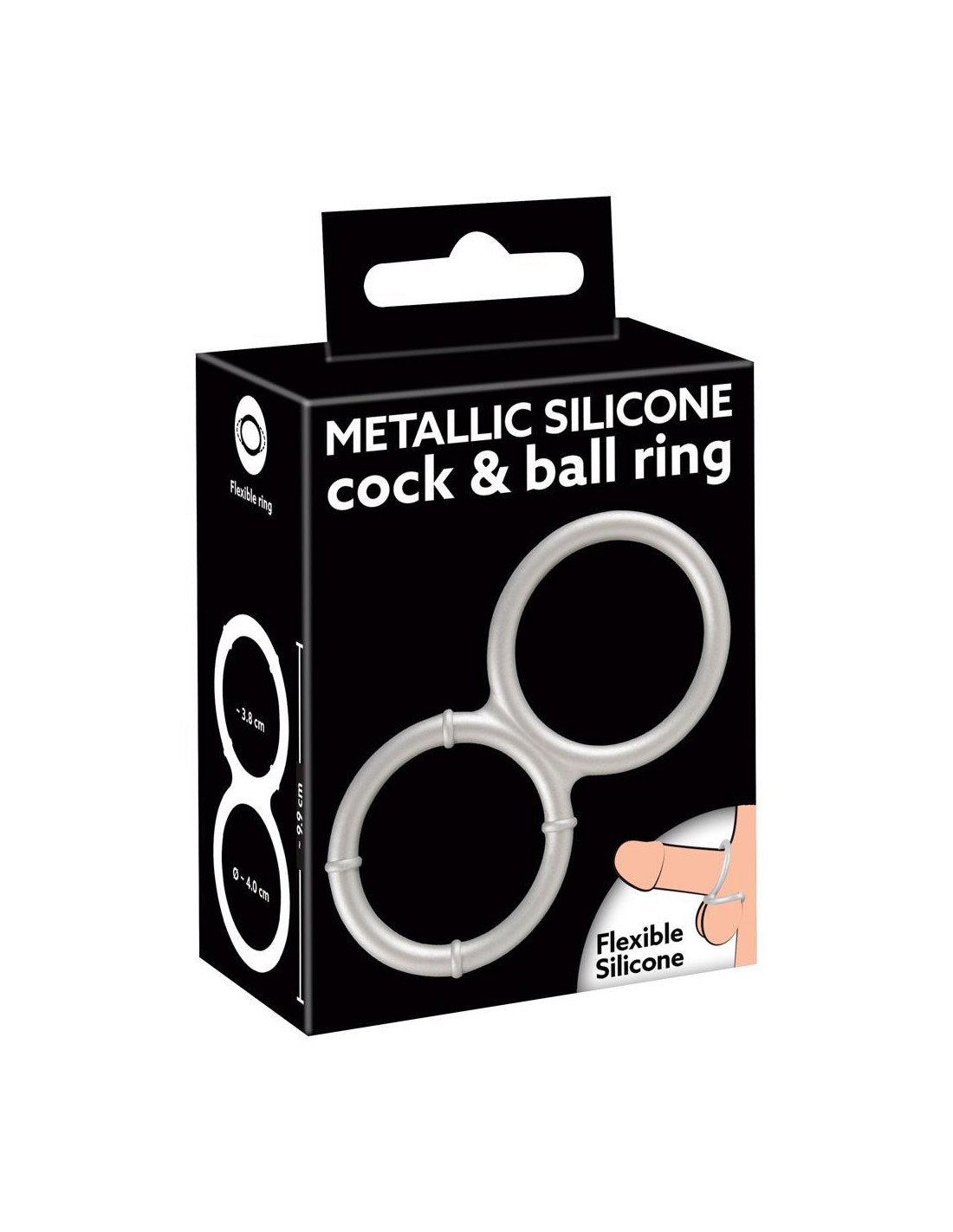 Very stretchy Metallic Silicone Cock and Ball Ring by You2Toys in a cool metal look - but with the comfort of silky soft silicone. Can be worn around the penis AND testicles or placed as a double ring ONLY around the penis or testicles. The two combined silicone rings fit perfectly, are pleasantly firm to wear and support a long-lasting erection thanks to the blood flow restriction effect.