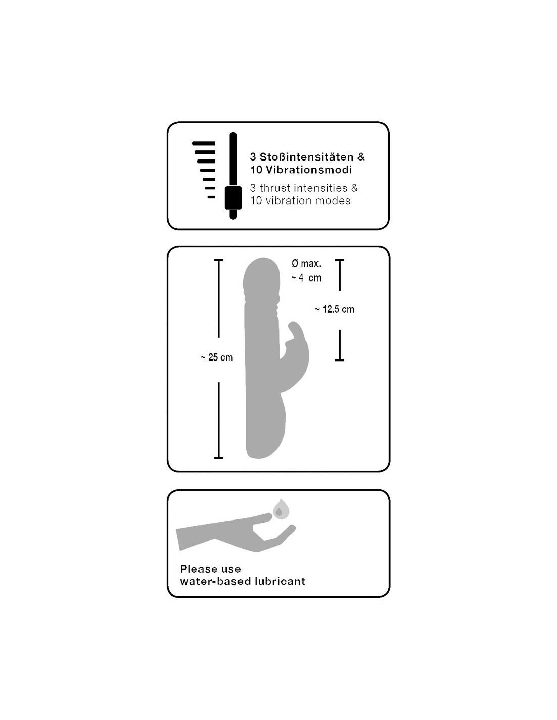 Długość całkowita: 25 cm, średnica 4 cm. Silikon, PU, ABS. (Baterie należy zamawiać oddzielnie: 3 x AA).