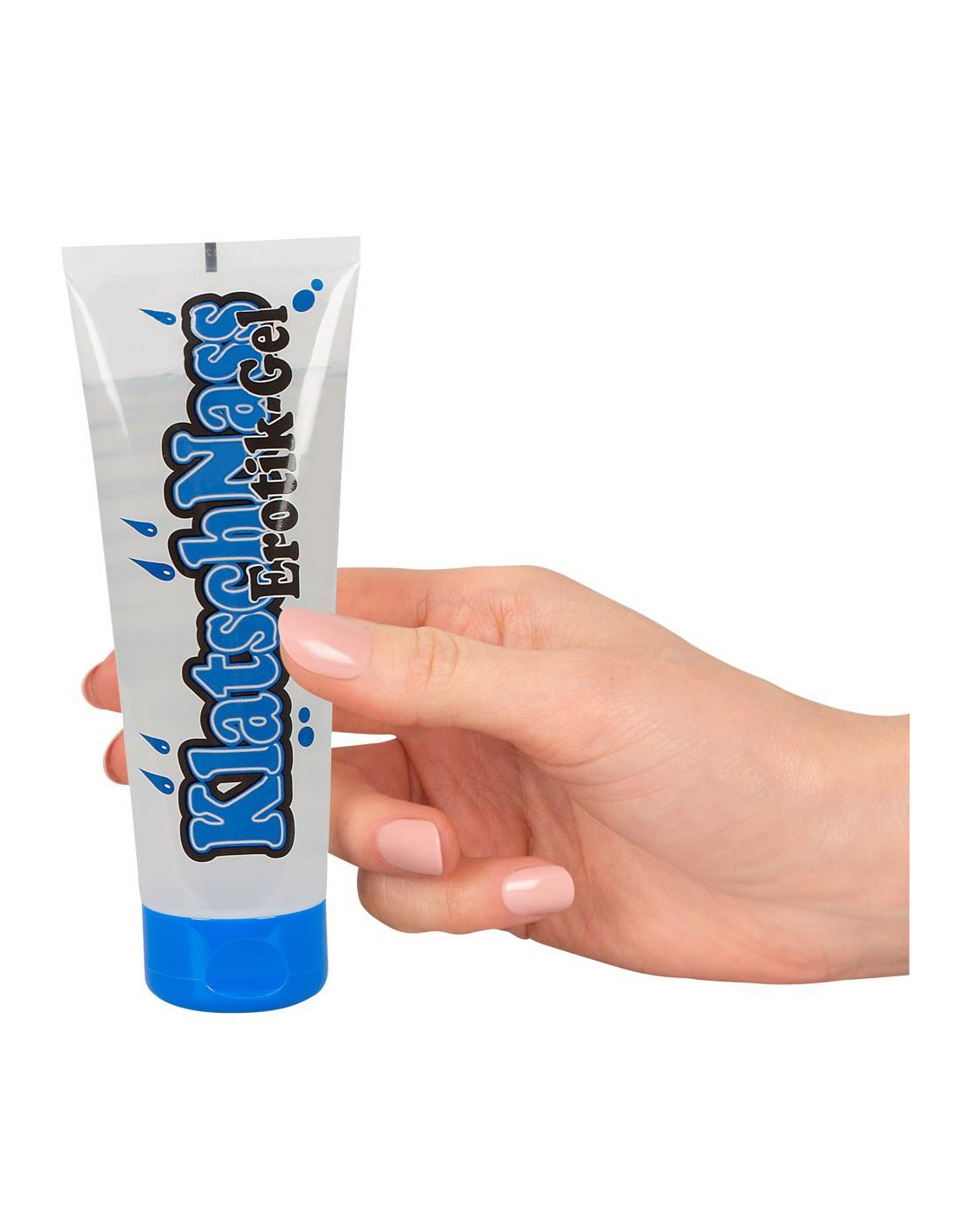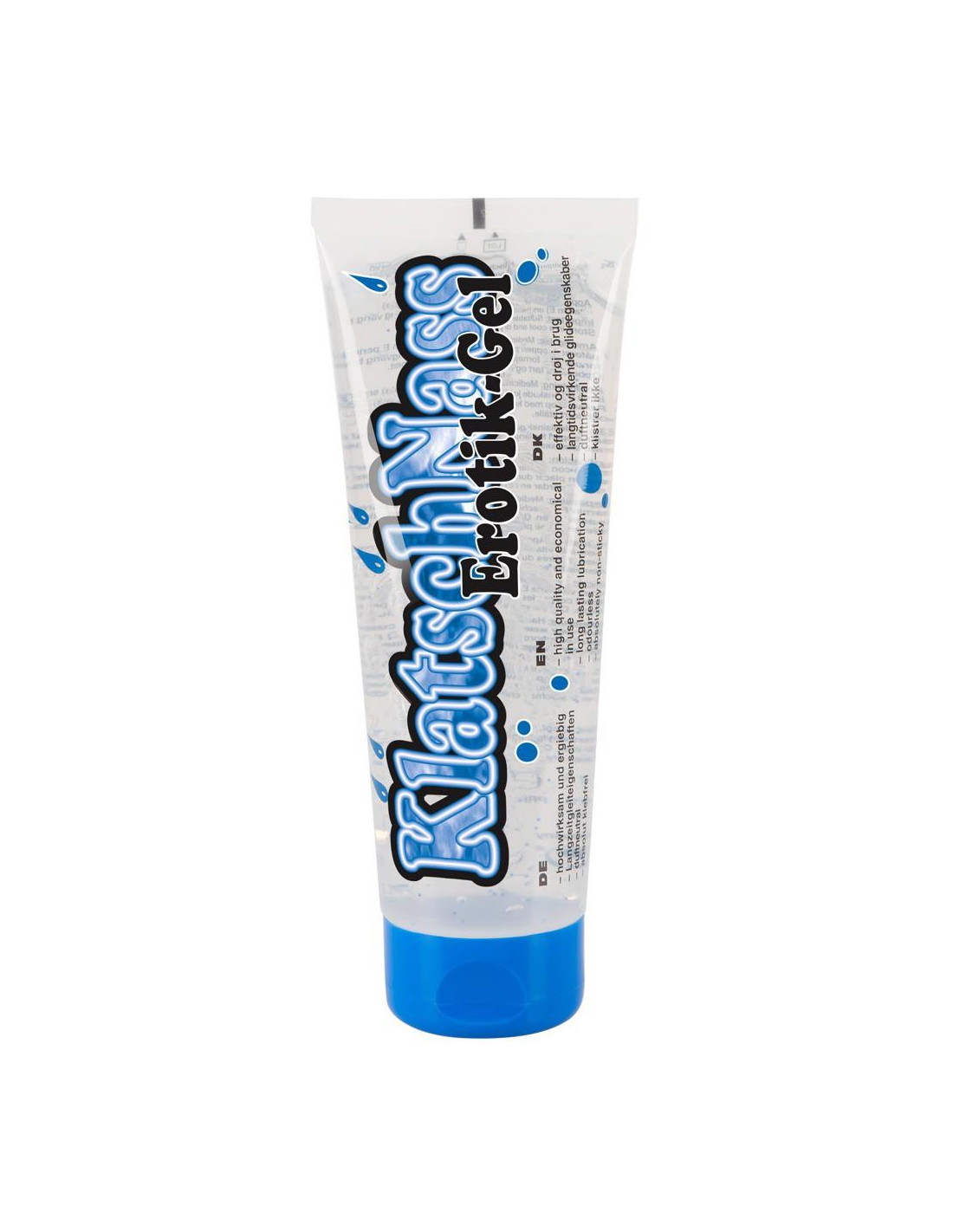 The extra thick water-based erotic gel KlatschNass is enriched with moisturising hyaluron. It makes the gel extra smooth and ensures long-lasting gliding during intensive (body-to-body) massage. Vegan, free from oil & grease. 240 ml.