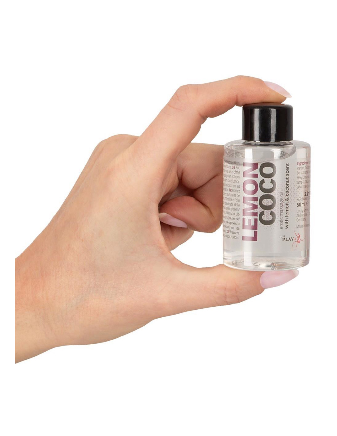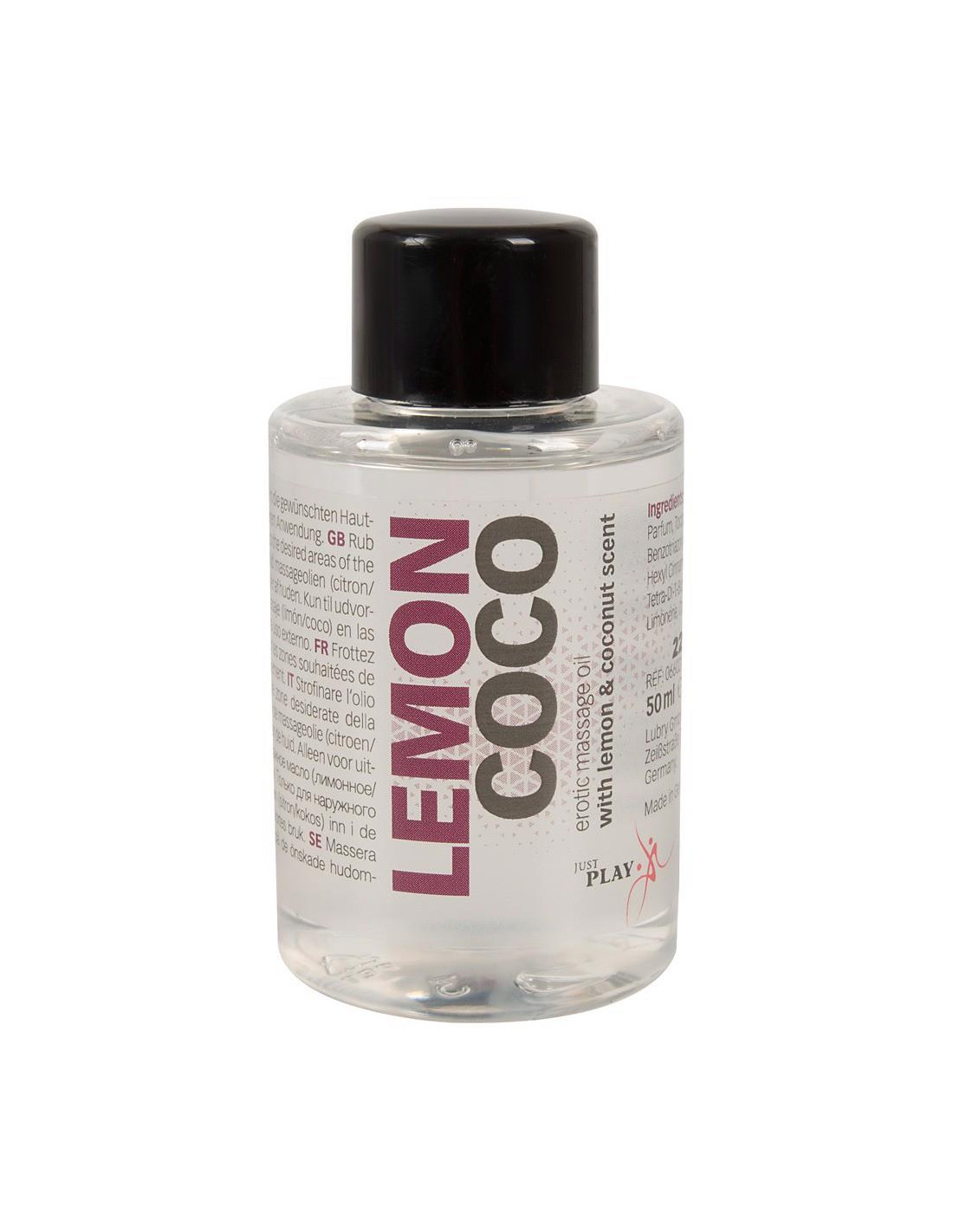 The Just Play erotic massage oil with its exciting, exotic lemon-coconut scent delights all senses and awakens erotic passions during a partner massage. Very rich. Vegan. 50 ml. For external use only.