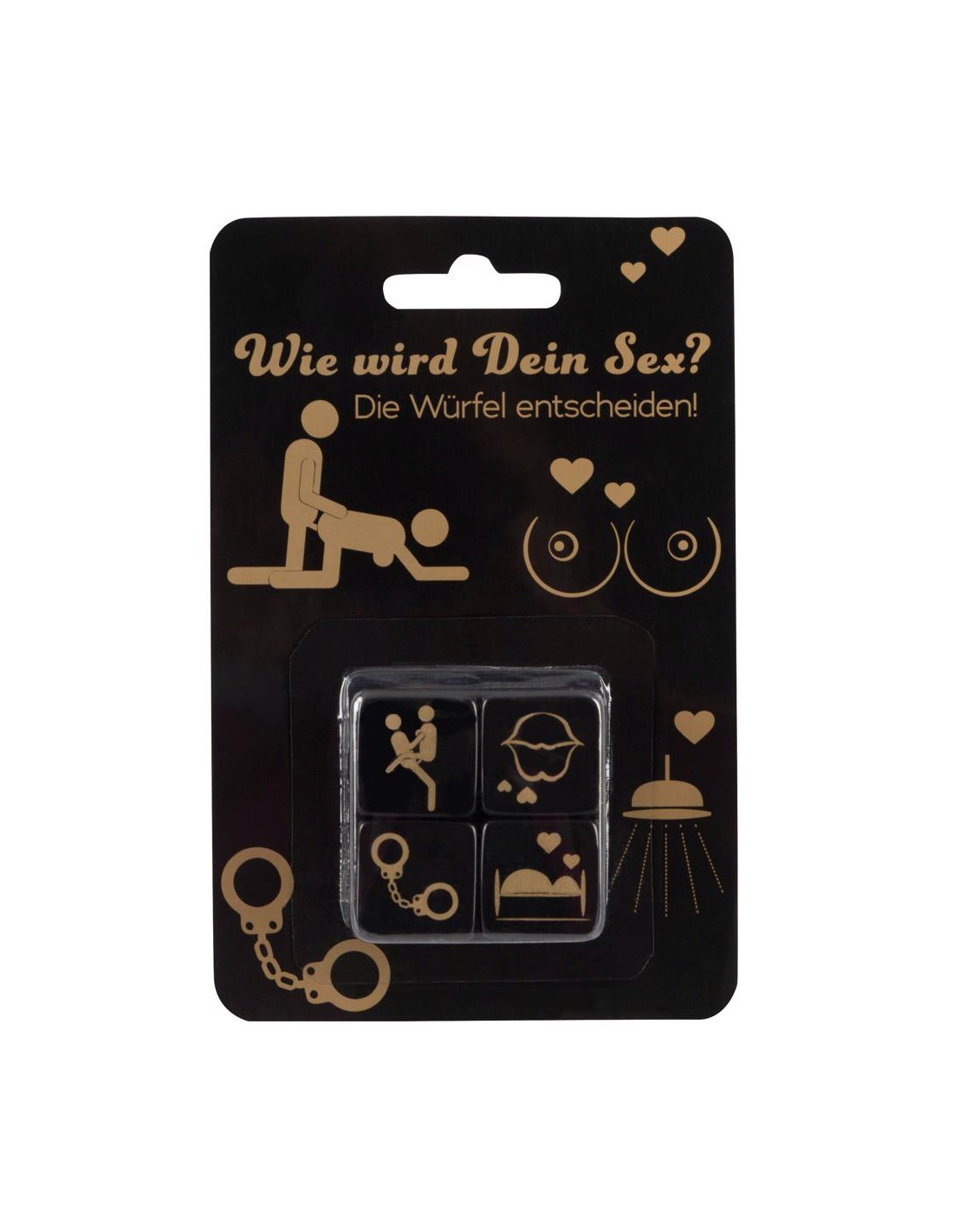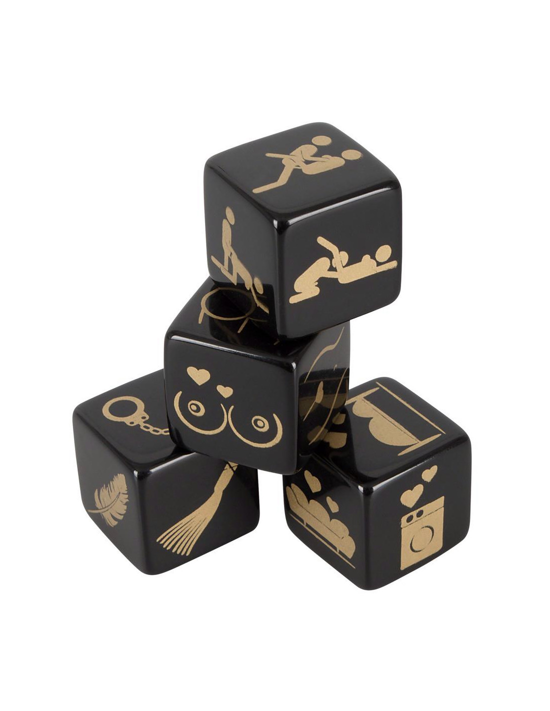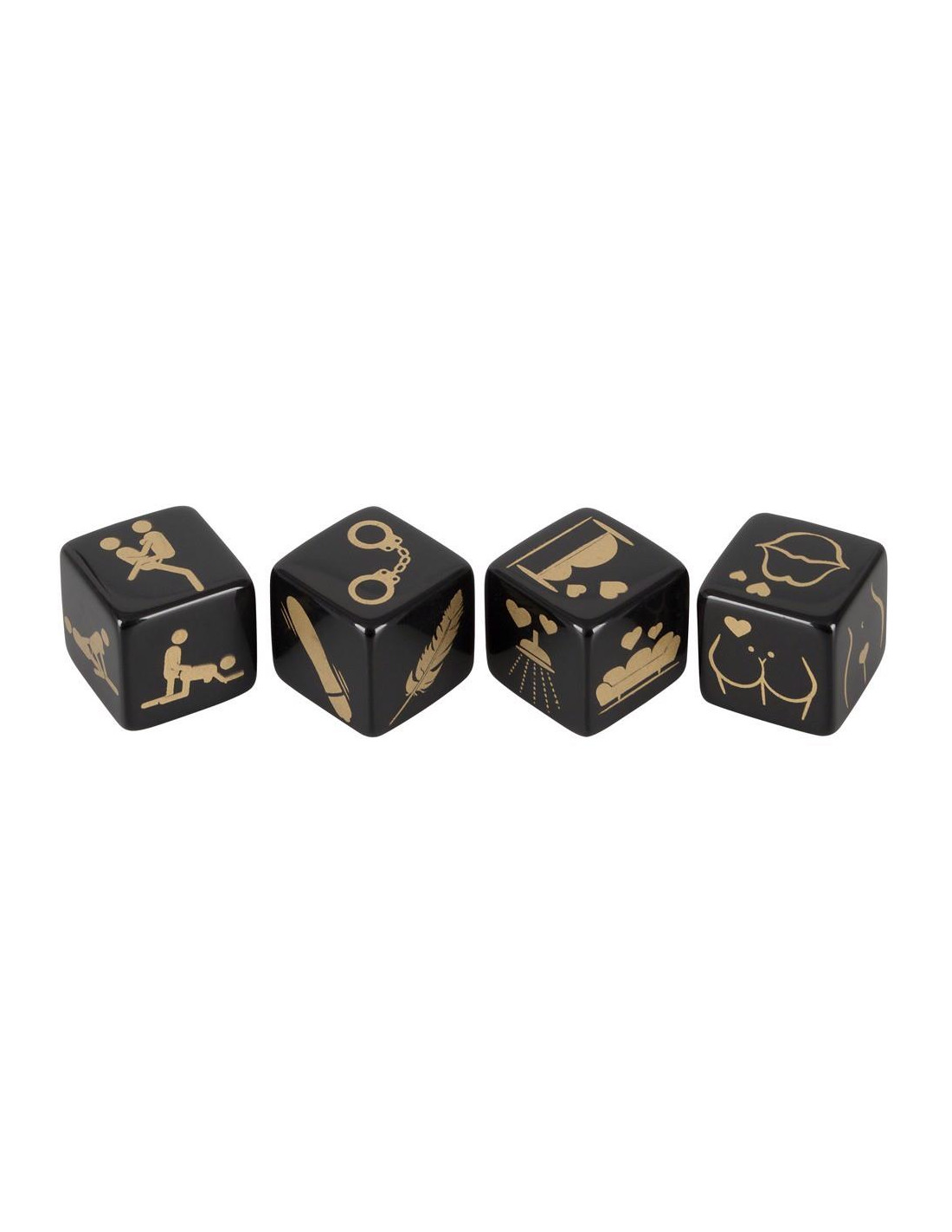 4 czarne akrylowe kostki (25 x 25 x 25 mm) z nadrukowanym złotym motywem w zestawie: pozycje, miejsca, akcesoria i regiony ciała.