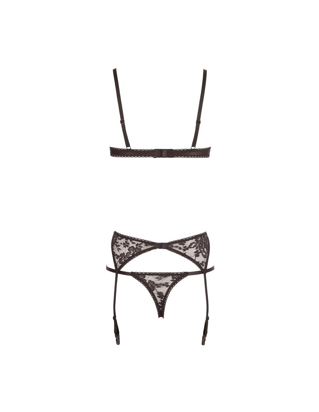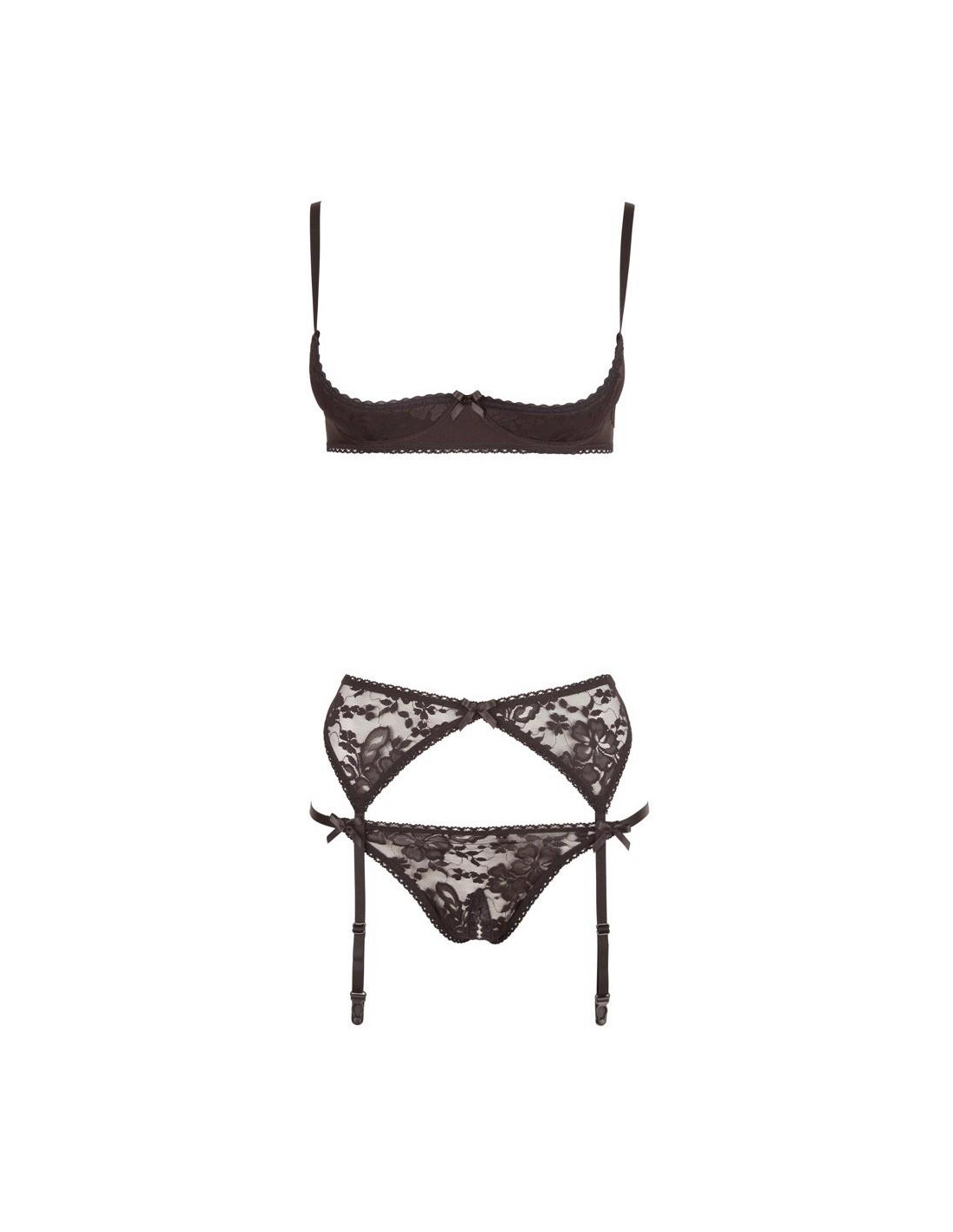 Podwyższenie, Riostring ouvert i pas do pończoch w komplecie. Wszystkie trzy części wykonane z czarnej, elastycznej koronki. Podwyższony stanik z lekko usztywnionymi miseczkami na fiszbinach, Riostring ekscytująco otwarty w kroku.
