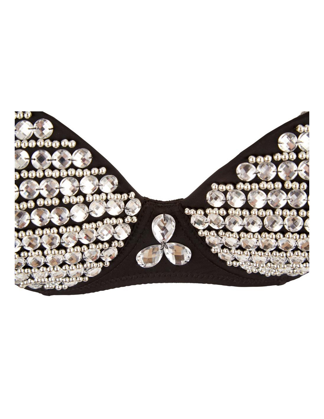 Underwired bra with slightly padded cups that are covered in pearls and rhinestones. There are small bones at either side and a hook-fastener at the back. The straps are adjustable and removable.