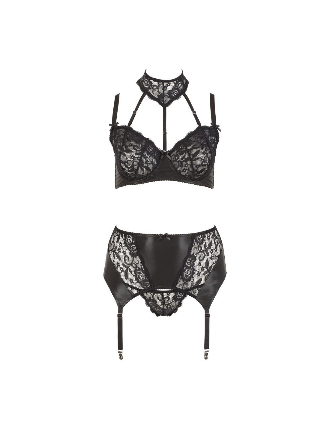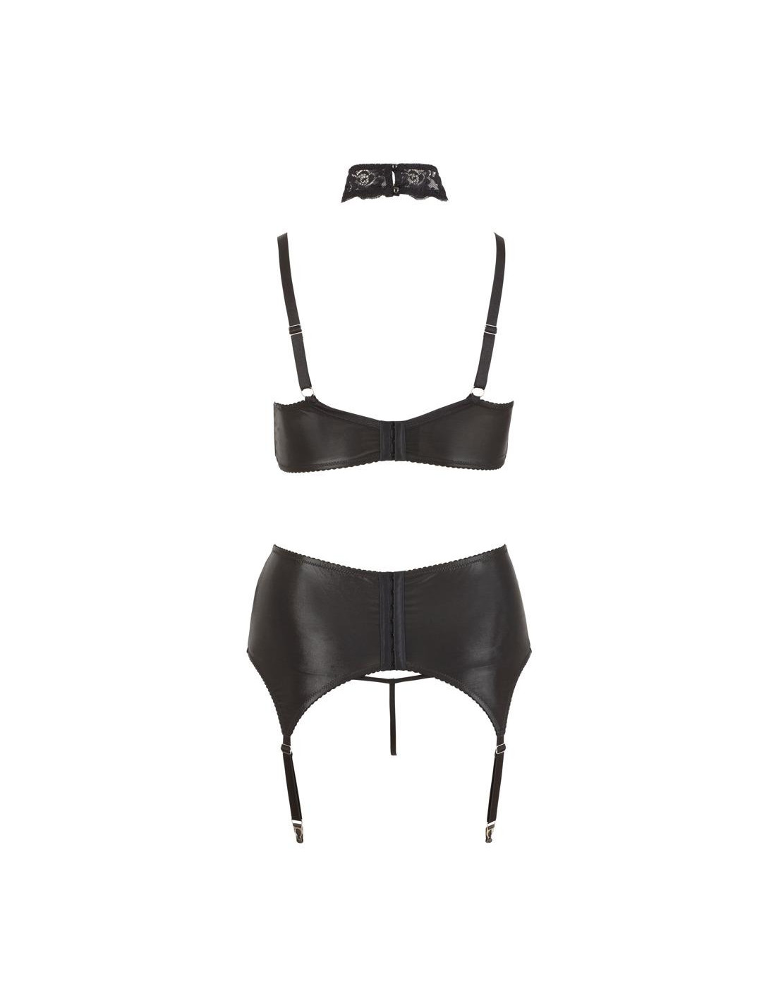 Underwired bra, suspender belt and string in one set. Made of black lace combined with shiny material. Bra with shaping bones at either side for perfect support of the breasts. The collar has adjustable straps that can be removed from the bra. Bra and 4 suspender straps are adjustable. Black. 90% polyamide, 10% spandex. Without stockings.