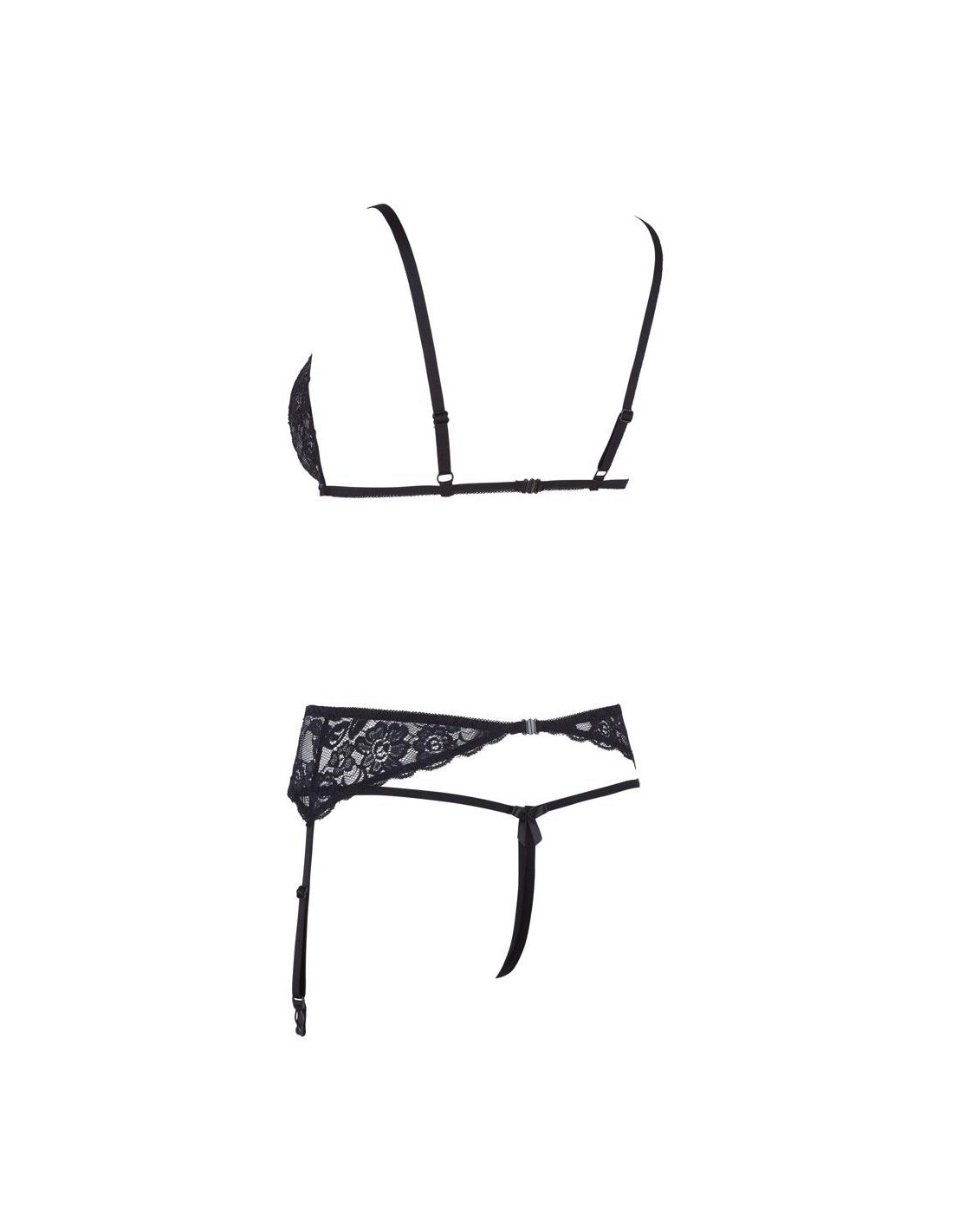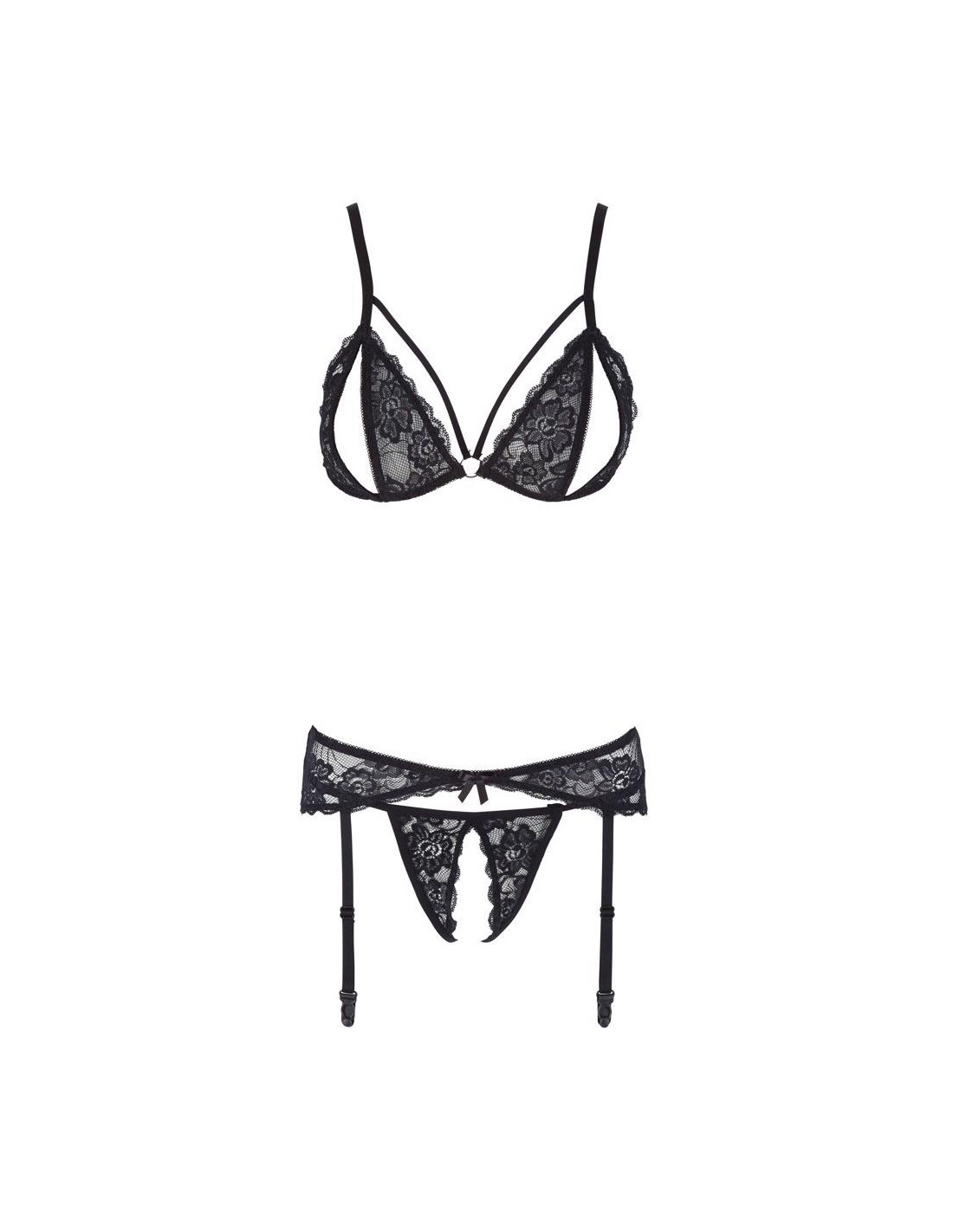 Ten trzyczęściowy zestaw do zawieszania uwodzi delikatną kwiatową koronką. Biustonosz z regulowanymi ramiączkami urzeka detalami na ramiączkach przy dekolcie oraz ekscytującymi miseczkami z rozcięciami - podkreślonymi ozdobnym pierścieniem. Pasujący pas do szelki jest wąsko wycięty i posiada regulowane szelki. Obie części bielizny są zamykane z tyłu praktycznym klipsem. Zespół jest zakończony całkowicie otwartym smyczkiem.