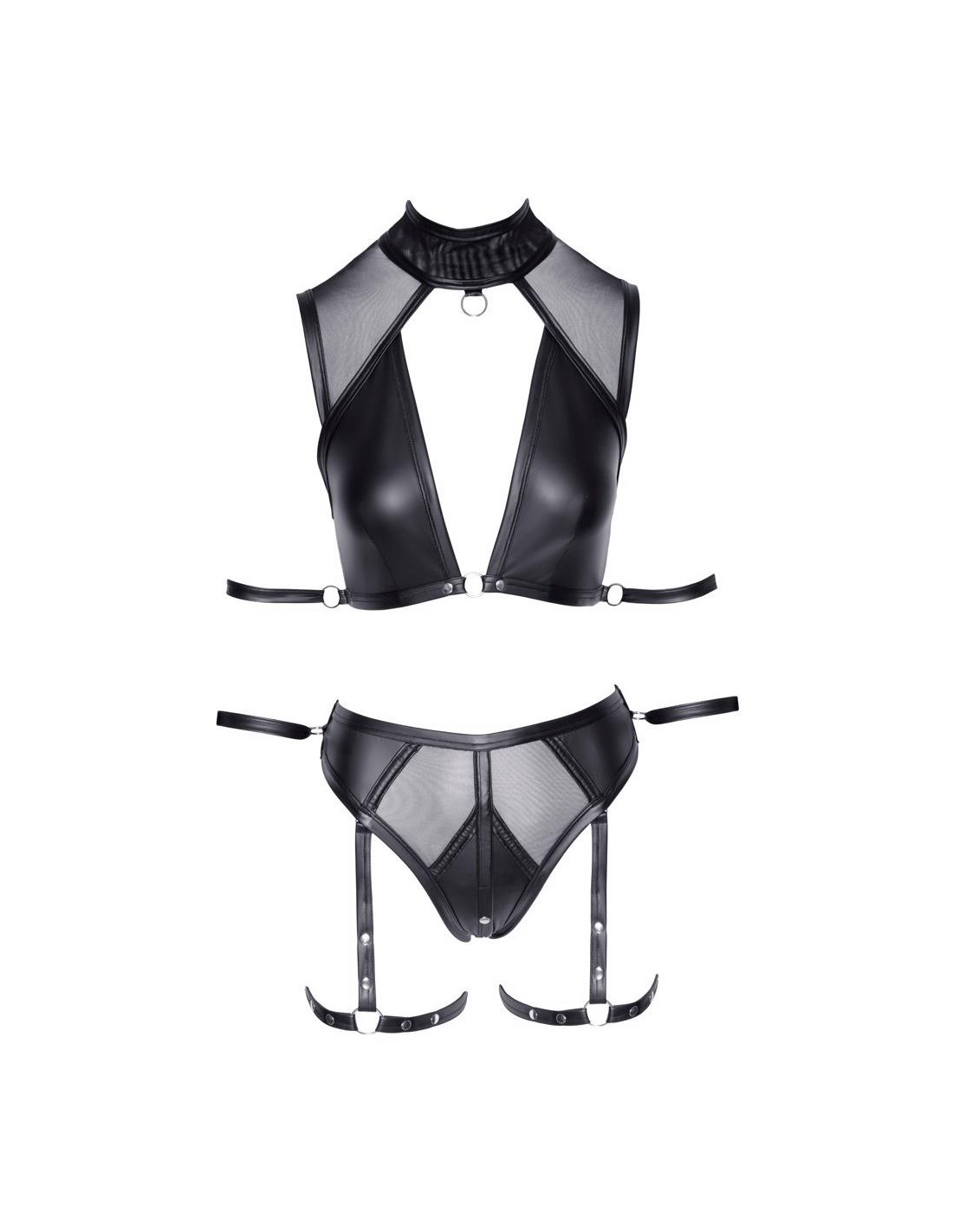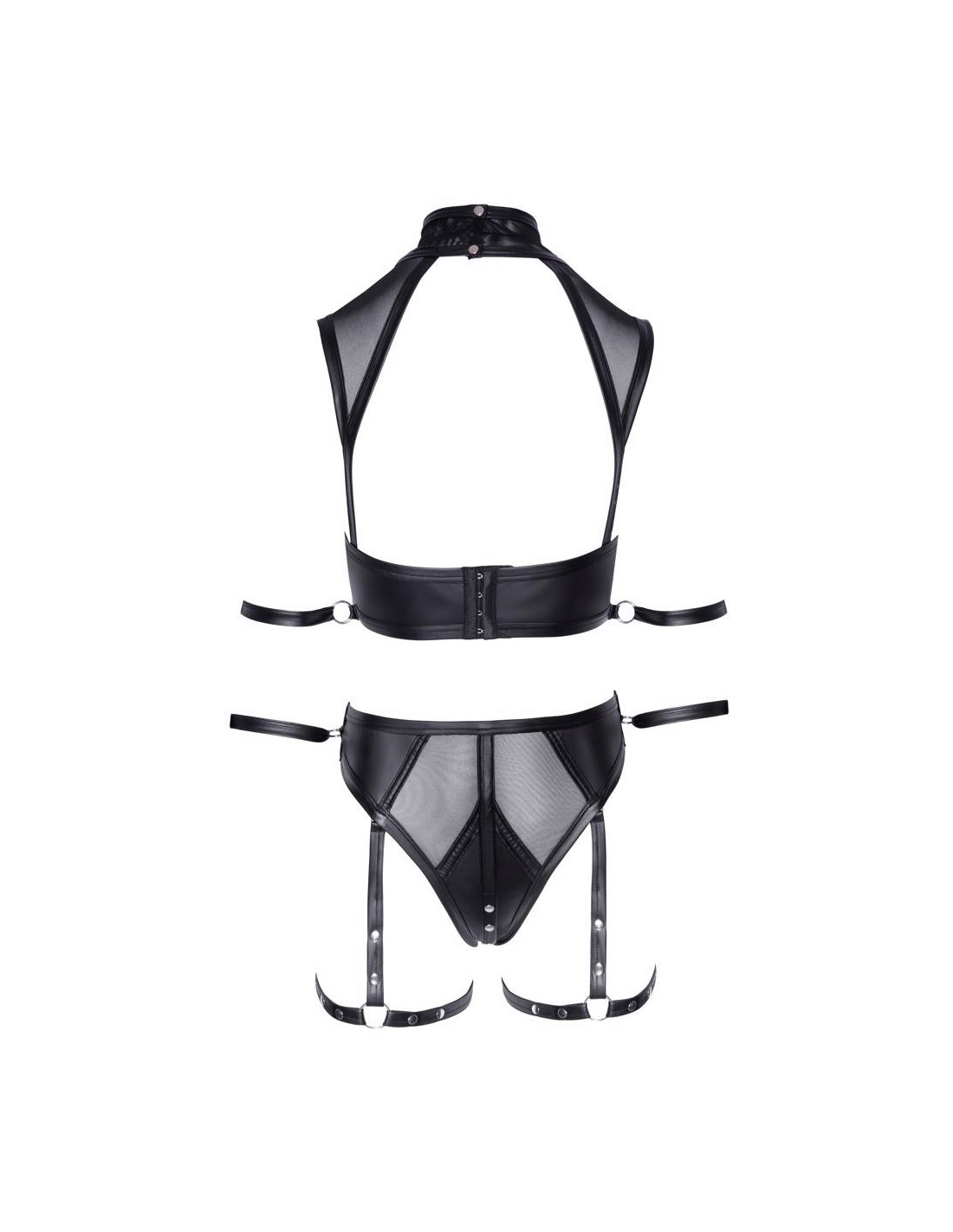 Top plus majtki Cottelli BONDAGE w szlachetnym matowym stylu z przezroczystymi wstawkami z powernetu. Obszerny dekolt z wysoką stójką ozdobioną z przodu kółkiem i zapinaną z tyłu na 2 zatrzaski. Prawie bez pleców z szeroką listwą zapinaną na haftki. Pierścień z każdej strony z paskami na kostkach dla ramion. Majtki są wysoko wycięte w pasie i mają erotyczne praktyczne zapięcie na zatrzaski w kroku. W pasie znajduje się pierścień z paskiem na kostkę dla rąk. Szelki udowe można całkowicie zdjąć. Paski na kostkach ramion i rąk mają regulowane zapięcie na rzepy i są również odpinane.