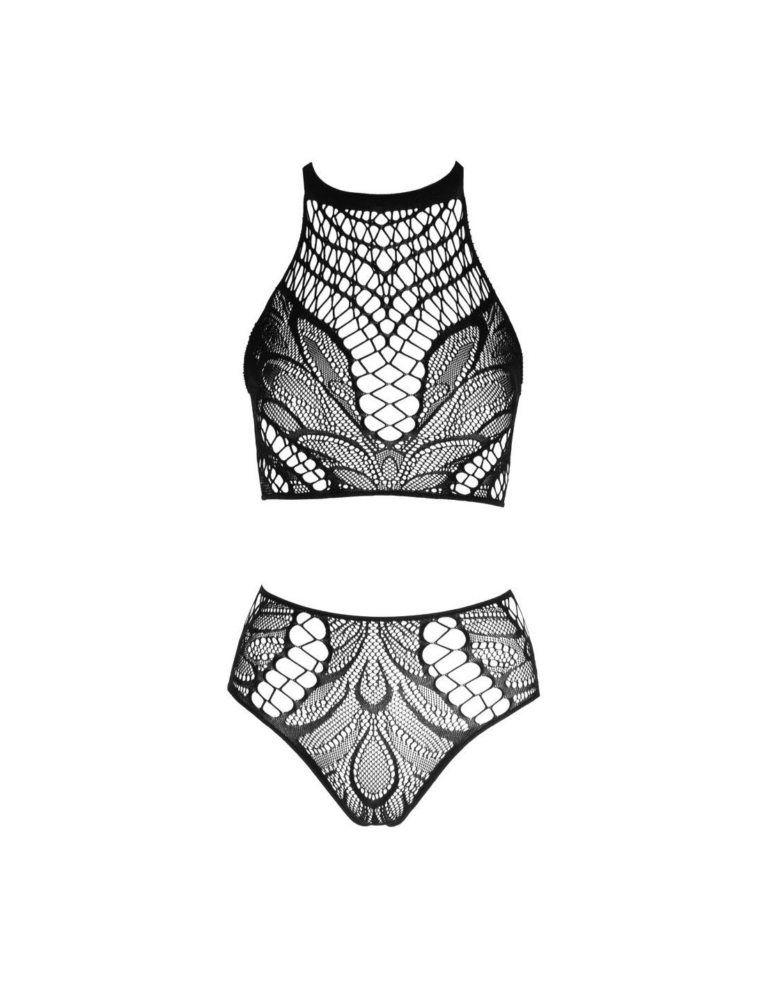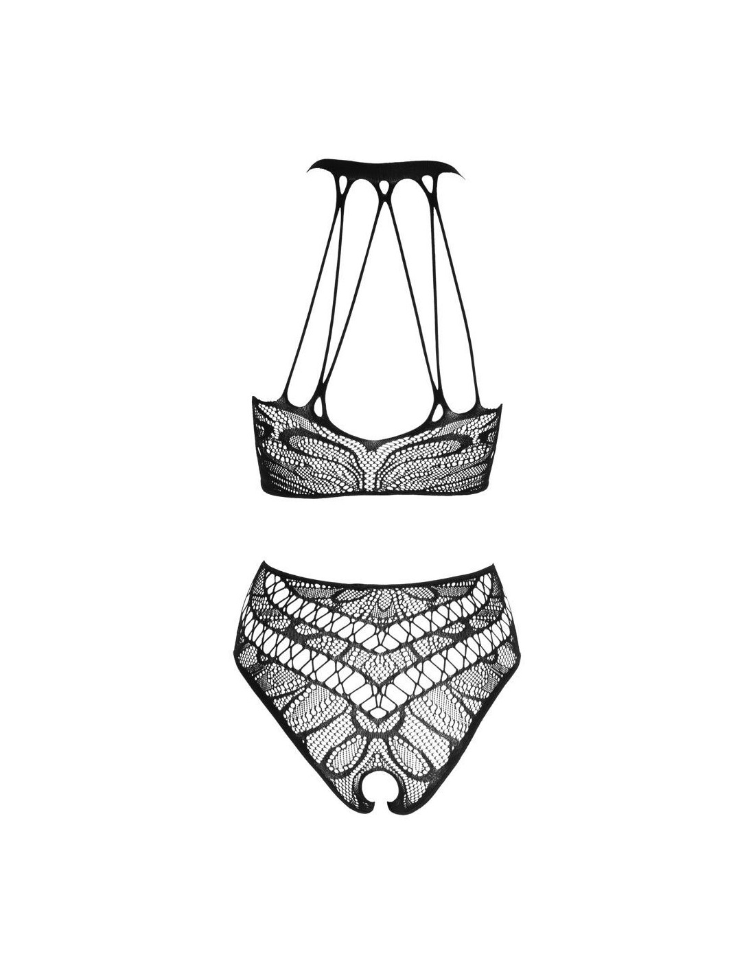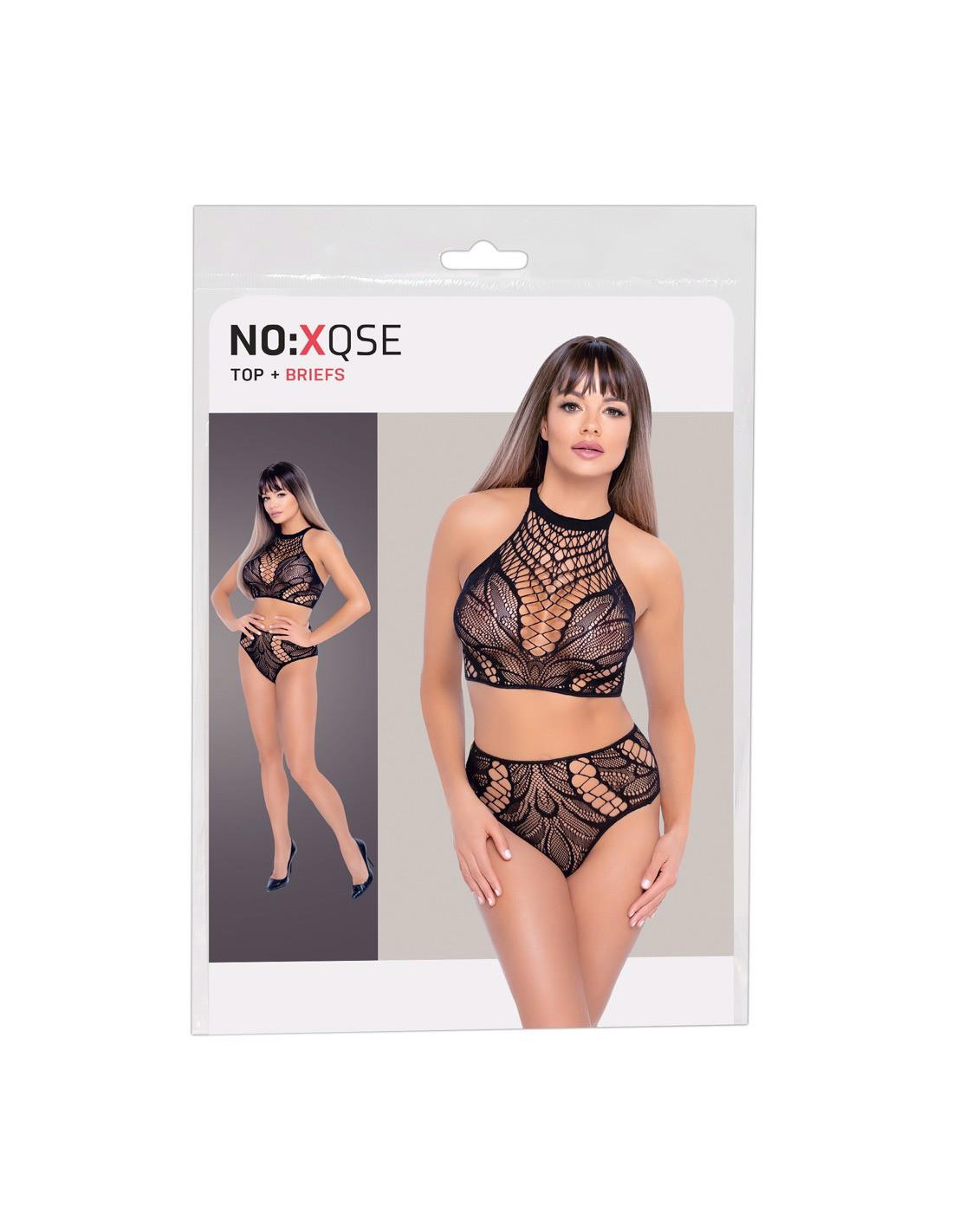 Top i figi bez krocza marki NO:XQSE o różnych strukturach siatki. Top z elastycznym paskiem na szyję, z tyłu elastyczne paski. Wysoko wycięte majtki z zapraszającym otwarciem w kroku. Wszystkie wykonane bezszwowo i bardzo elastyczne dla wyjątkowo przyjemnego komfortu noszenia.
