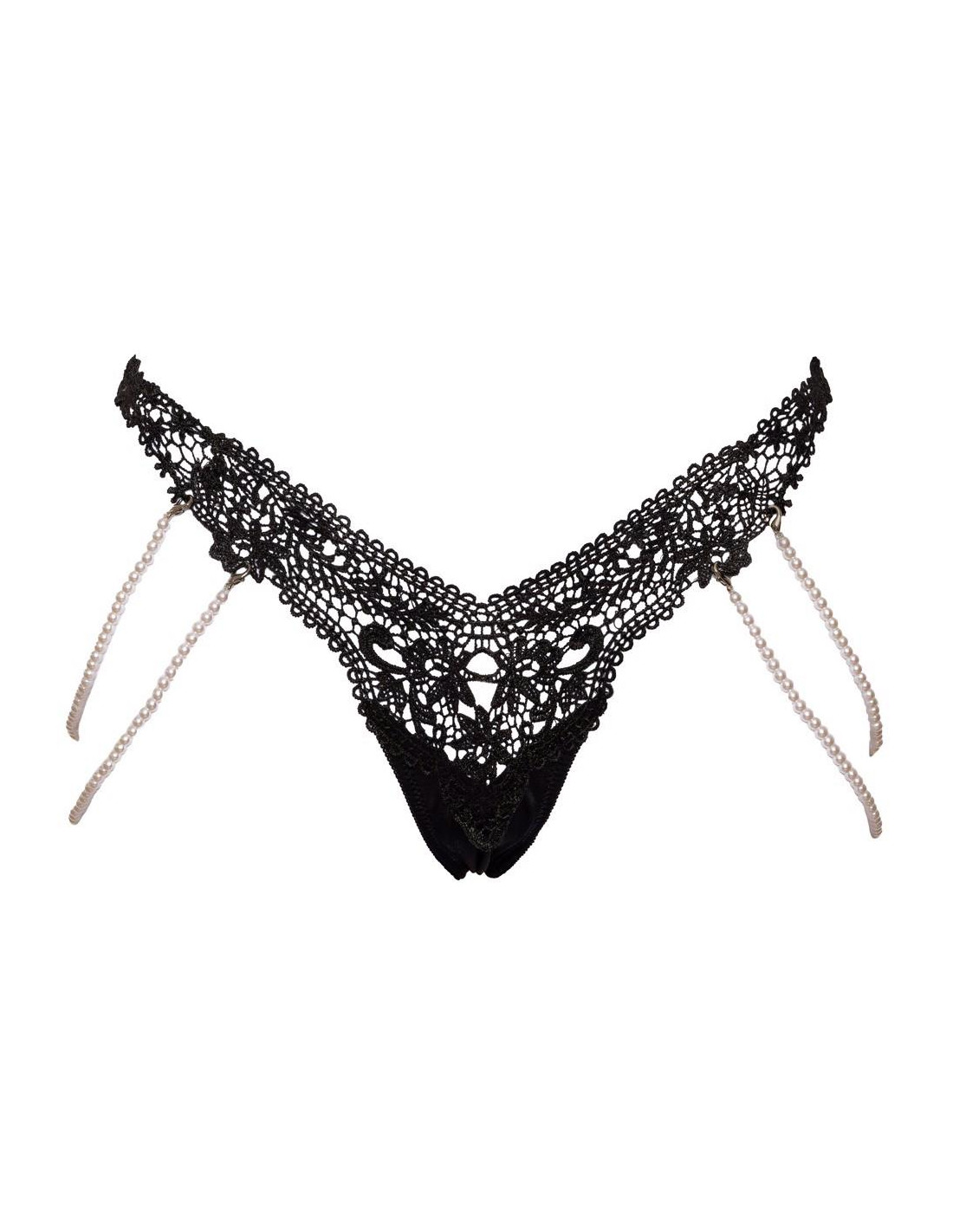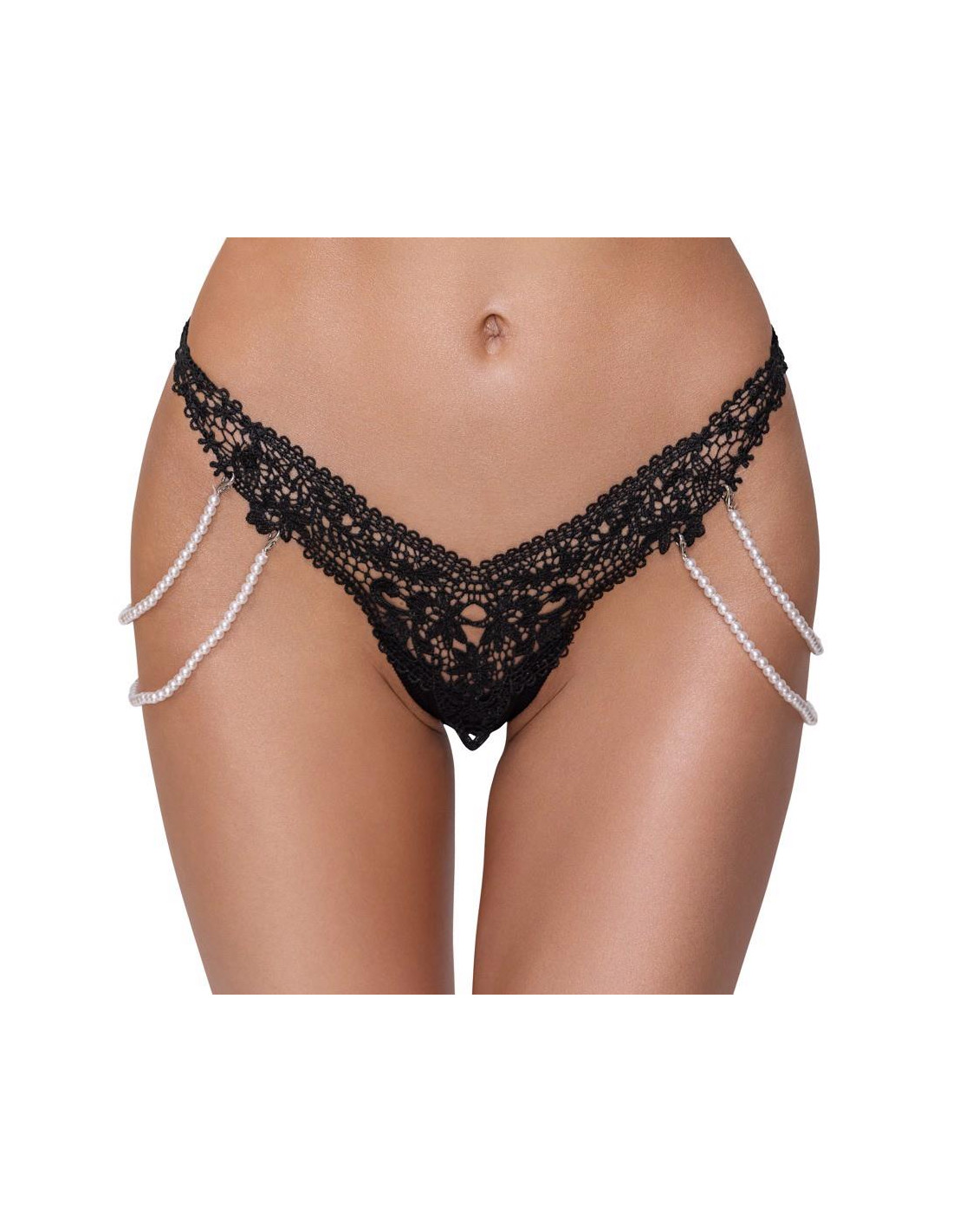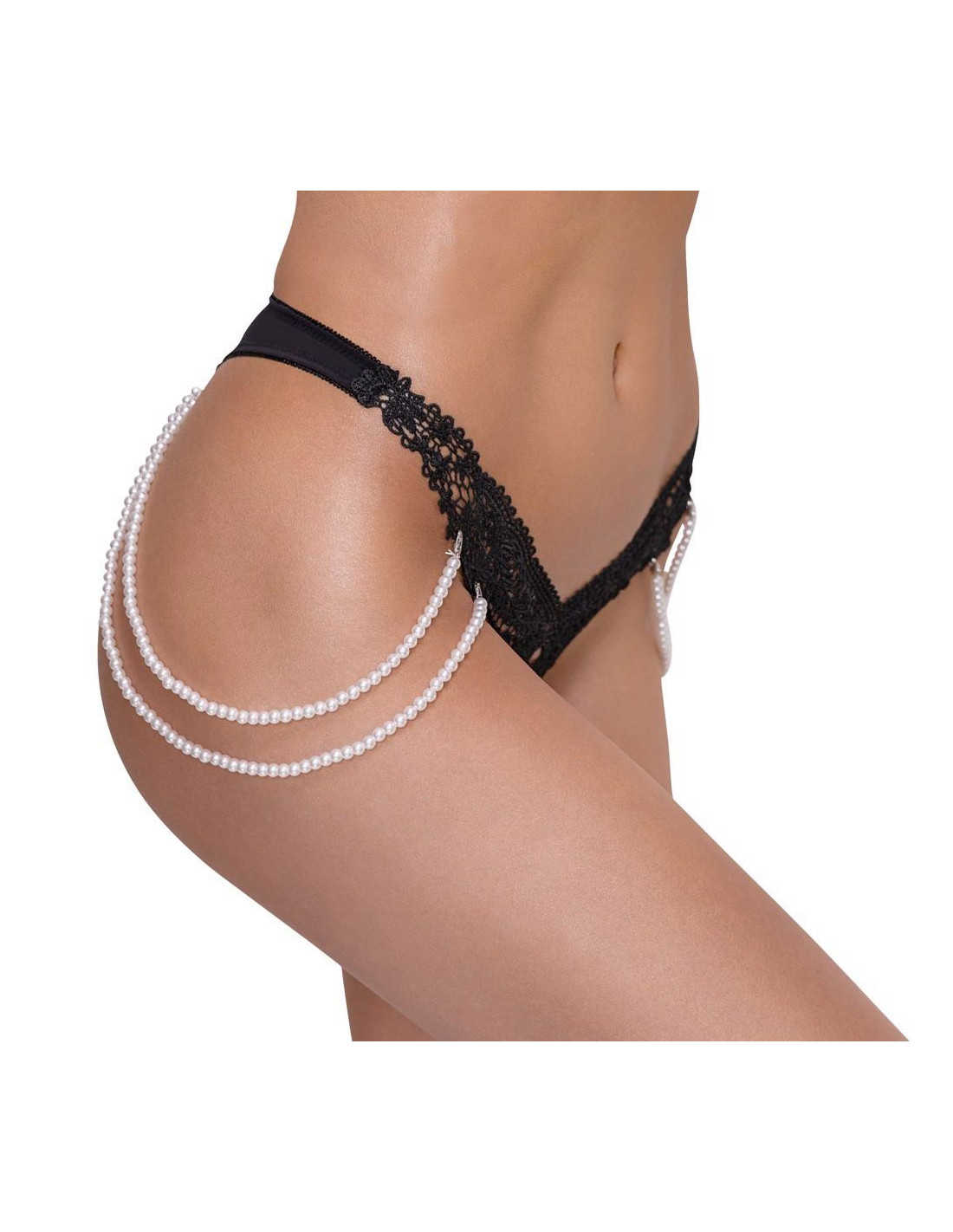 Cottelli CollectionStringi Rio marki Cottelli LINGERIE wykonane z cennej haftowanej koronki (przód) połączonej z elastycznym materiałem dopasowującym się do kształtu ciała. Po obu stronach elastyczny podwójny łańcuch z pereł, który można całkowicie odpiąć dzięki małym karabińczykom.