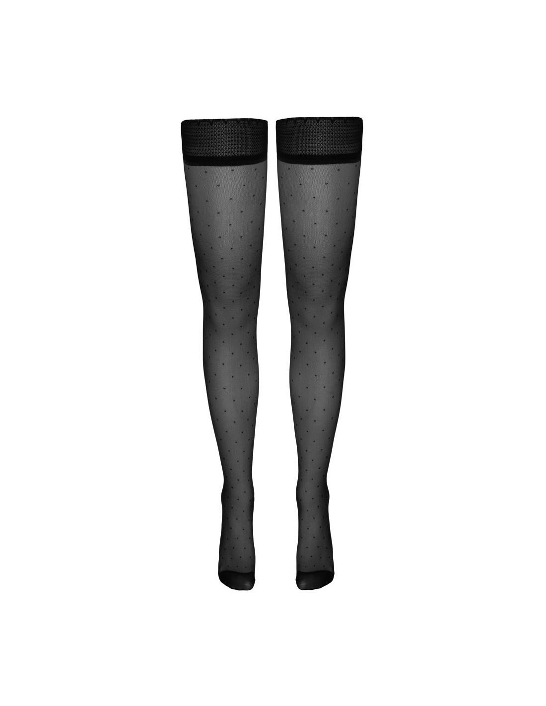 Pończochy typu hold-up z szerokim topem zachwycają zabawnie tkanymi kropkami. Silikonowa opaska od wewnątrz zapewnia pewne dopasowanie. Wzmocniona część palcowa. Certyfikat Oeko-Tex. 25 melina.