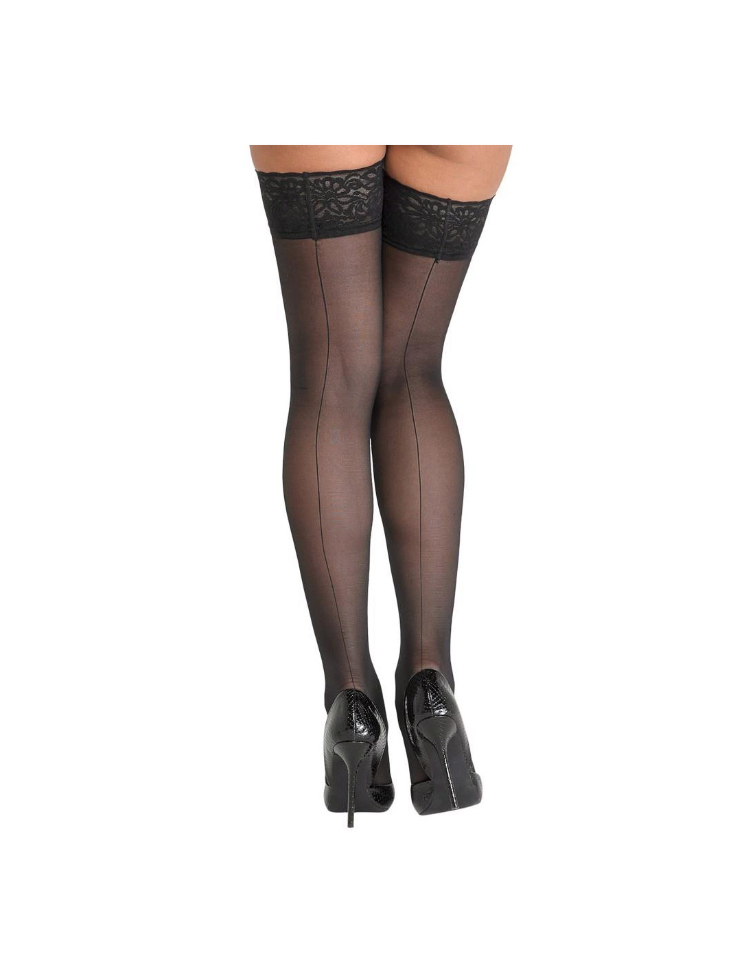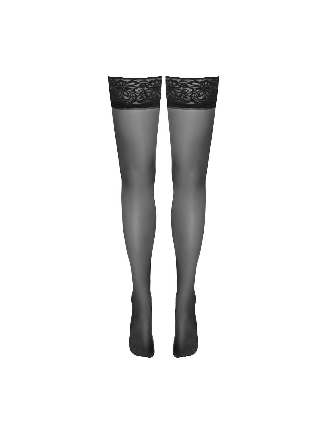 Black hold-up stockings by Cottelli LEGWARE with a stylish seam at the back and a beautiful 8 cm wide lace trim. Inside with silicone reinforcement for a non-slip fit and perfect support. Slightly preformed foot. Yarn weight 20 den. Oeko-Tex certified.