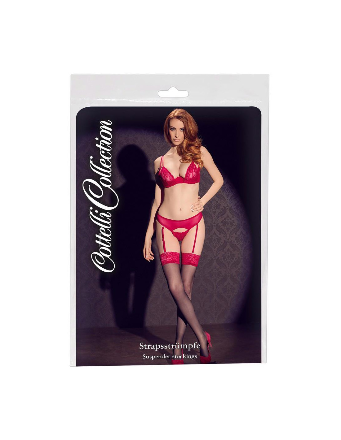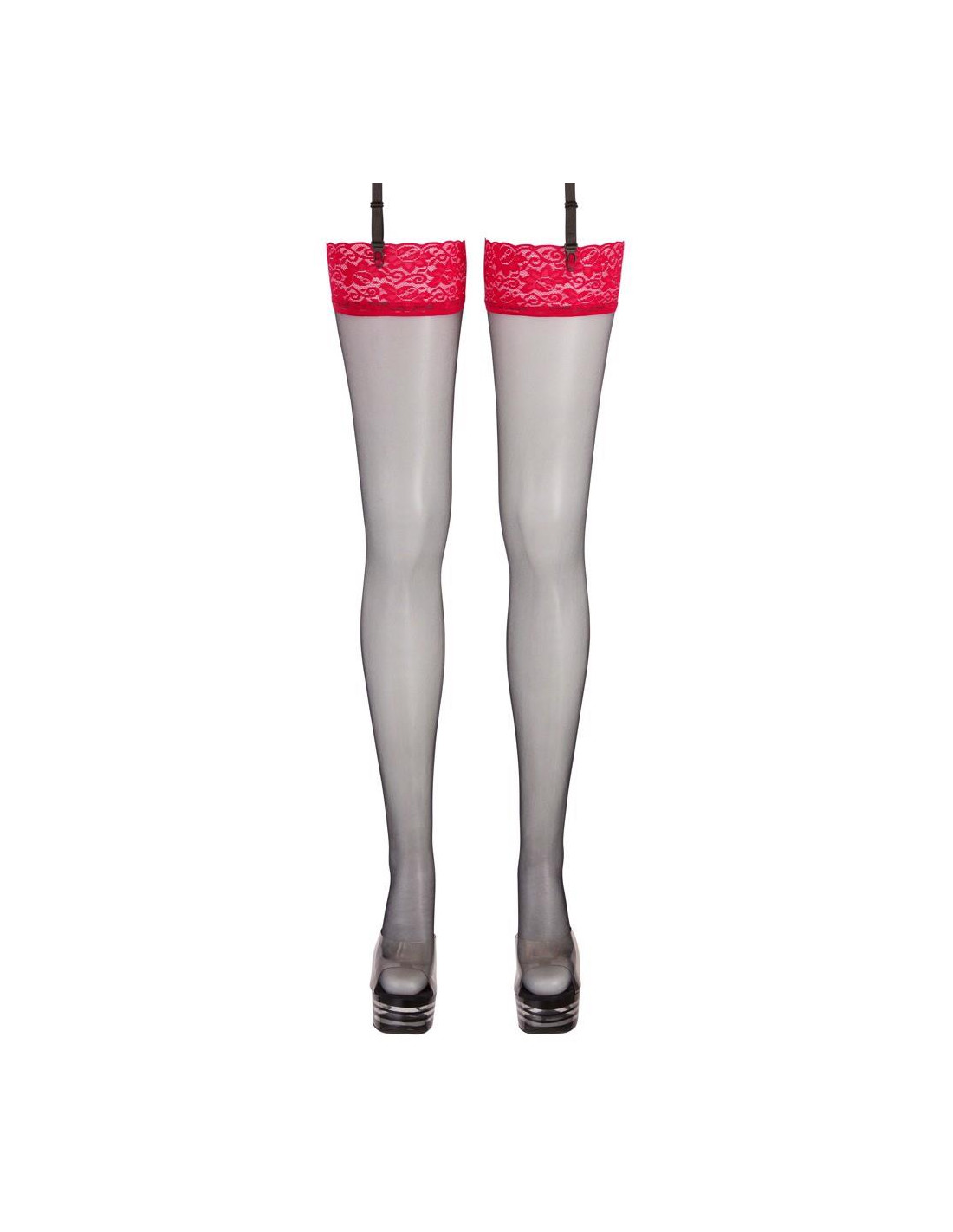 Zmysłowe pończochy do pończoch z czerwoną koronką do przypięcia. 20 den. Nieco wstępnie ukształtowana stopa. Certyfikat Oeko-Tex.