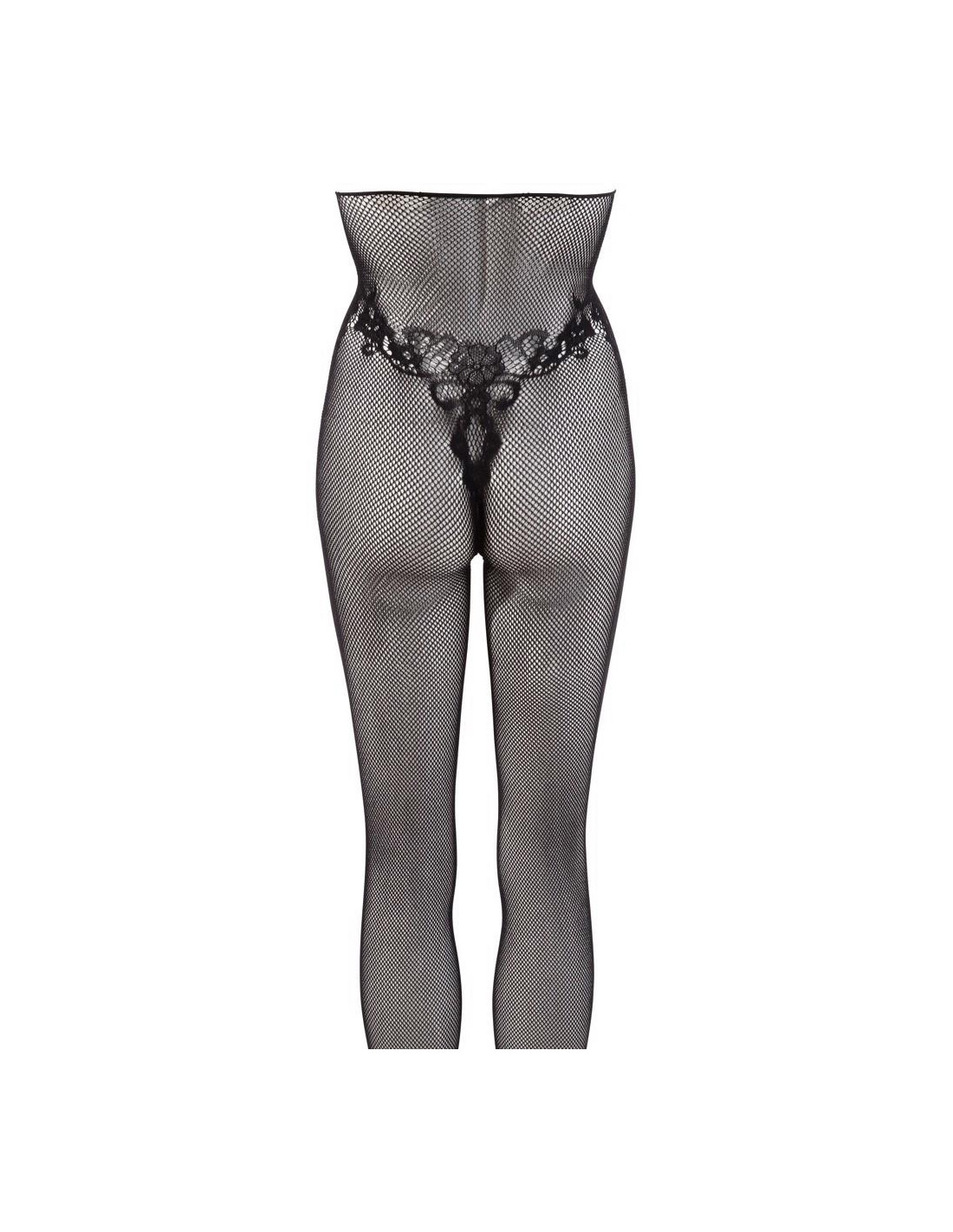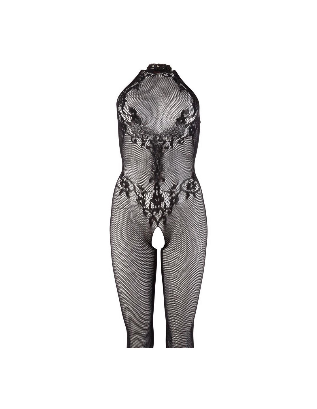 Halterneck catsuit o strukturze siatki z wplecionymi ornamentami o koronkowym wyglądzie. Wykonane bezszwowo i pięknie miękkie i elastyczne dla wysokiego komfortu noszenia. Otwarte w kroku. Ze stopą