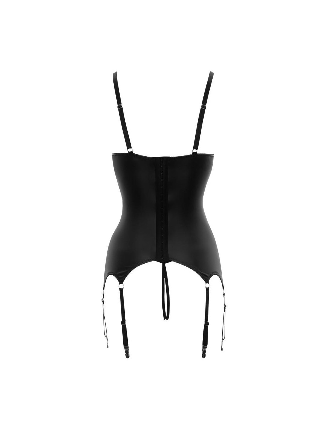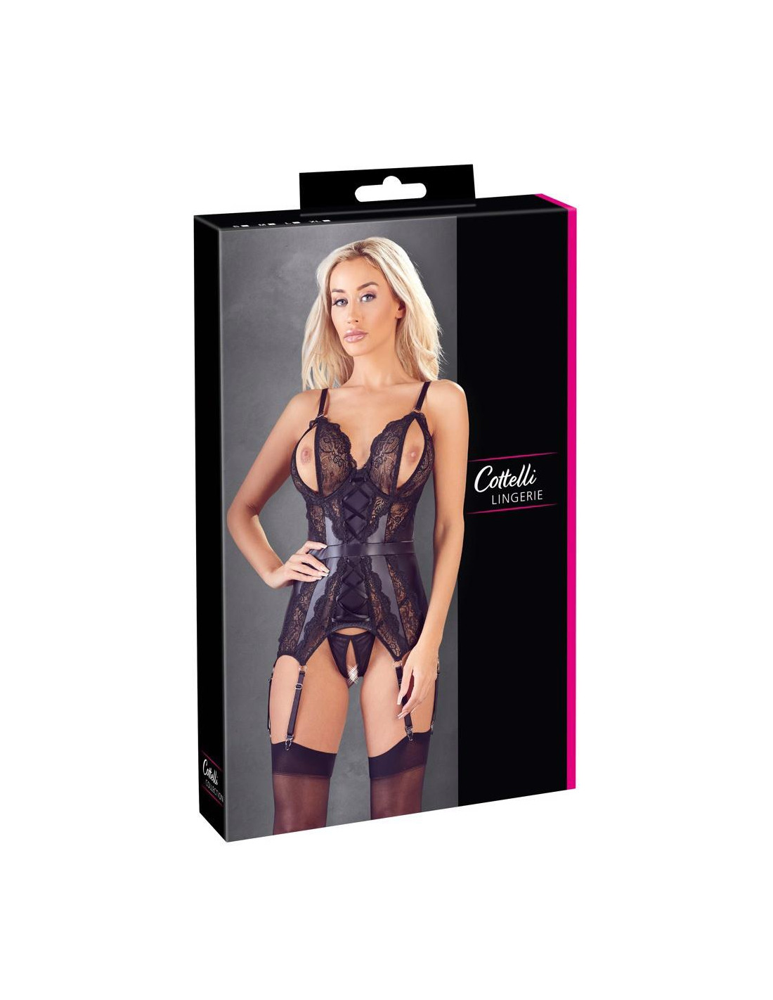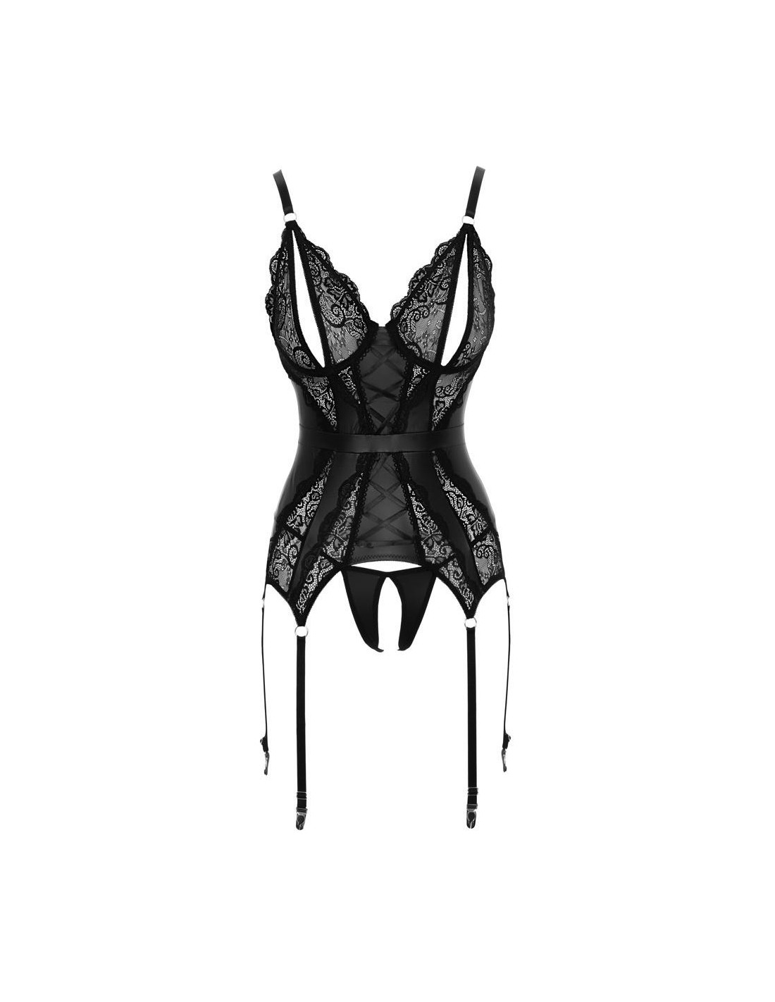 Uwodzicielska koszulka do podwieszania wykonana z matowej tkaniny z 3 regulowanymi uchwytami z każdej strony i miseczkami rozciętymi. Uroczo wykończone i z przodu z wyszukanymi koronkowymi wstawkami i ozdobnymi sznurowadłami. Wszyty pasek w talii podkreśla kobiece krągłości. Dołączony jest również pasujący ouvert strunowy. Bez pończoch.