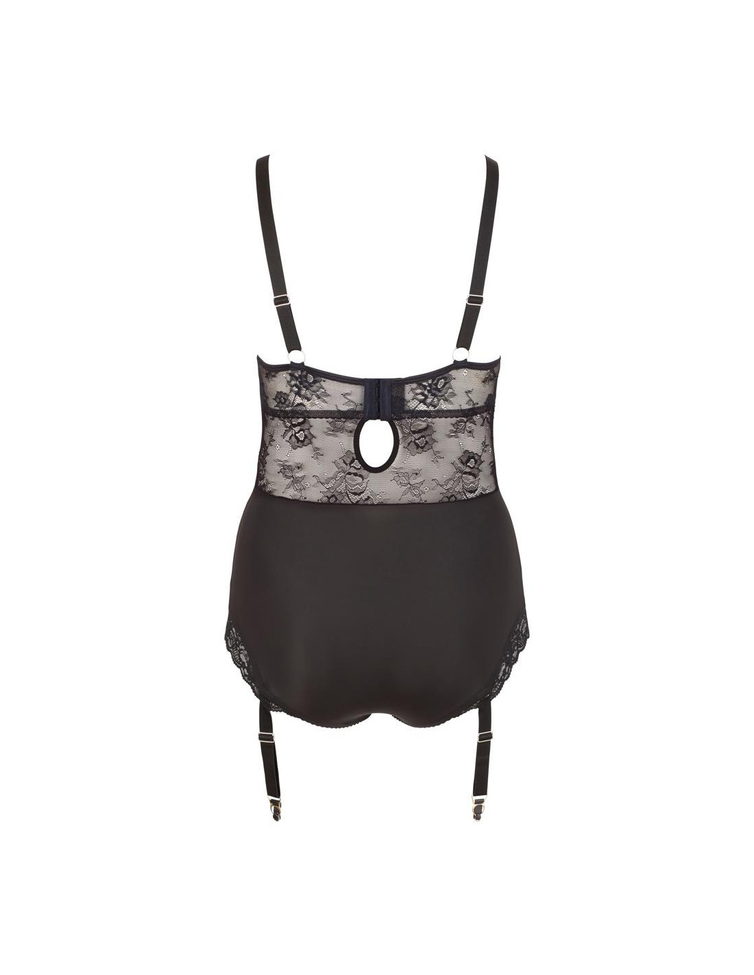 Body with semi-transparent floral lace inserts that go from the cleavage area right down to the crotch. There is also floral lace at the back. With a hook fastener at the back. With wide, comfortable, adjustable straps that have silver-coloured rings at the front. The body can be fastened with the press studs in the crotch area. Includes adjustable and removable suspender straps.
