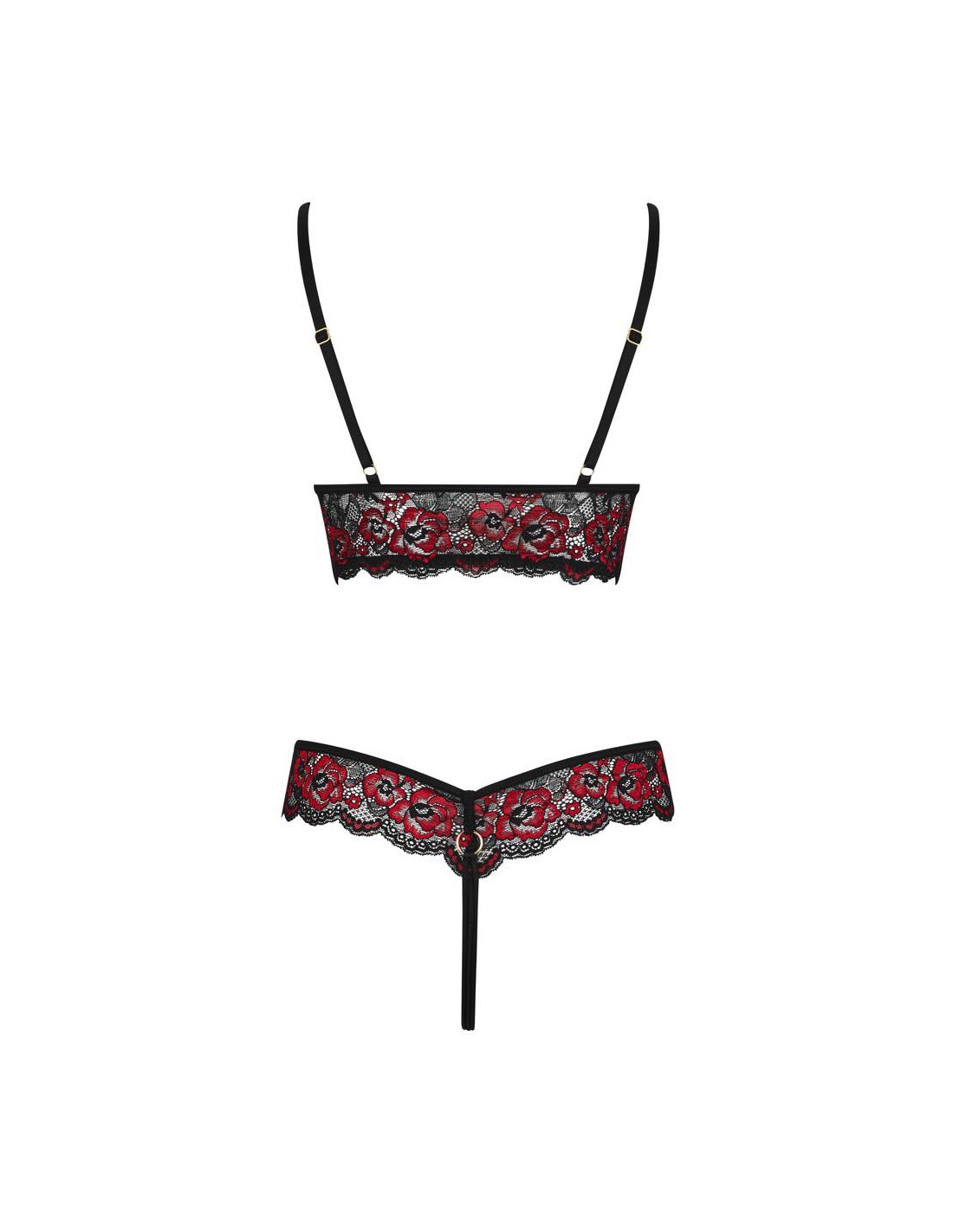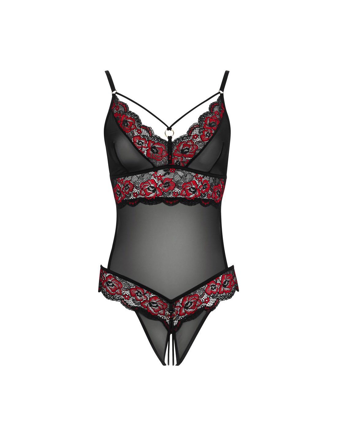 Body by Cottelli LINGERIE wykonane z dwukolorowej koronki o kwiatowym motywie w połączeniu z przezroczystym powernetem przy miseczkach i na brzuchu. Taśmy elastyczne z ozdobnymi pierścieniami przy dekolcie i w talii. Kusząco otwarte krocze. Dwuczęściowy tył. Regulowane paski dla idealnego dopasowania.