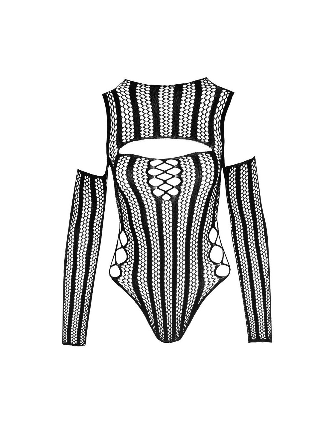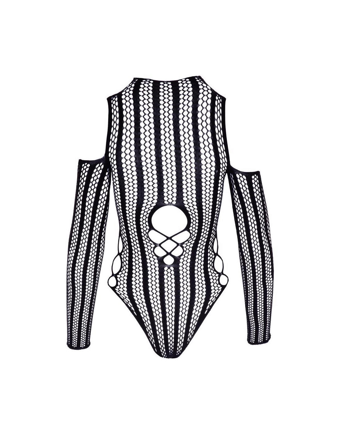 Miękkie i przytulne body z długim rękawem marki NO:XQSE o ciekawej strukturze siatki z wplecionymi paskami. Bezszwowa, okrągła dzianina i wysoka elastyczność zapewniają wyjątkowo przyjemny komfort noszenia. Ekscytująco off-the-shoulder, z wycięciem i grubą siateczką przy dekolcie i na plecach. Po bokach grube oczka. Z erotycznym i praktycznym zapięciem na zatrzaski w kroku.