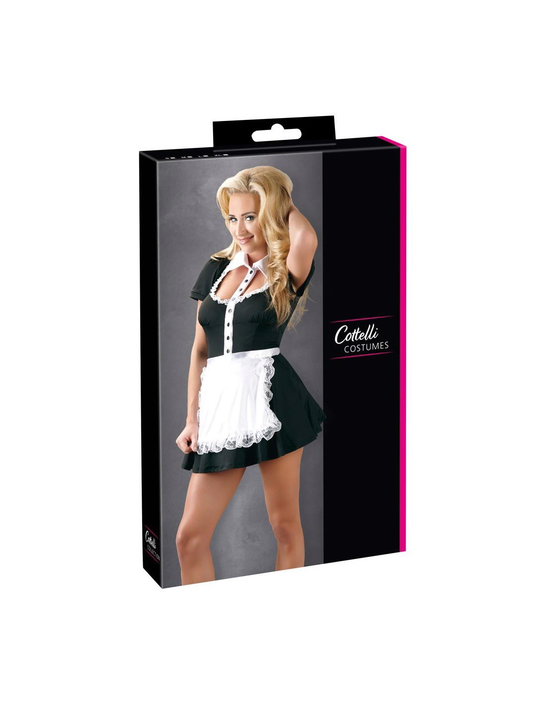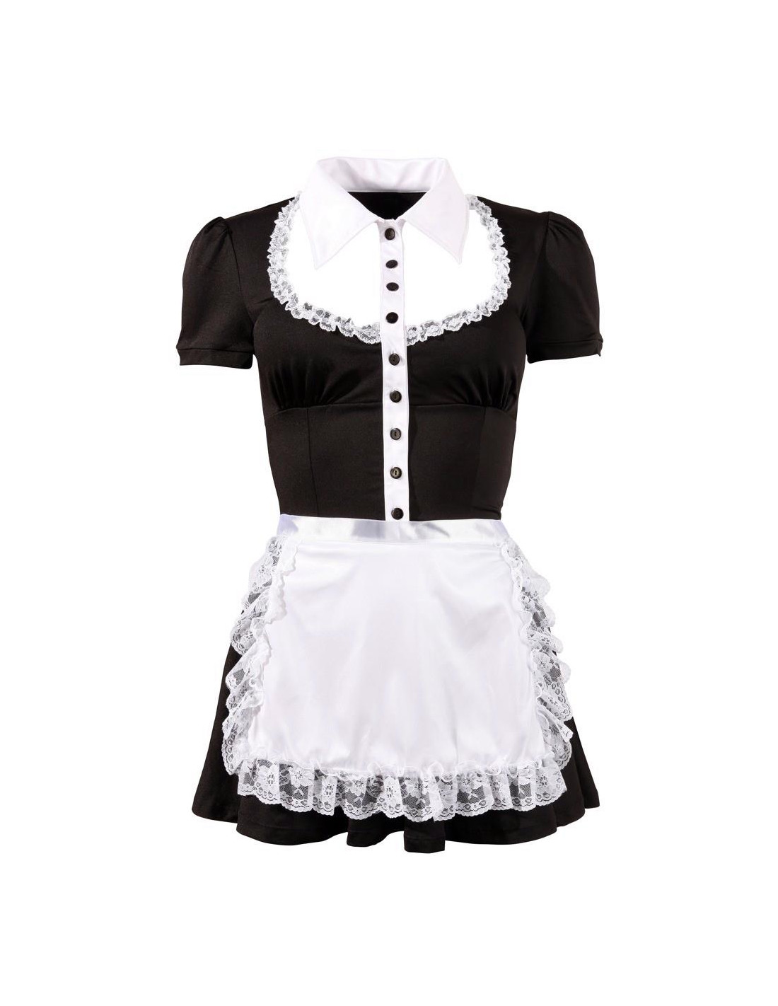 Urocza czarna sukienka mini z białym kołnierzykiem, zapięciem na guziki i falbanką przy dekolcie. Biały fartuch w komplecie, wiązany z tyłu.