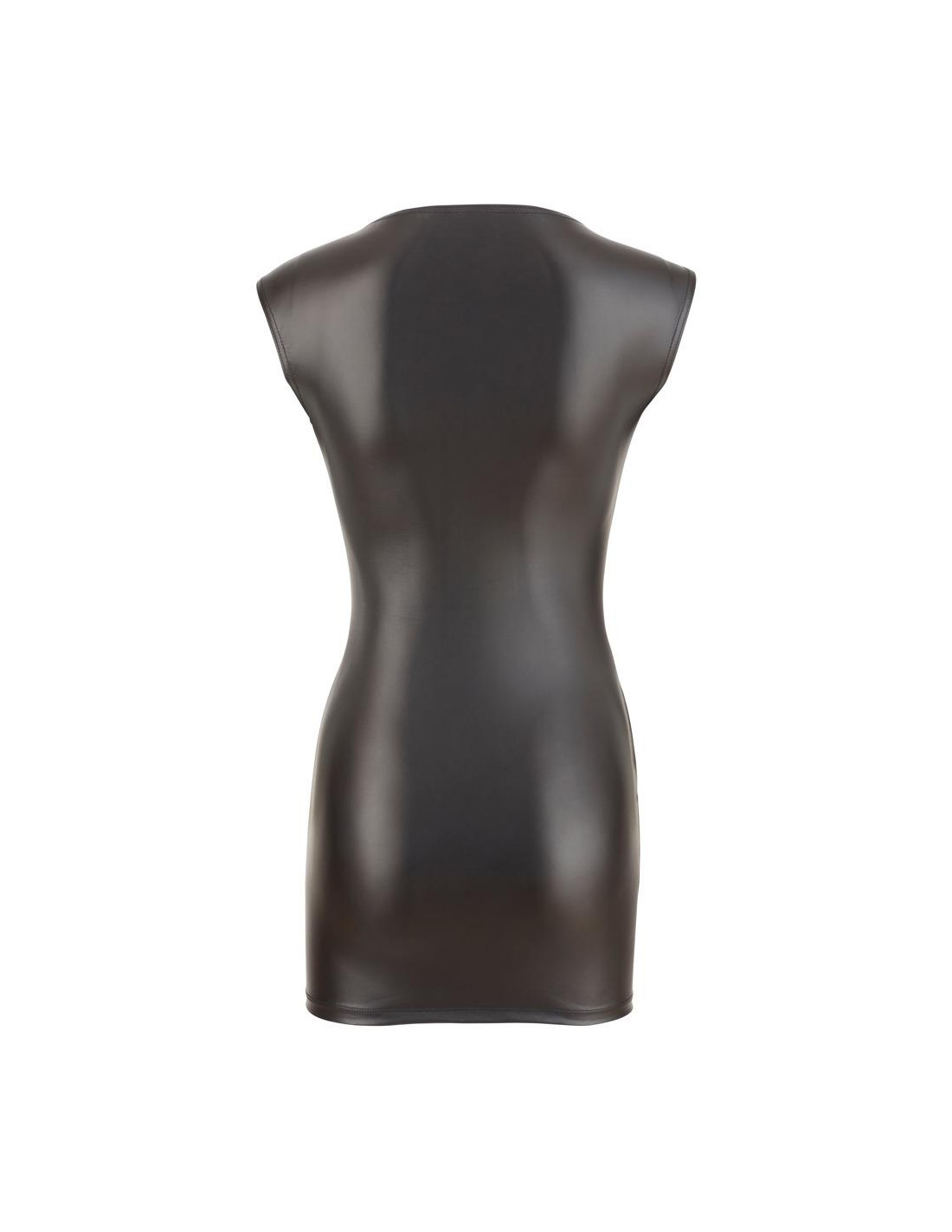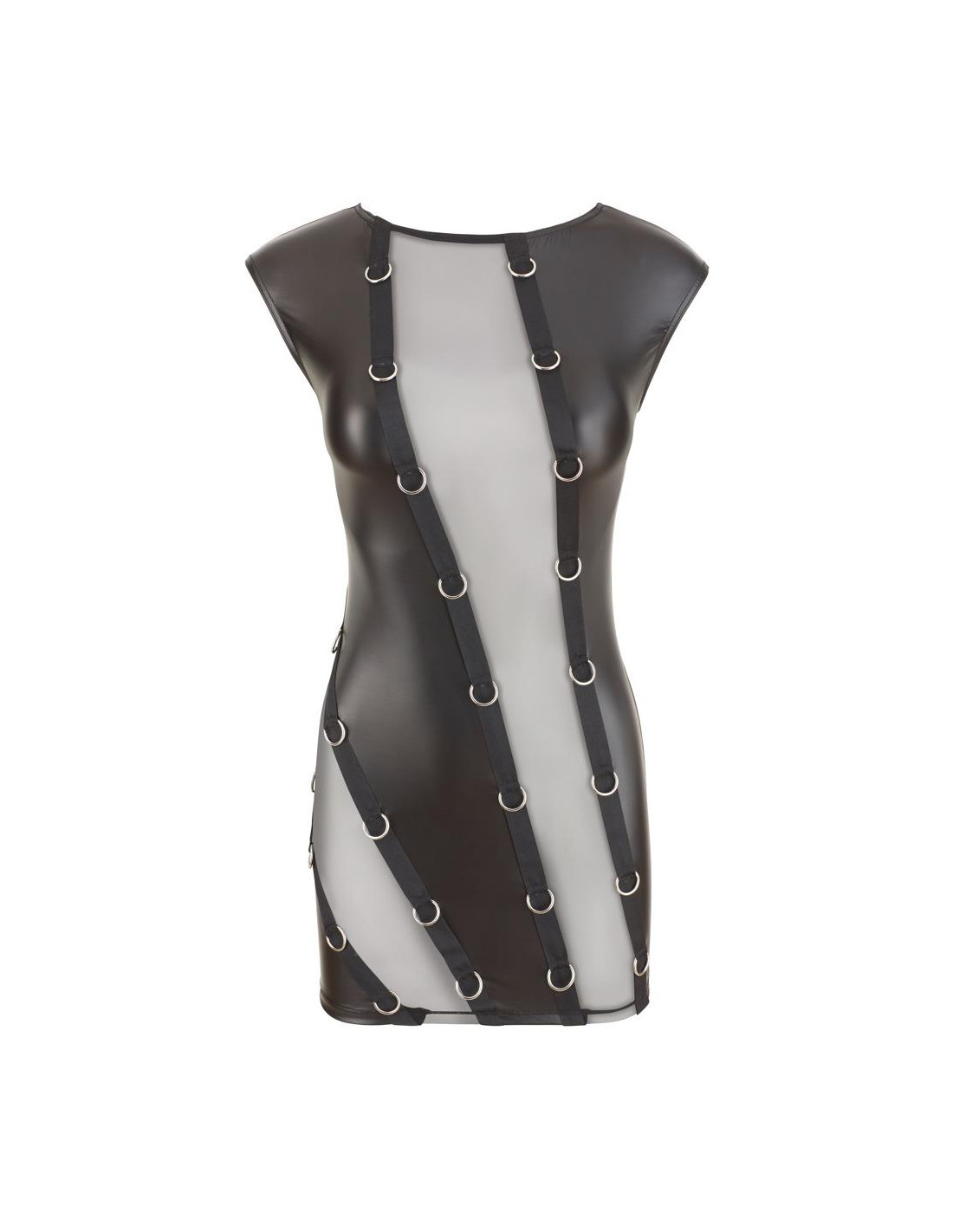 Is there really a dress that offers your partner cheeky glimpses of your body but still covers the main parts! Yes, that's exactly what this super sexy, sleeveless mini dress can do. It is made out of black wet look and its tight fit emphasises your seductive curves, while the fancy design at the front will take your partner's breath away. There are transparent powernet inserts at the front that provide a hot and cheeky view. The really thrilling parts of your body are covered up by matte look material which breaks up the diagonal strips of transparent material. The wet look material cleverly hides the nipples and intimate area – this means that your partner's fantasy can run wild. Another exciting detail is the numerous silver-coloured rings on the black borders that go around the transparent material.