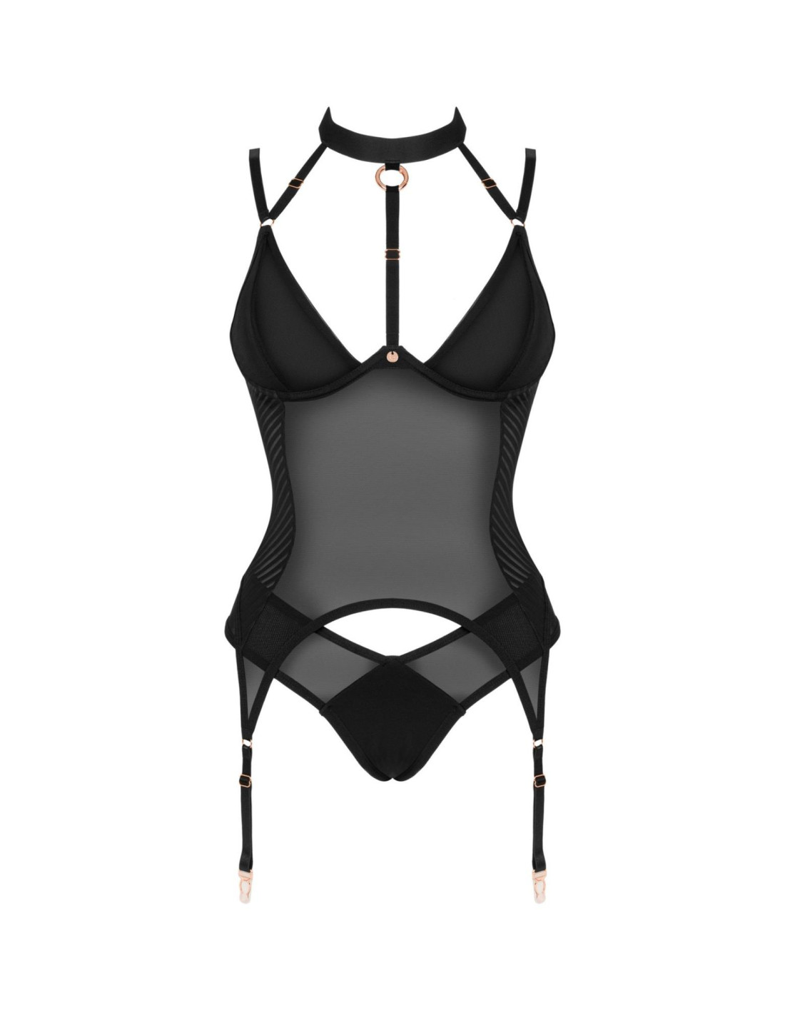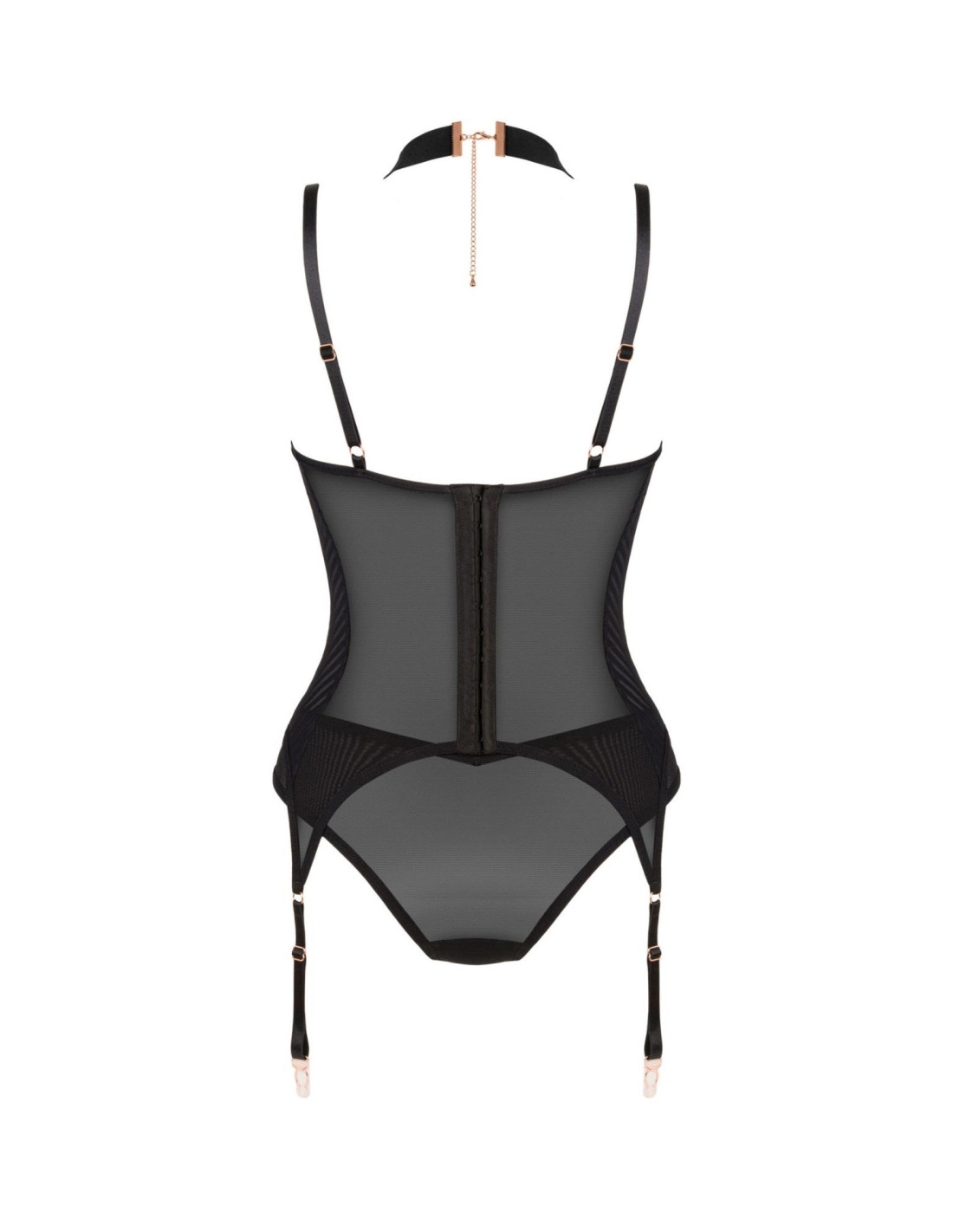 Idealnie wyeksponowany biust, pięknie wycięte, pasujące figi. Gorset z dodatkami w kolorze różowego złota, biżuteryjne zapinanie z tyłu szyi, odpinany pasek między piersiami. Noś go i uwódź tak, jak lubisz.