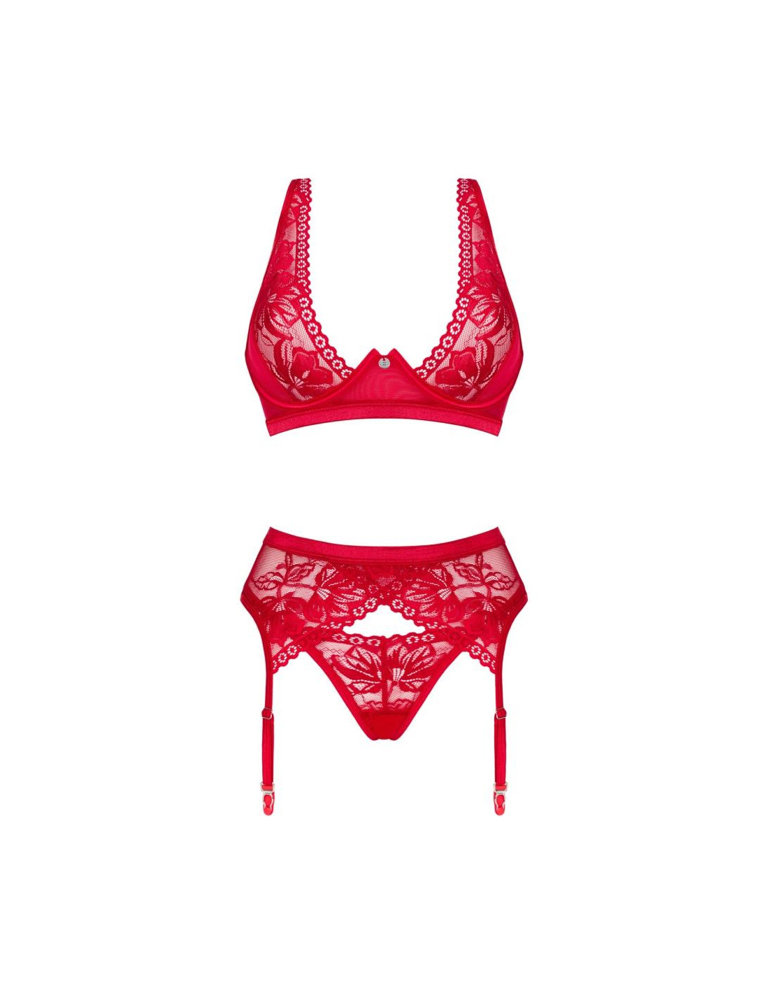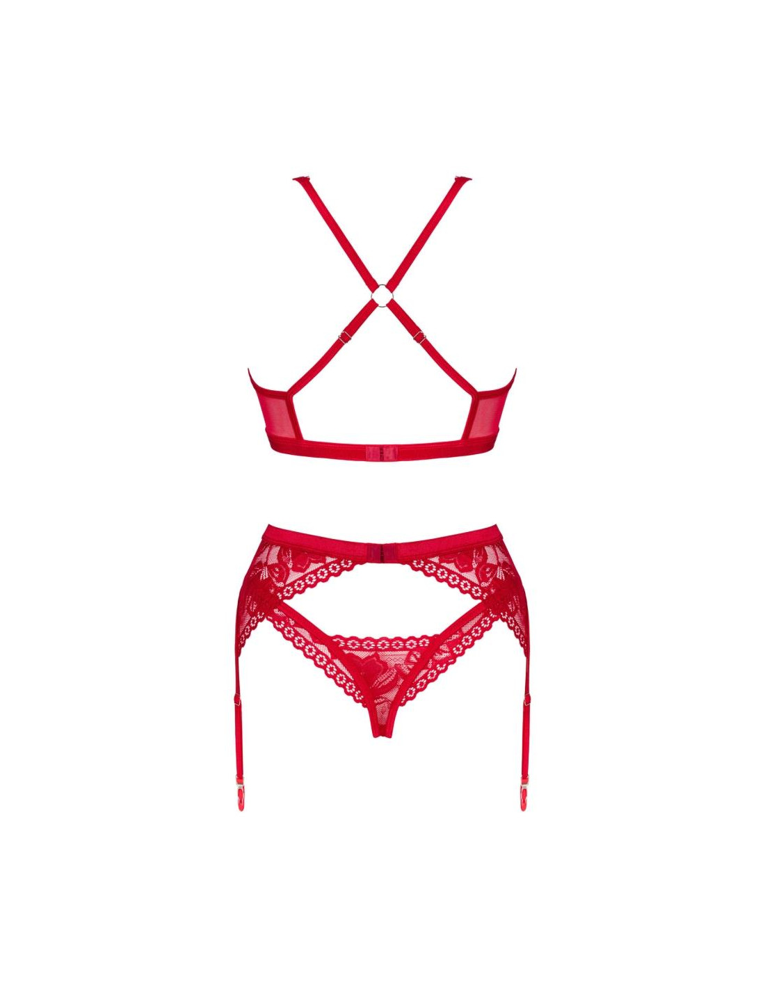 - trzyczęściowy czerwony komplet zawiera biustonosz, stringi i pas do pończoch