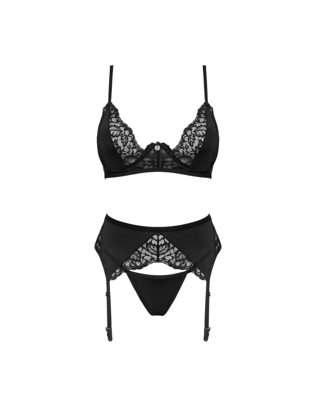 - zestaw w kolorze czerni składający się z pasa do pończoch, stringów oraz biustonosza