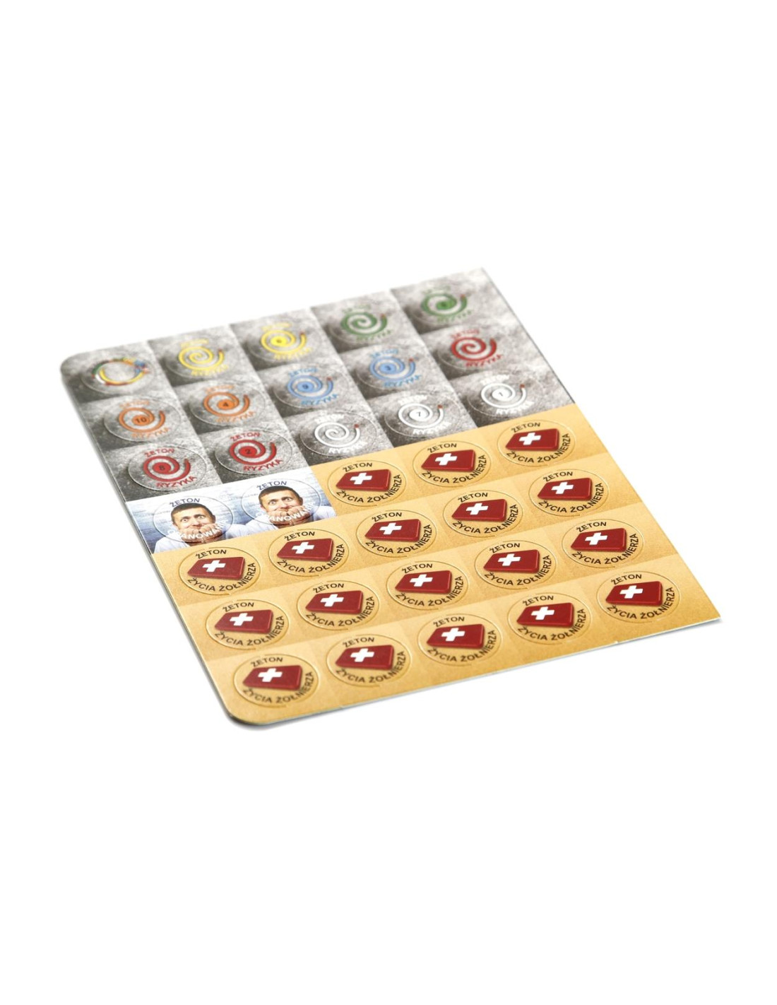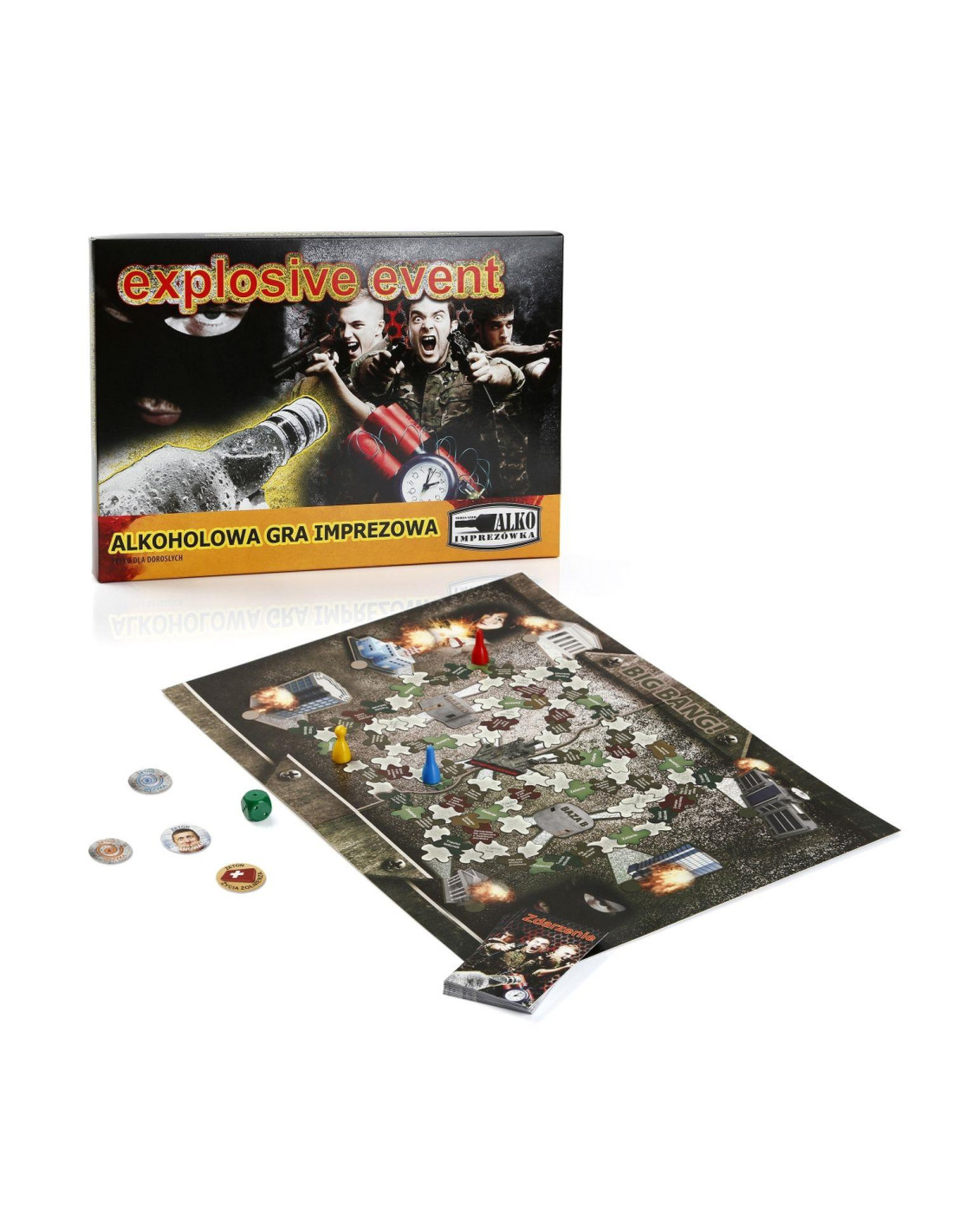 Co znajduje się w opakowaniu? - plansza BIG BANG!, - plansza UNEXPLODED RACE, - 24 karty zdarzeń, - 18 żetonów życia dla Żołnierzy, - 2 żetony opanowania dla Saperów, - 15 żetonów ryzyka dla Saperów, - 8 pionków, - kostkę, - zasady gry.